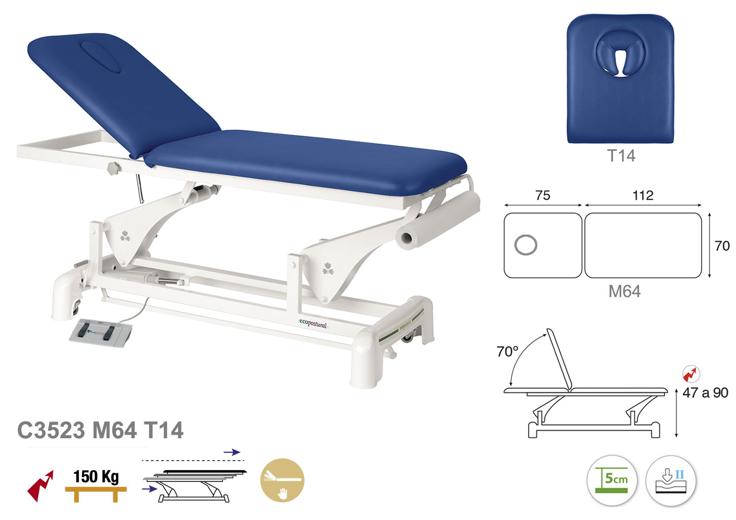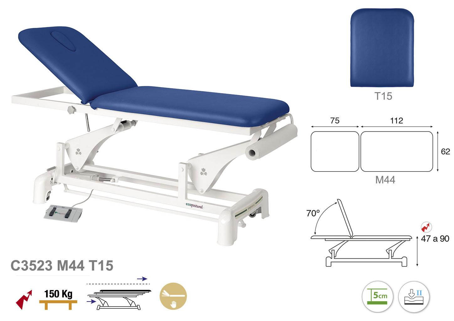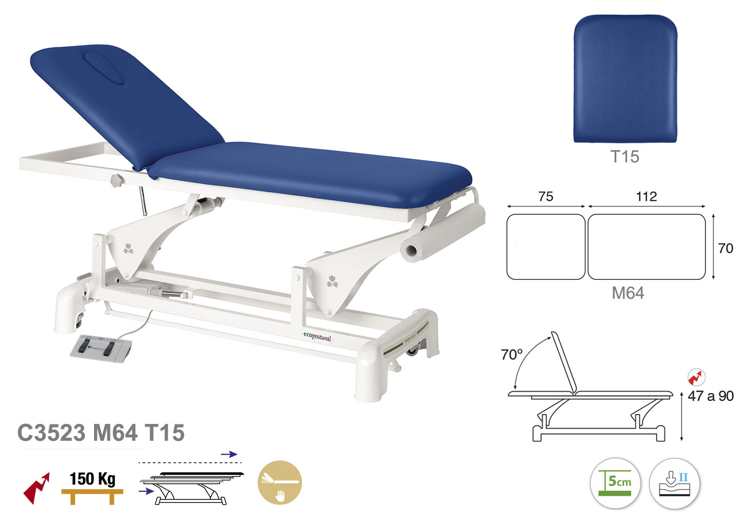 Camilla ecopostural eléctrica de dos cuerpos con estructura de biela blanca. Anchos disponibles: 62 cm y 70 cm. Largo 188 cm. Largo del cabezal: 75 cm, reclinable 70º de forma manual. Altura regulable entre 47 y 90 cm. Posee una firmeza media con espuma de 5 cm de grosor. Incluye portarrollos.