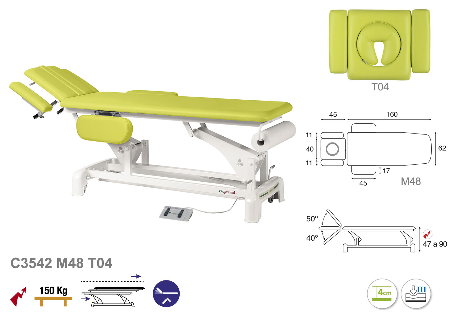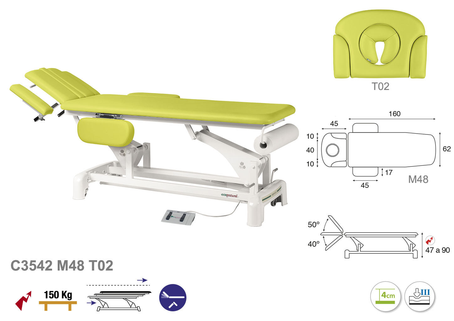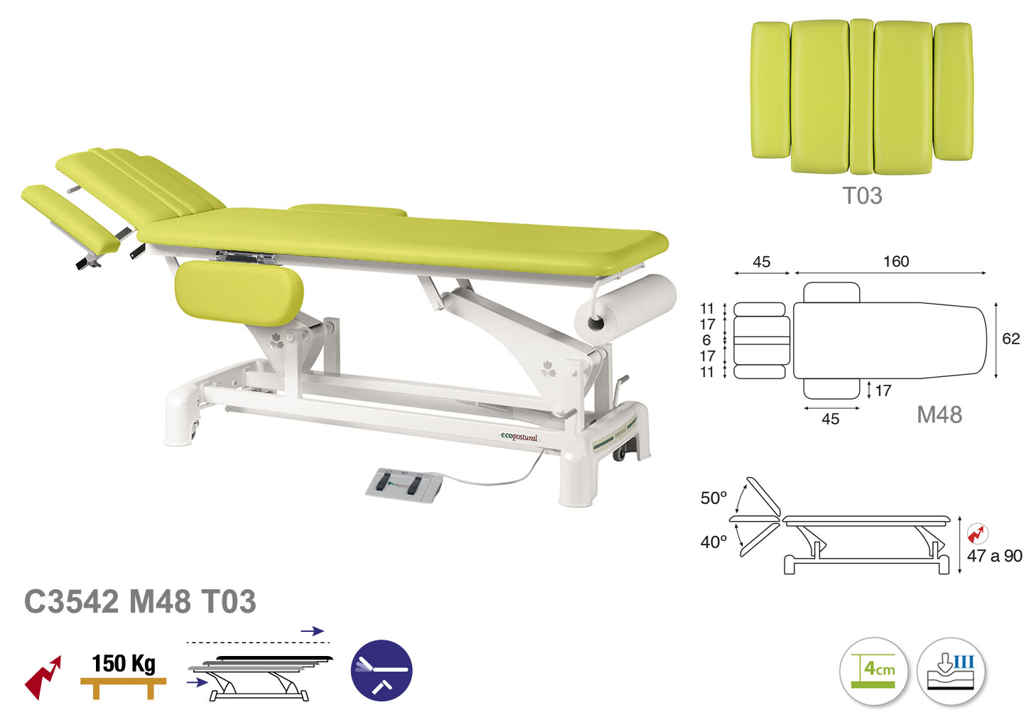 Camilla ecopostural eléctrica de dos cuerpos con estructura de biela blanca con reposabrazos. Ancho: 62 cm. Largo 207 cm. Largo del cabezal: 45 cm, reclinable 50º hacia arriba y 40º hacia abajo con sistema hidráulico. Altura regulable entre 47 y 90 cm con desplazamiento lateral. Posee una firmeza semidura y espuma de 4 cm de grosor. Incluye portarrollos.