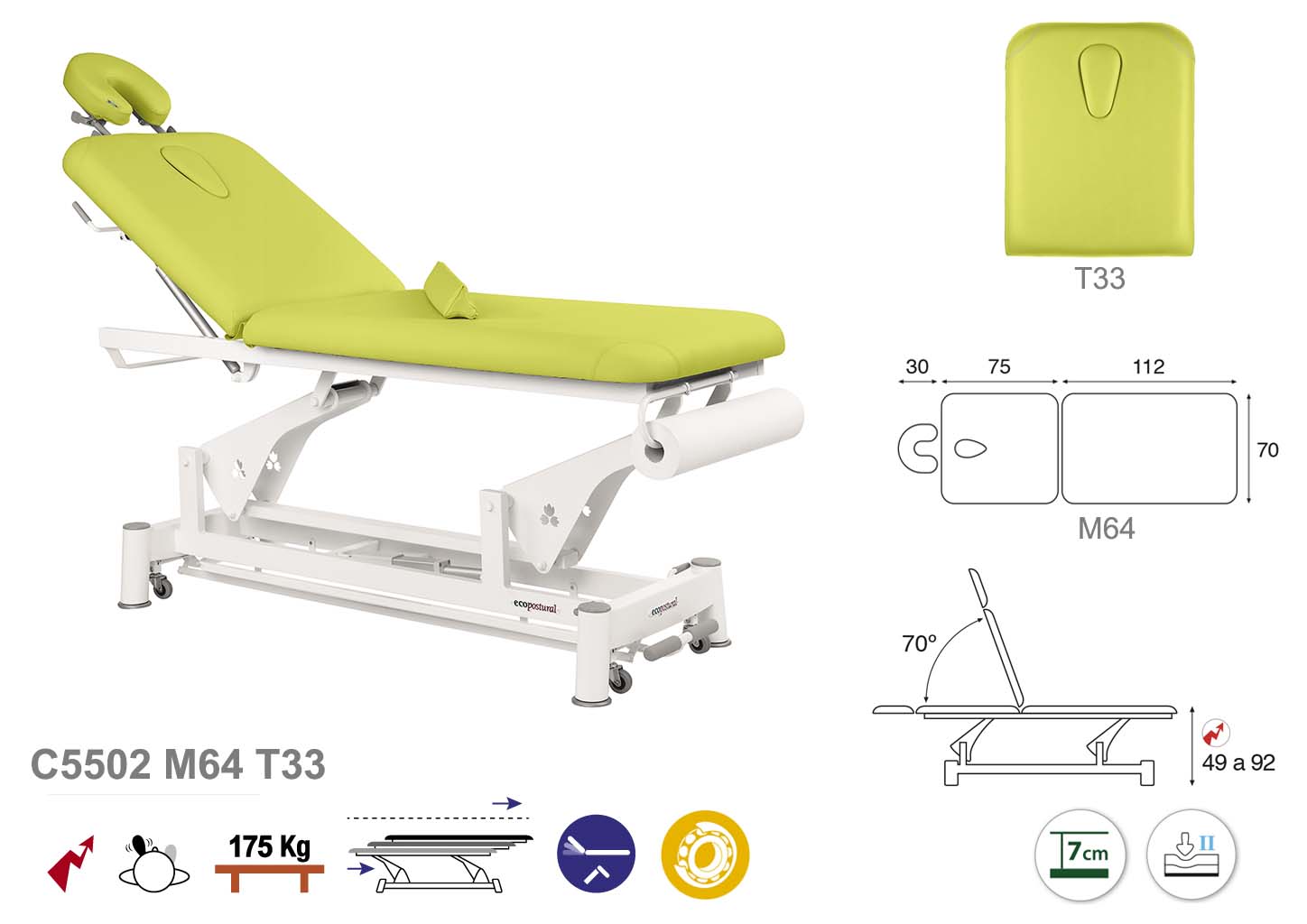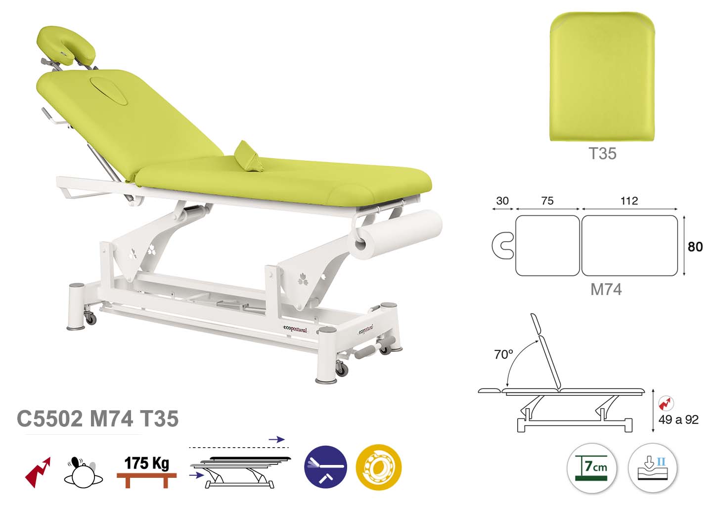 Camilla ecopostural eléctrica de dos cuerpos con estructura de biela blanca. Anchos camilla: 70 y 80 cm. Largo 188 cm. Largo del cabezal: 75 cm, reclinable 70º. Altura regulable entre 49 y 92 cm con desplazamiento latera. Posee una firmeza media con espuma de 7 cm de grosor. Incluye portarrollos. Control periférico.