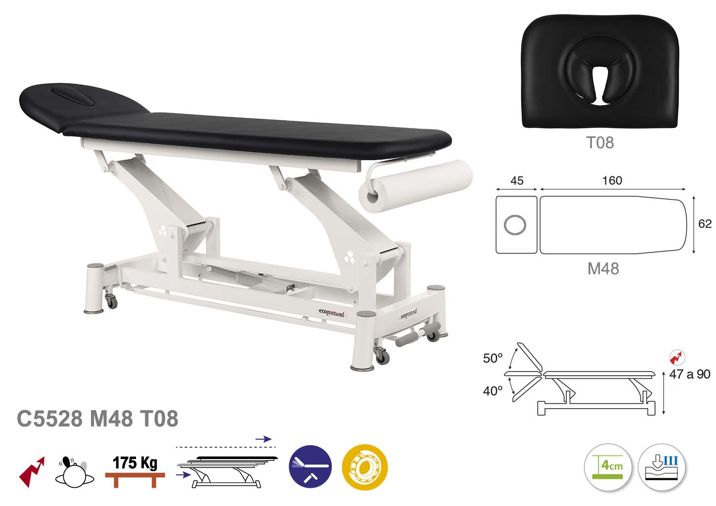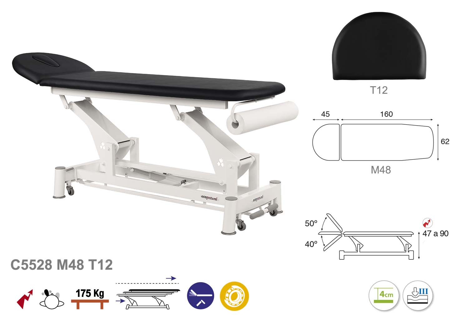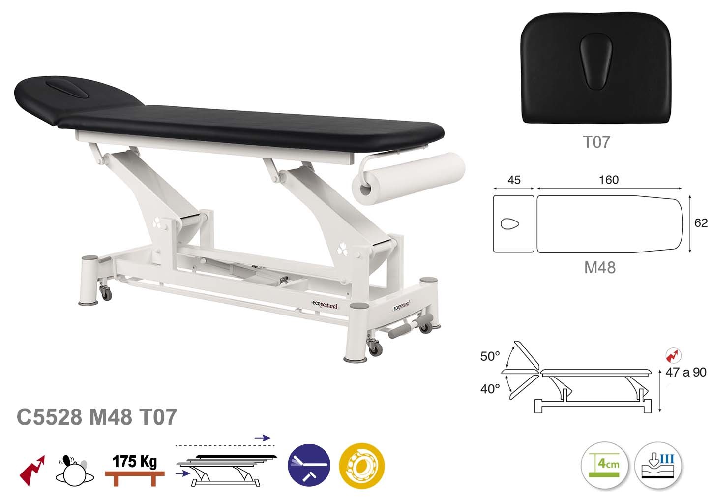 Camilla ecopostural eléctrica de dos cuerpos con estructura de biela blanca. Ancho: 62 cm. Largo 207 cm. Largo del cabezal: 45 cm, reclinable 50º hacia arriba y 40º hacia abajo con sistema hidráulico. Altura regulable entre 47 y 90 cm. Posee una firmeza semidura y espuma de 4 cm de grosor. Control periférico. Incluye portarrollos.