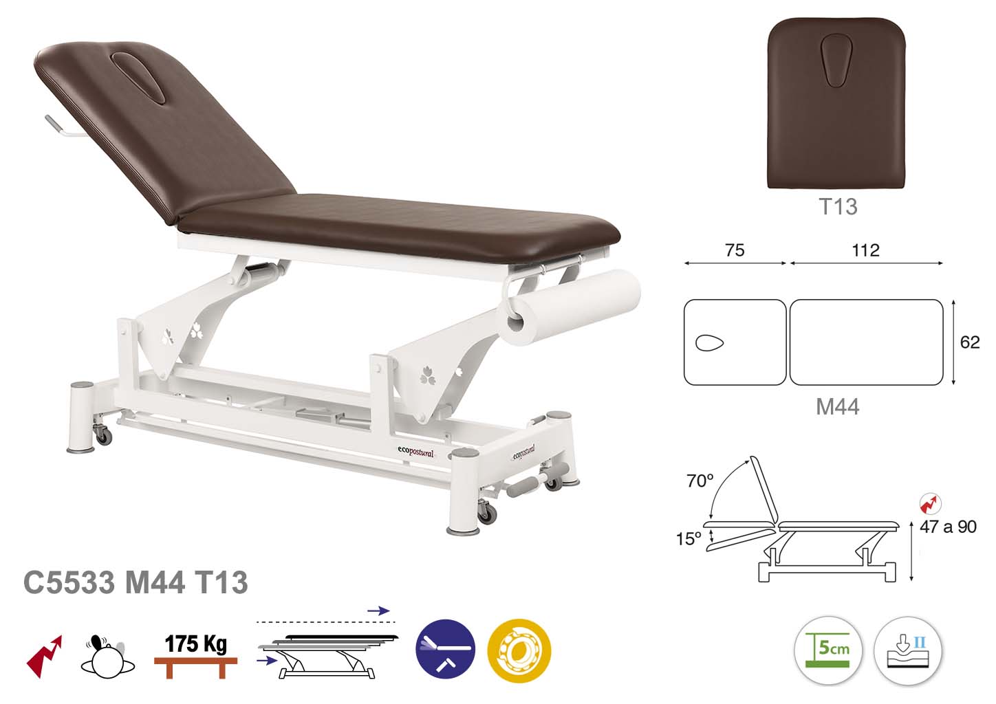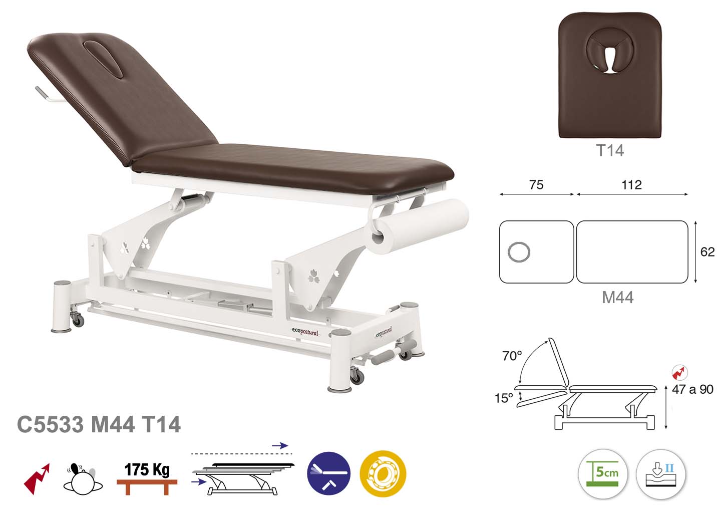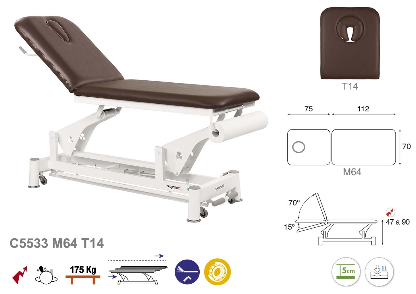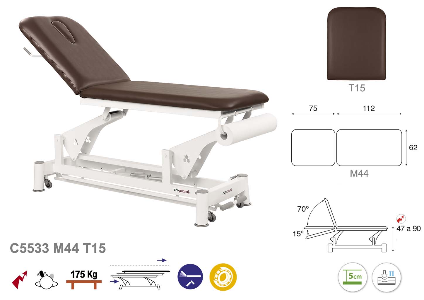 Camilla ecopostural eléctrica de dos cuerpos con estructura de biela blanca. Anchos disponibles: 62 cm y 70 cm. Largo 188 cm. Largo del cabezal: 75 cm, reclinable 70º hacia arriba y 15º hacia abajo con sistema hidráulico. Altura regulable entre 47 y 90 cm con desplazamiento lateral. Posee una firmeza media con espuma de 5 cm de grosor. Control periférico. Incluye portarrollos.