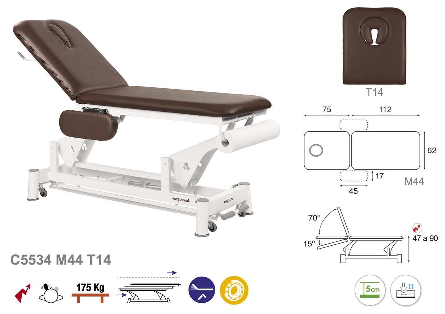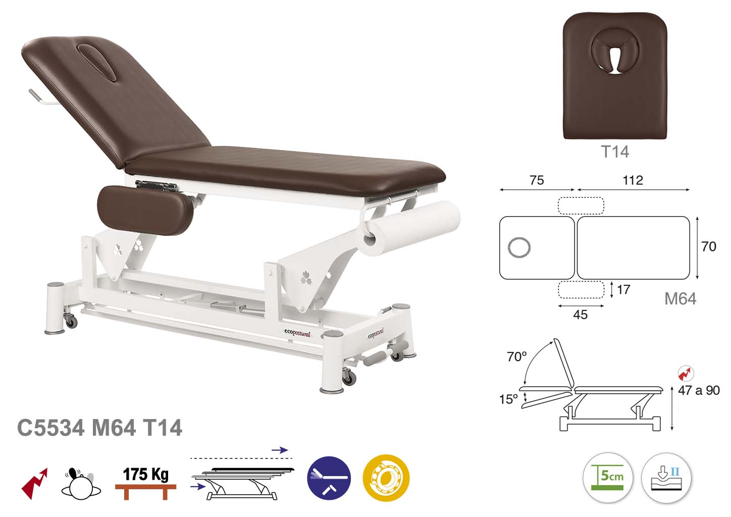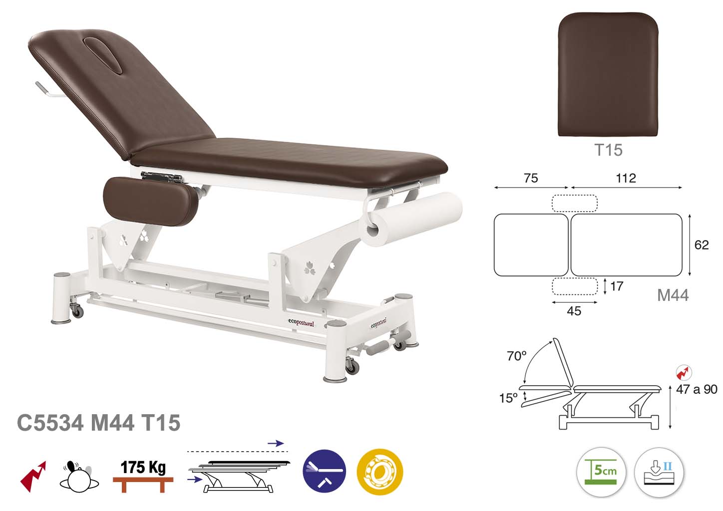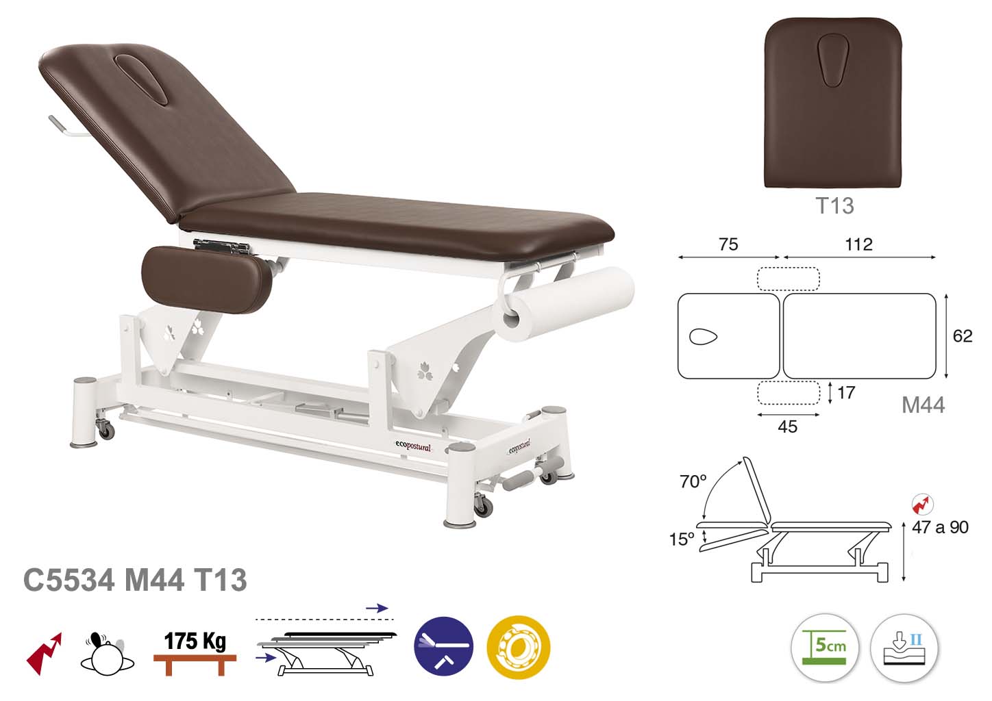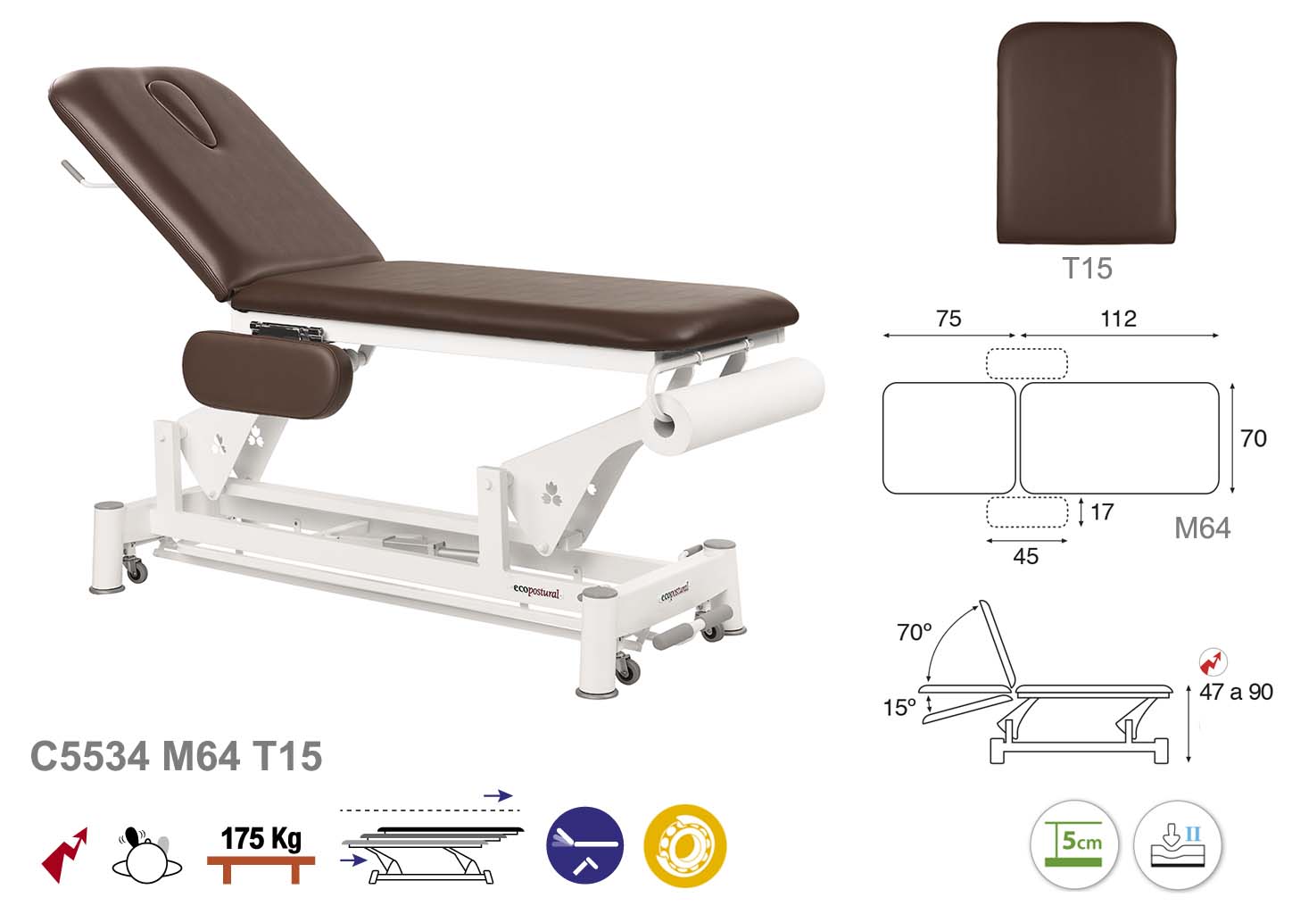 Camilla ecopostural eléctrica de dos cuerpos con estructura de biela blanca con reposabrazos. Anchos disponibles: 62 cm y 70 cm. Largo 188 cm. Largo del cabezal: 75 cm, reclinable 70º hacia arriba y 15º hacia abajo con sistema hidráulico. Altura regulable entre 47 y 90 cm con desplazamiento lateral. Posee una firmeza media con espuma de 5 cm de grosor. Control periférico. Incluye portarrollos.