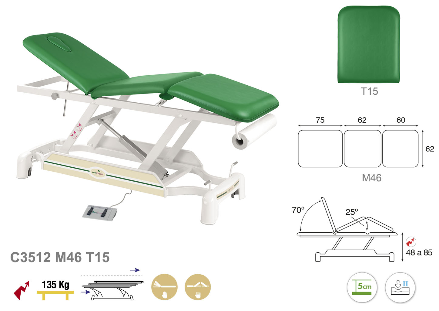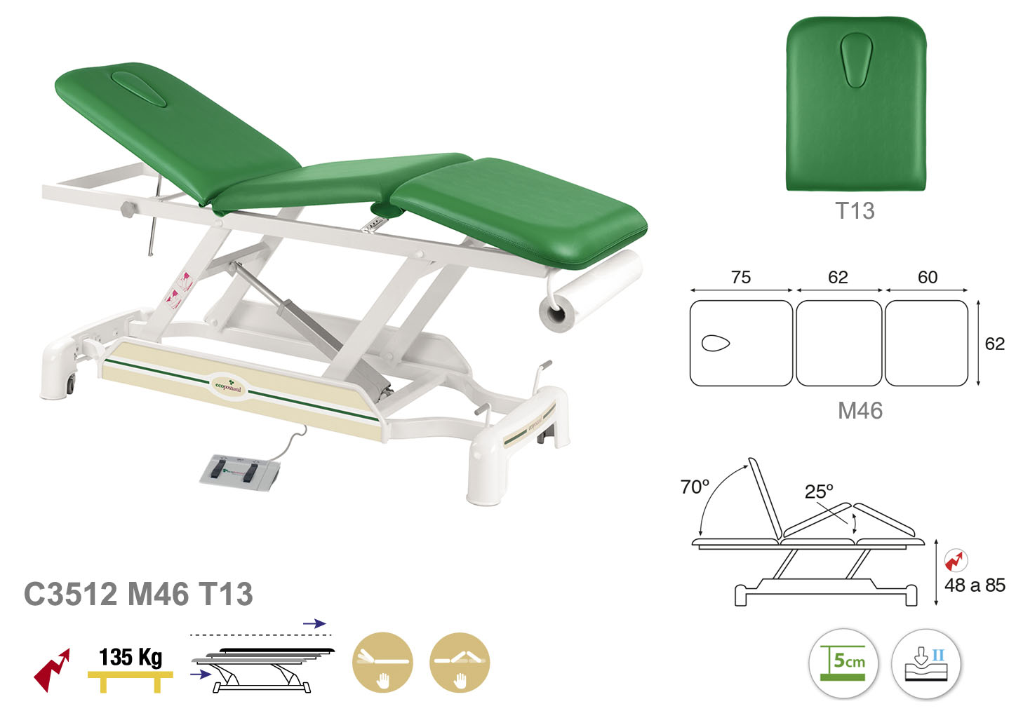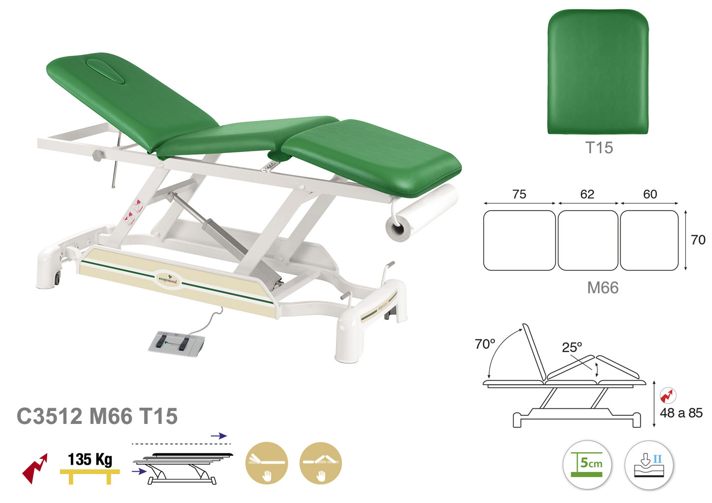 Camilla ecopostural eléctrica de tres cuerpos con estructura de biela blanca. Anchos disponibles: 62 cm y 70 cm. Largo 188 cm. Largo del cabezal: 75 cm, reclinable 70º de forma manual. Parte intermedia: reclinable 25 º de forma manual. Altura regulable entre 48 y 85 cm con desplazamiento lateral. Posee una firmeza media con espuma de 5 cm de grosor. Incluye portarrollos.