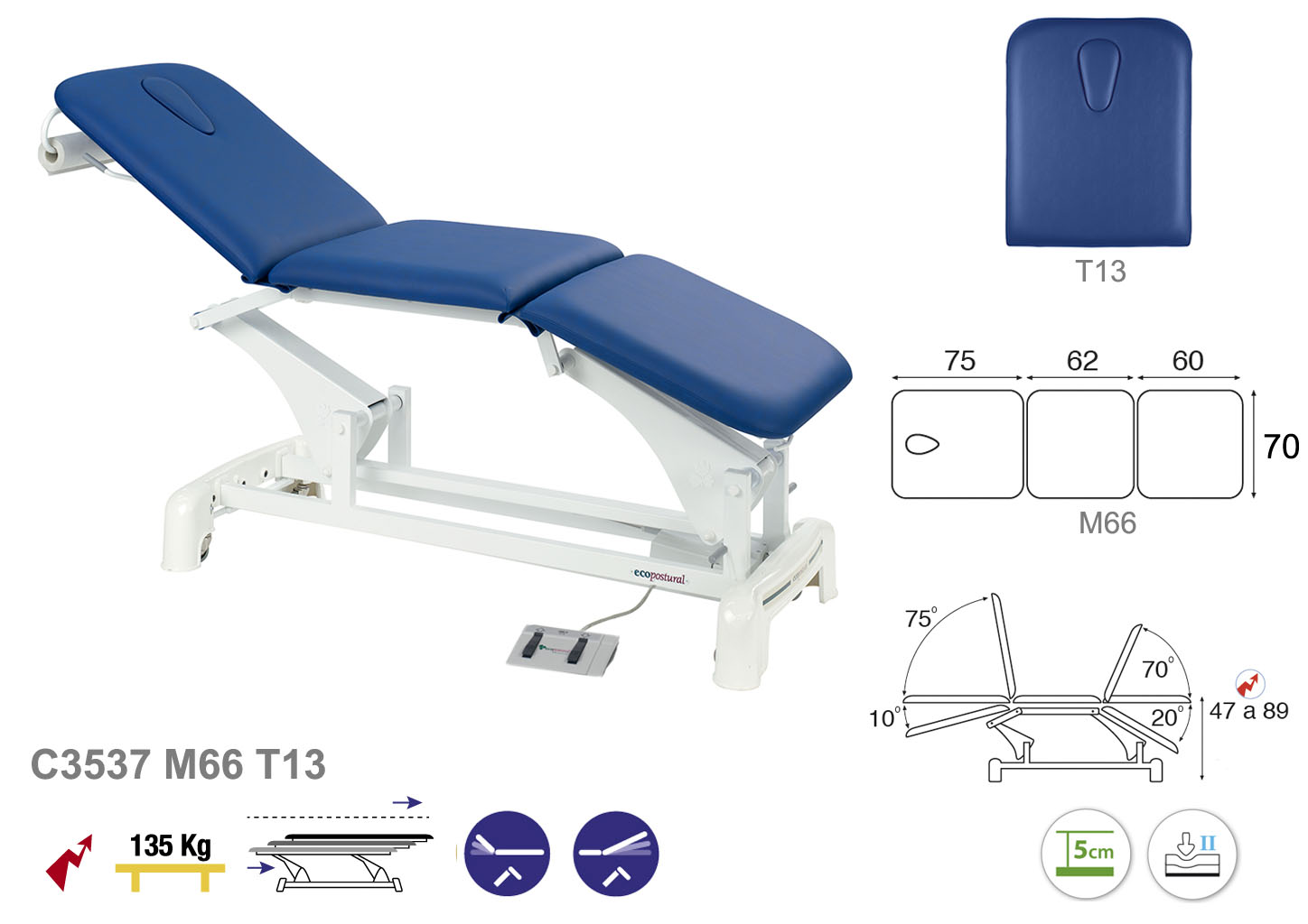 Camilla ecopostural eléctrica de tres cuerpos con estructura de biela blanca. Anchos disponibles: 62 cm y 70 cm. Largo 198 cm. Largo del cabezal: 75 cm, reclinable 75º hacia adelante y 10º hacia atrás con sistema hidráulico. Parte final: reclinable 70º hacia arriba y 20º hacia abajo con sistema hidráulico. Altura regulable entre 47 y 89 cm con desplazamiento lateral. Posee una firmeza media con espuma de 5 cm de grosor. Incluye portarrollos.