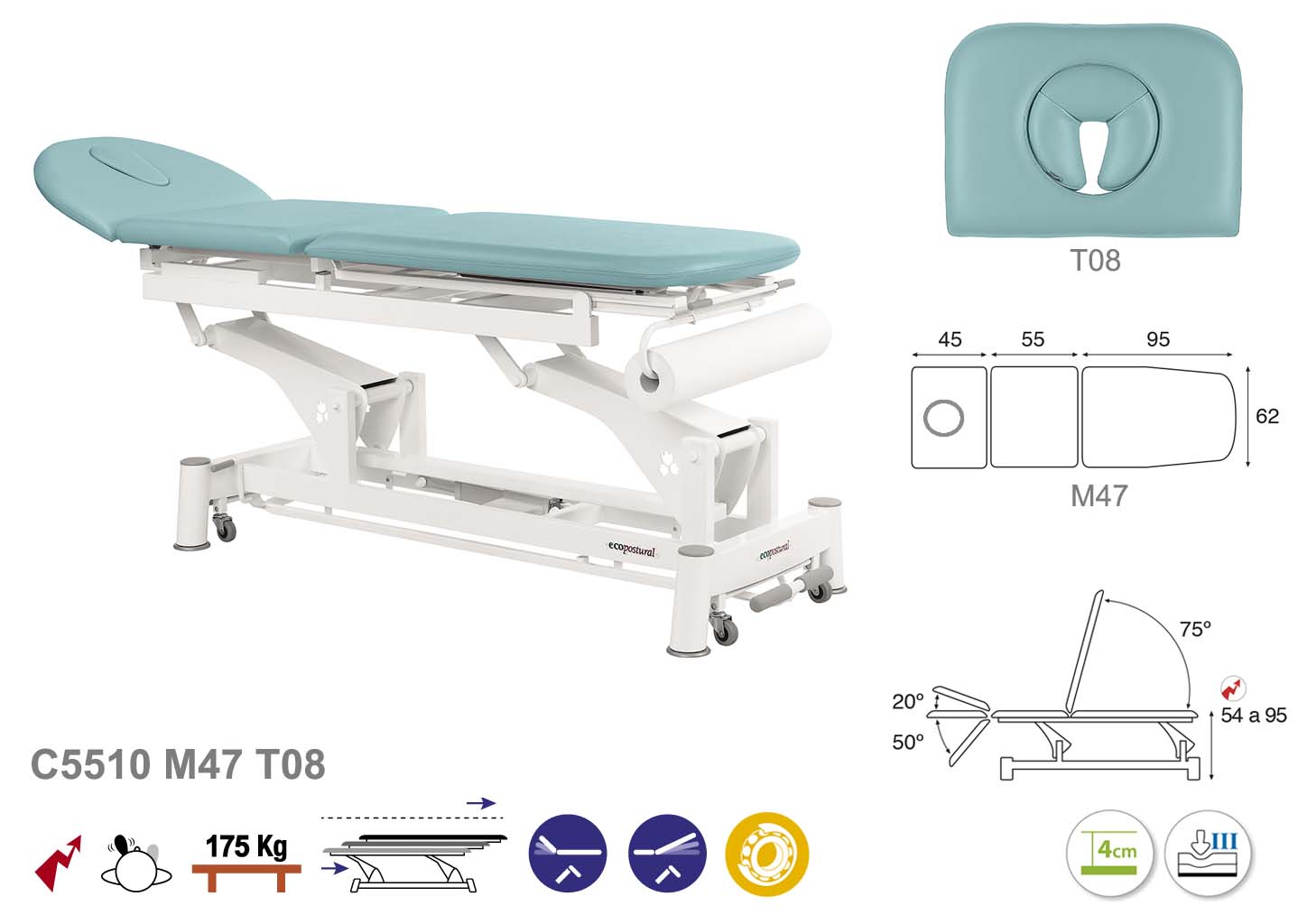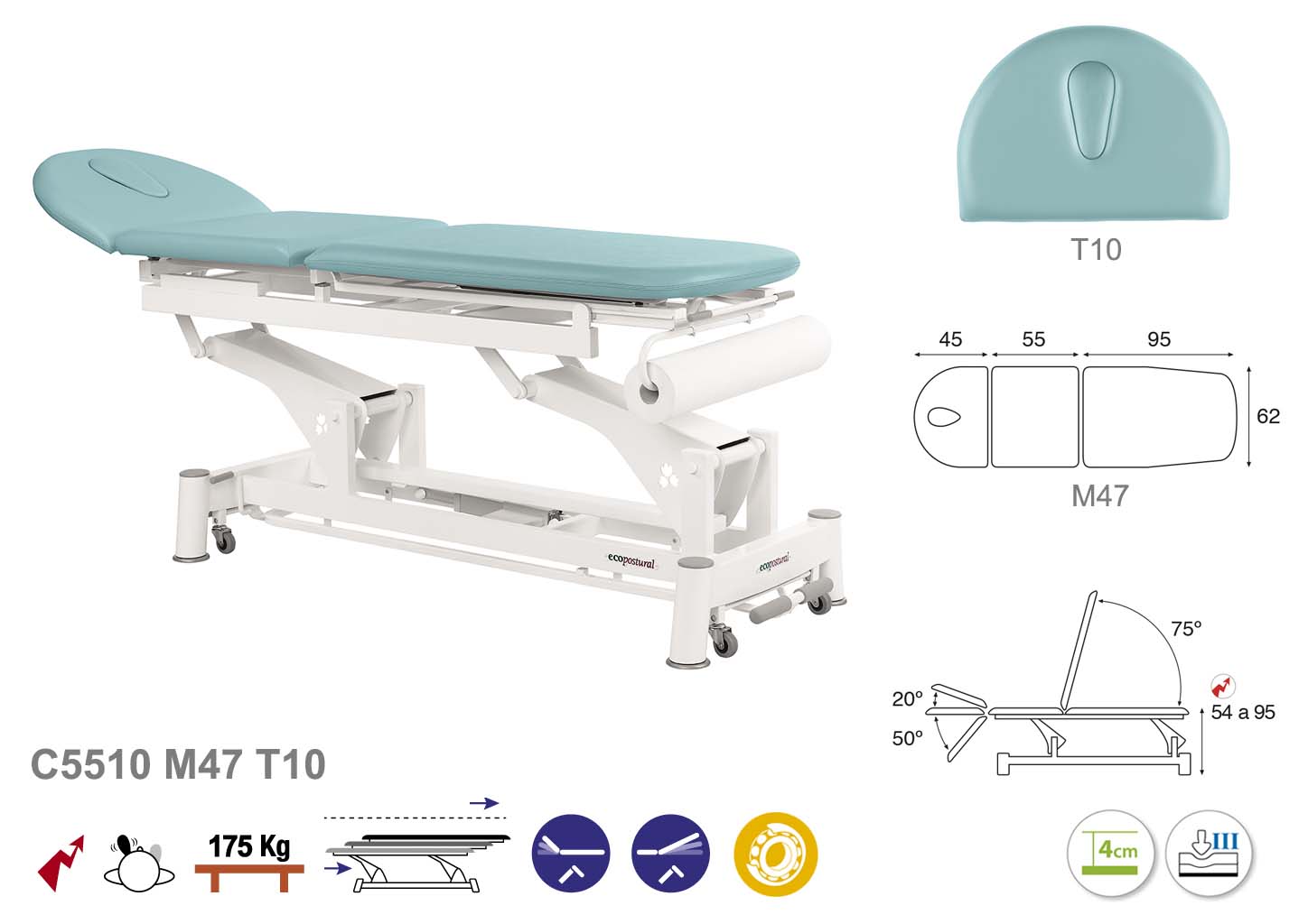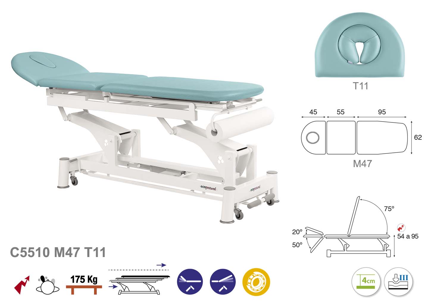 Camilla ecopostural eléctrica de tres cuerpos con estructura de biela blanca. Ancho: 62 cm. Largo 200 cm. Largo del cabezal: 45 cm, reclinable 20º hacia arriba y 50º hacia abajo con sistema hidráulico. Parte final, reclinable 75º hacia arriba con sistema hidráulico. Altura regulable entre 54 y 95 cm. Posee una firmeza semidura y espuma de 4 cm de grosor. Control periférico. Incluye portarrollos.