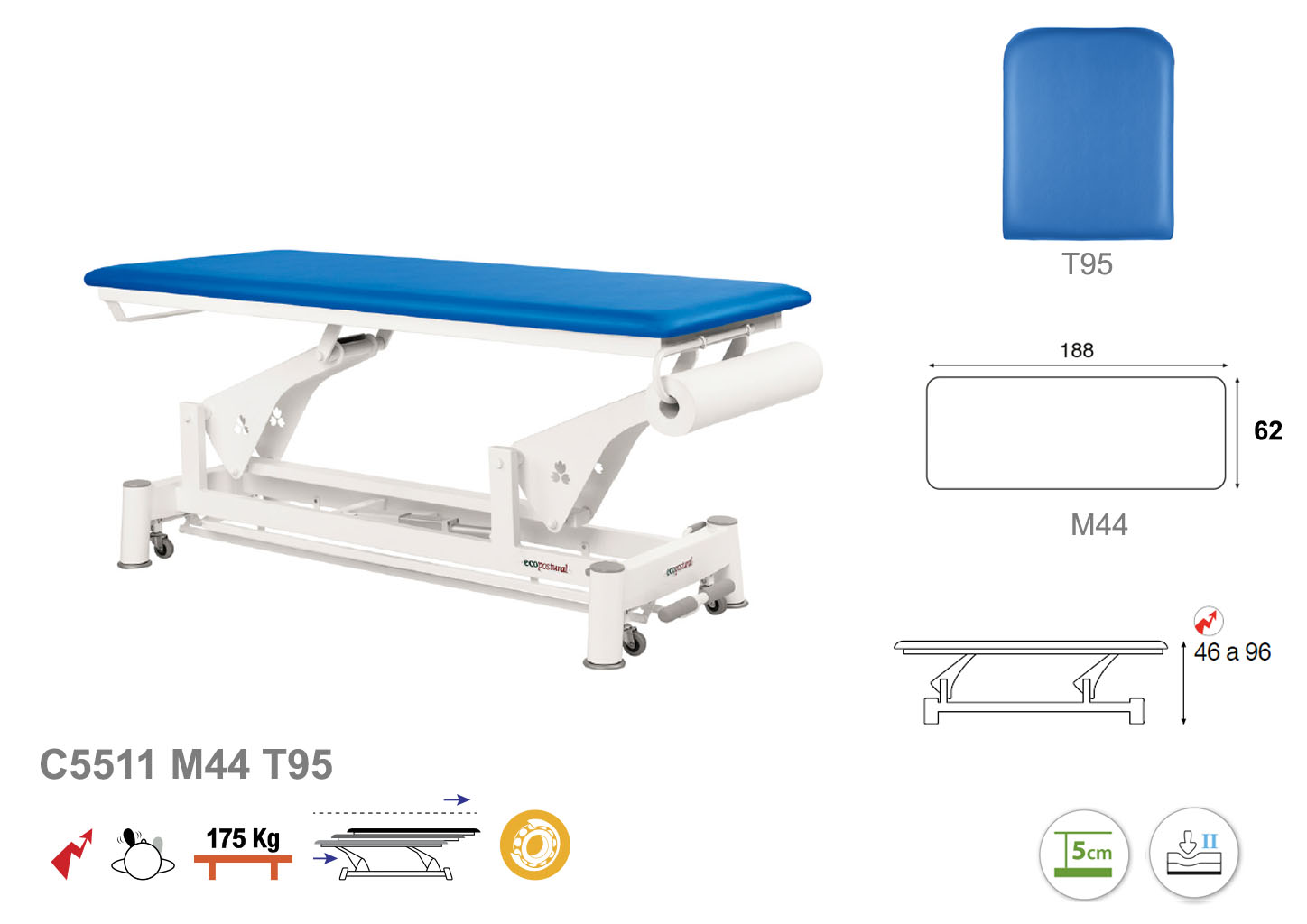 Camilla ecopostural eléctrica de un cuerpo con estructura de biela blanca. Anchos disponibles: 62 cm y 70 cm. Largo 188 cm. Altura regulable entre 46 y 96 cm con desplazamiento lateral. Control periférico. Posee una firmeza media con espuma de 5 cm de grosor. Incluye portarrollos.