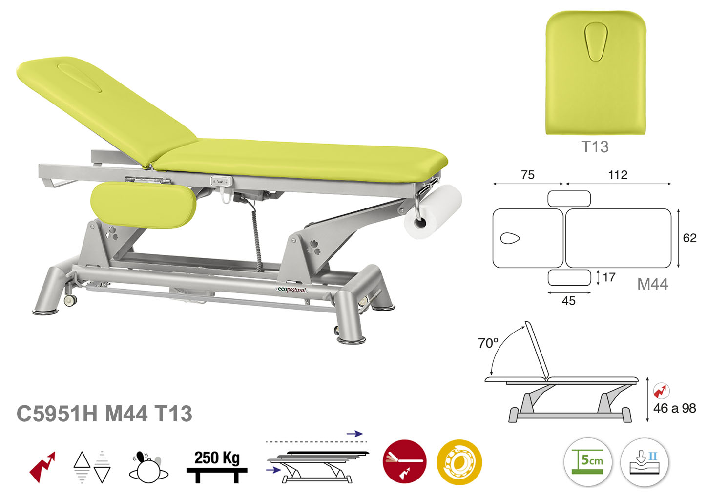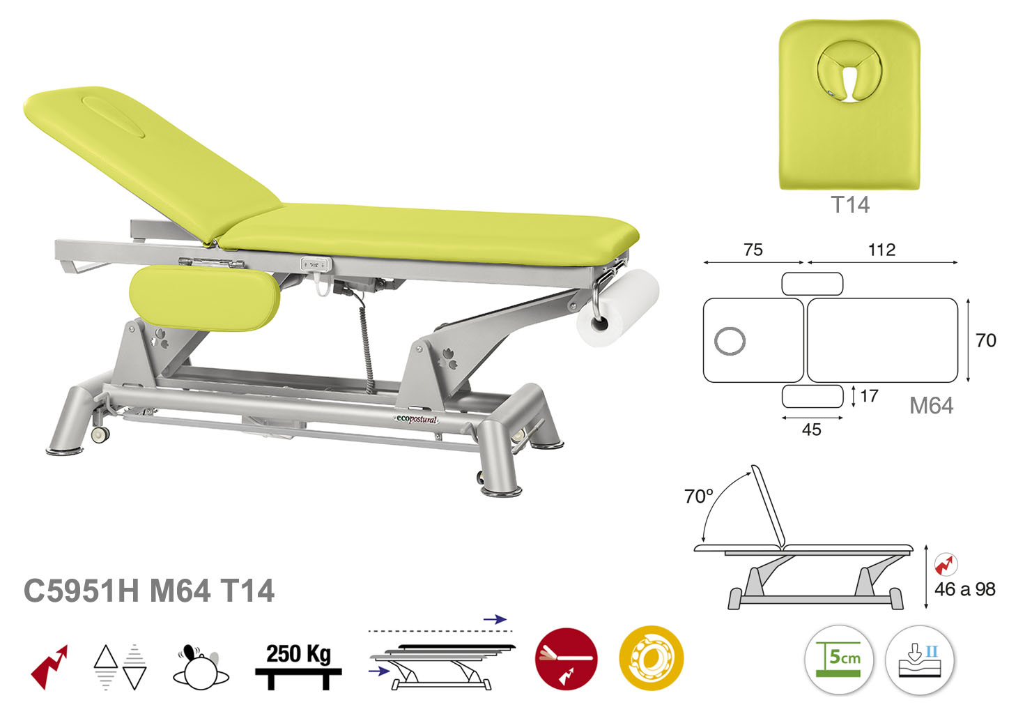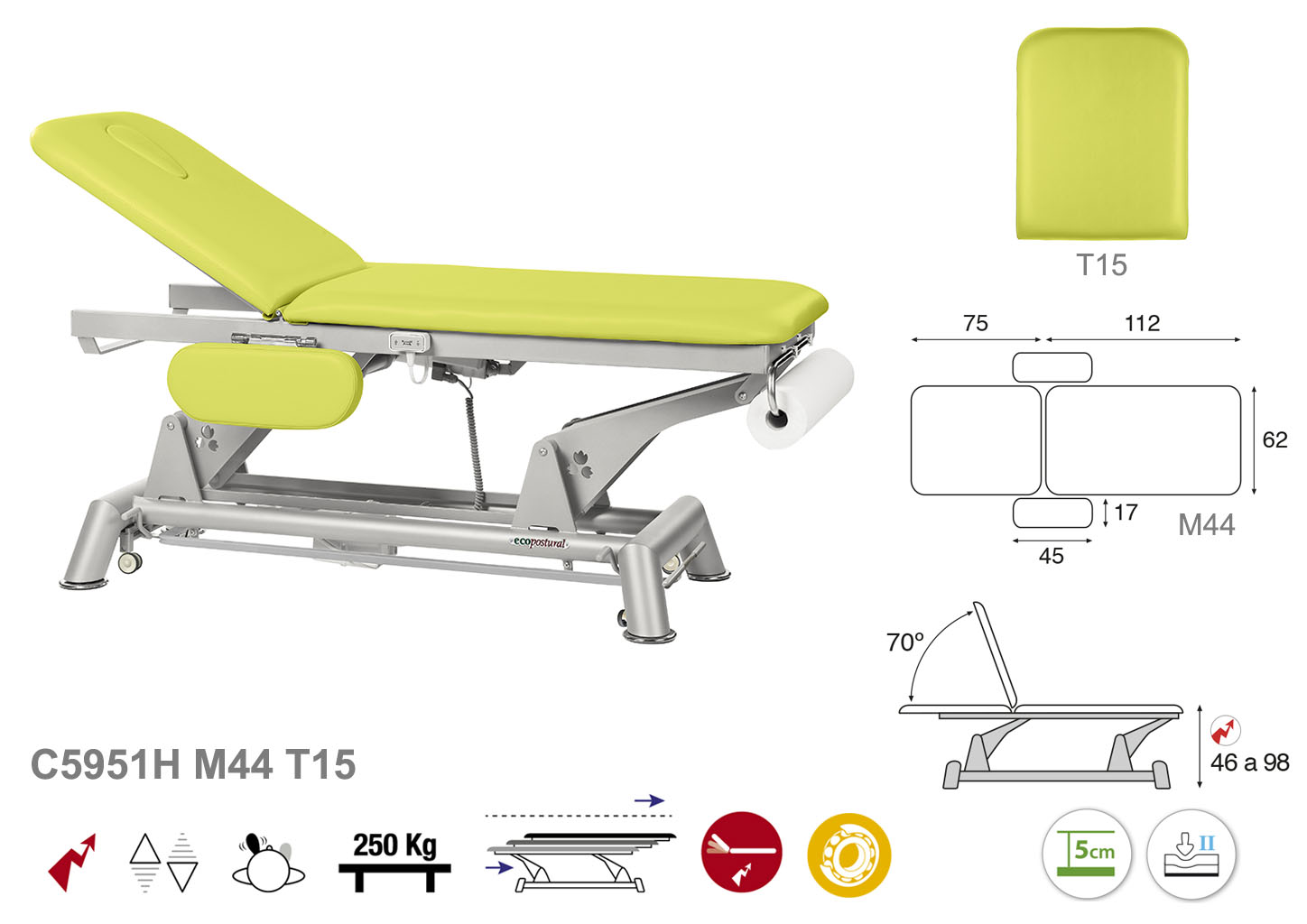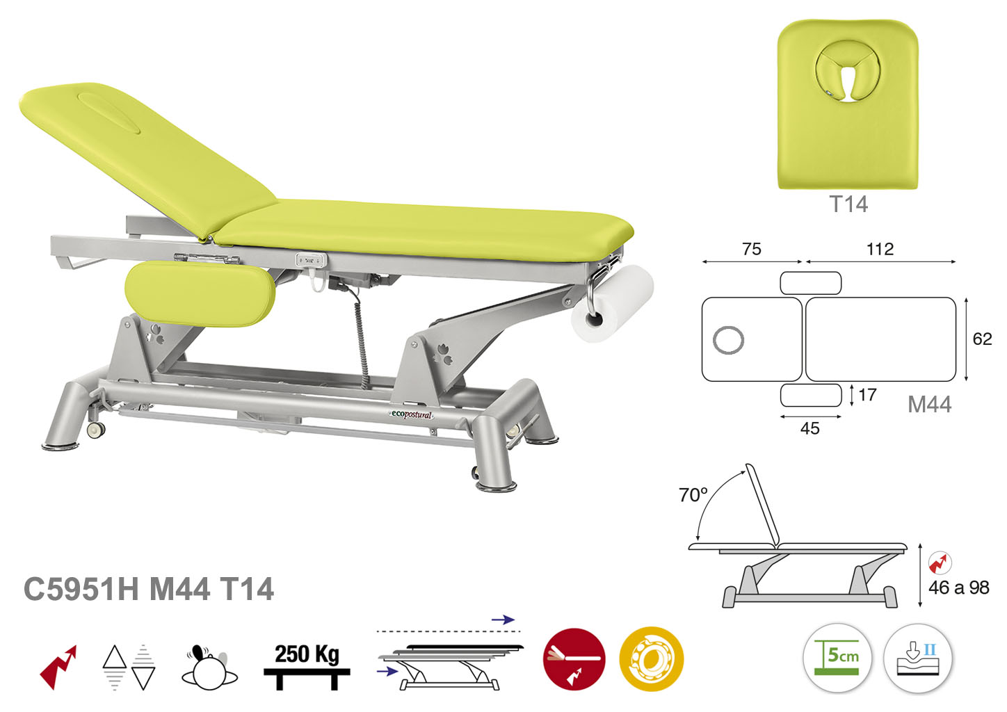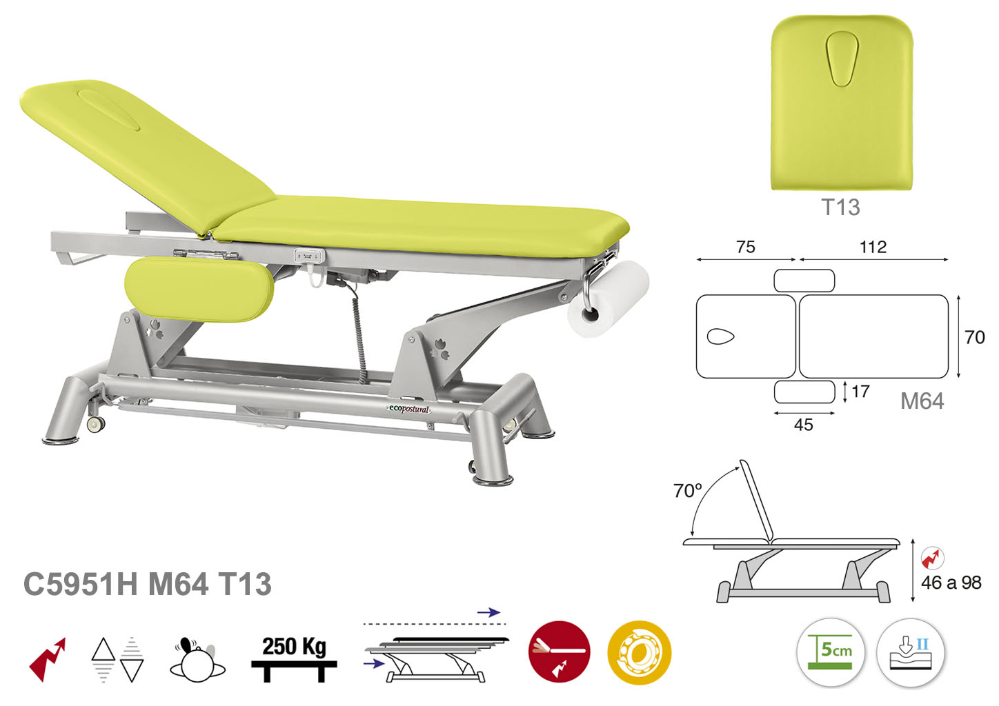 Camilla ecopostural eléctrica de dos cuerpos con estructura de biela gris con reposabrazos. Anchos disponibles: 62 cm y 70 cm. Largo 188 cm. Largo del cabezal: 75 cm, reclinable 70º. Altura regulable entre 46 y 98 cm con desplazamiento lateral. Posee una firmeza media con espuma de 5 cm de grosor. Control periférico y motor rápido. Incluye portarrollos.