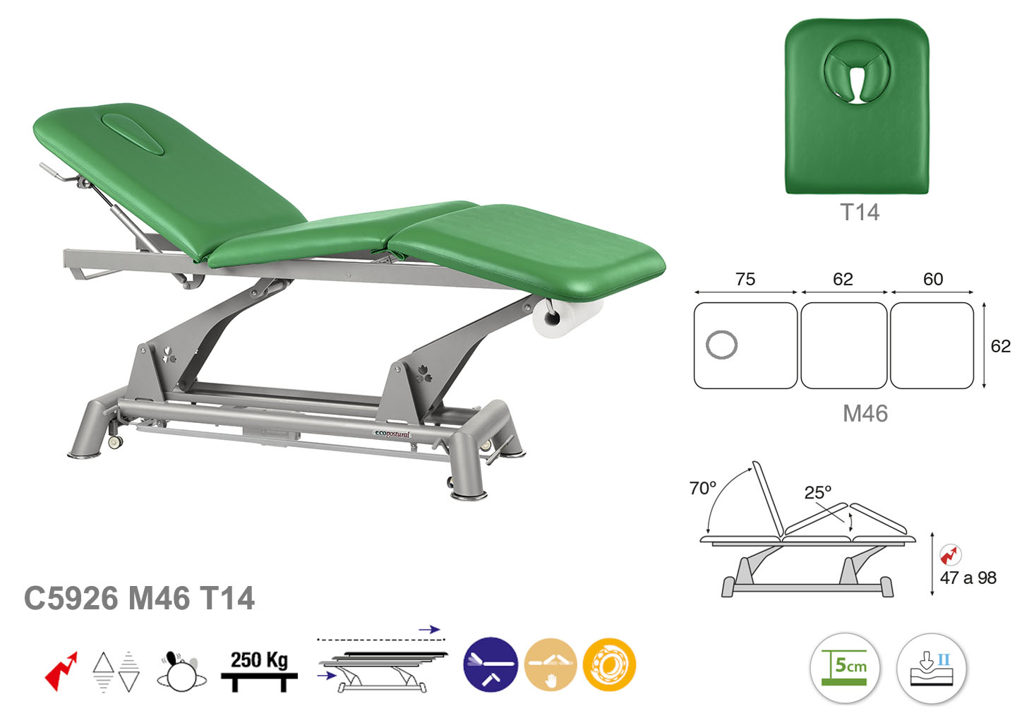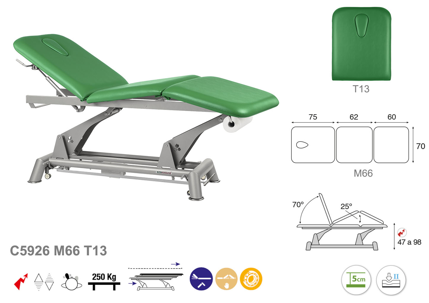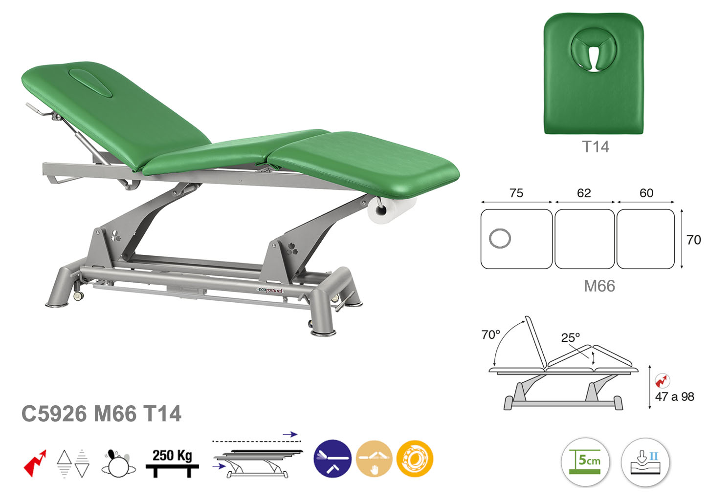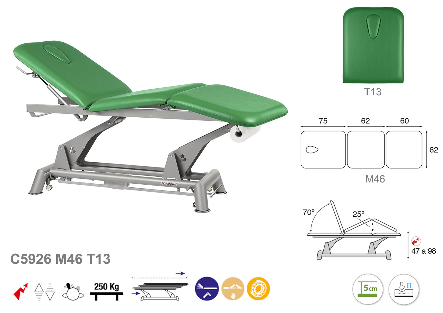 Camilla ecopostural eléctrica de tres cuerpos con estructura de biela gris. Anchos disponibles: 62 cm y 70 cm. Largo 198 cm. Largo del cabezal: 75 cm, reclinable 70º con elevación hidráulica. Parte intermedia, reclinable 25º, elevación manual. Altura regulable entre 47 y 98 cm con desplazamiento lateral. Posee una firmeza media con espuma de 5 cm de grosor. Control periférico y motor rápido. Incluye portarrollos.
