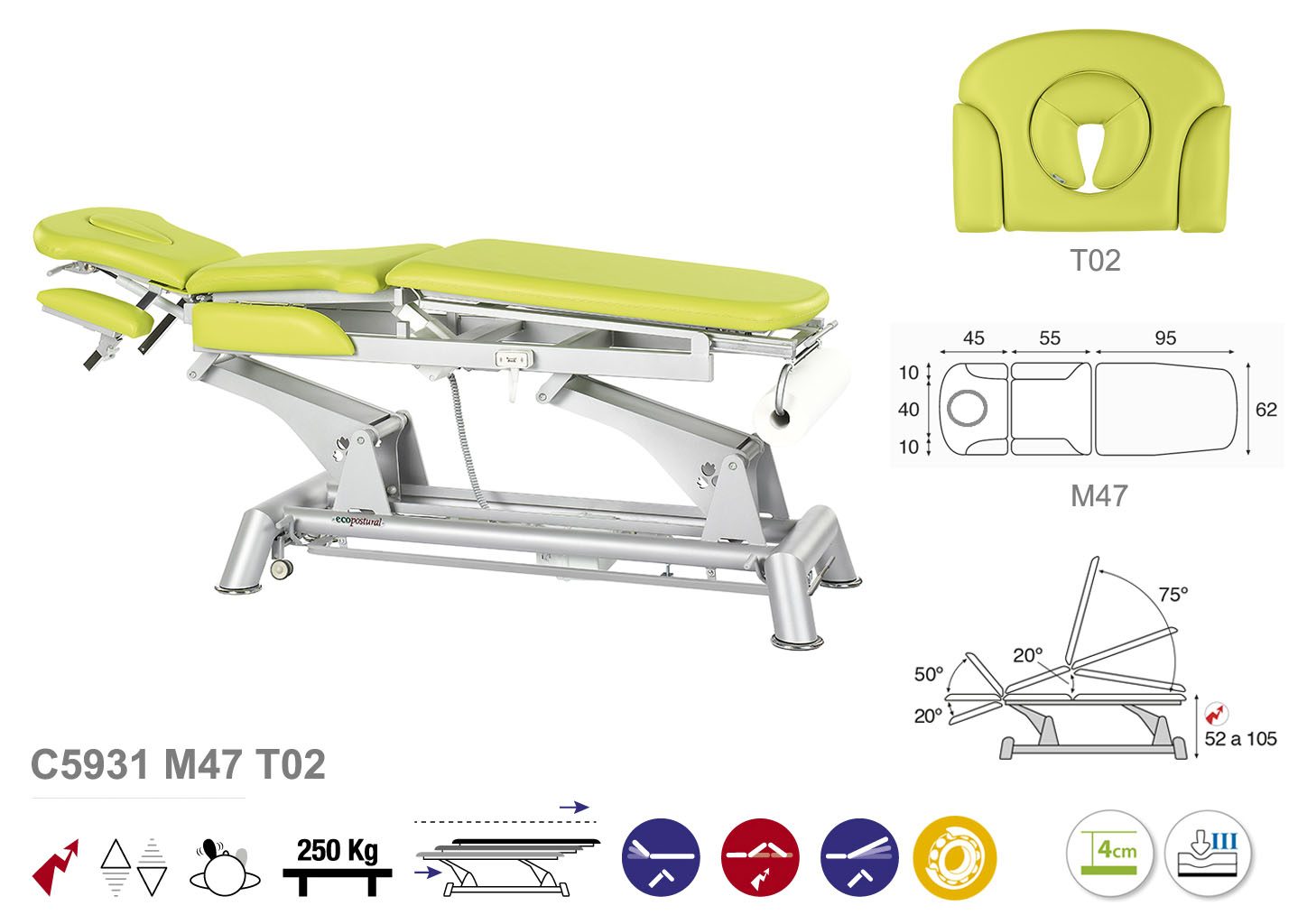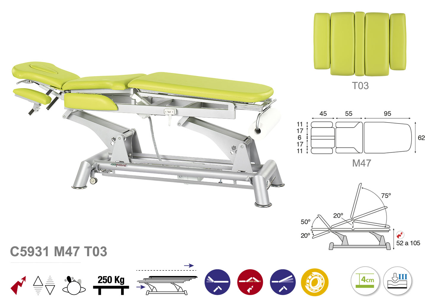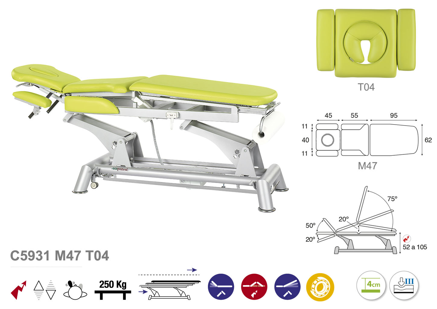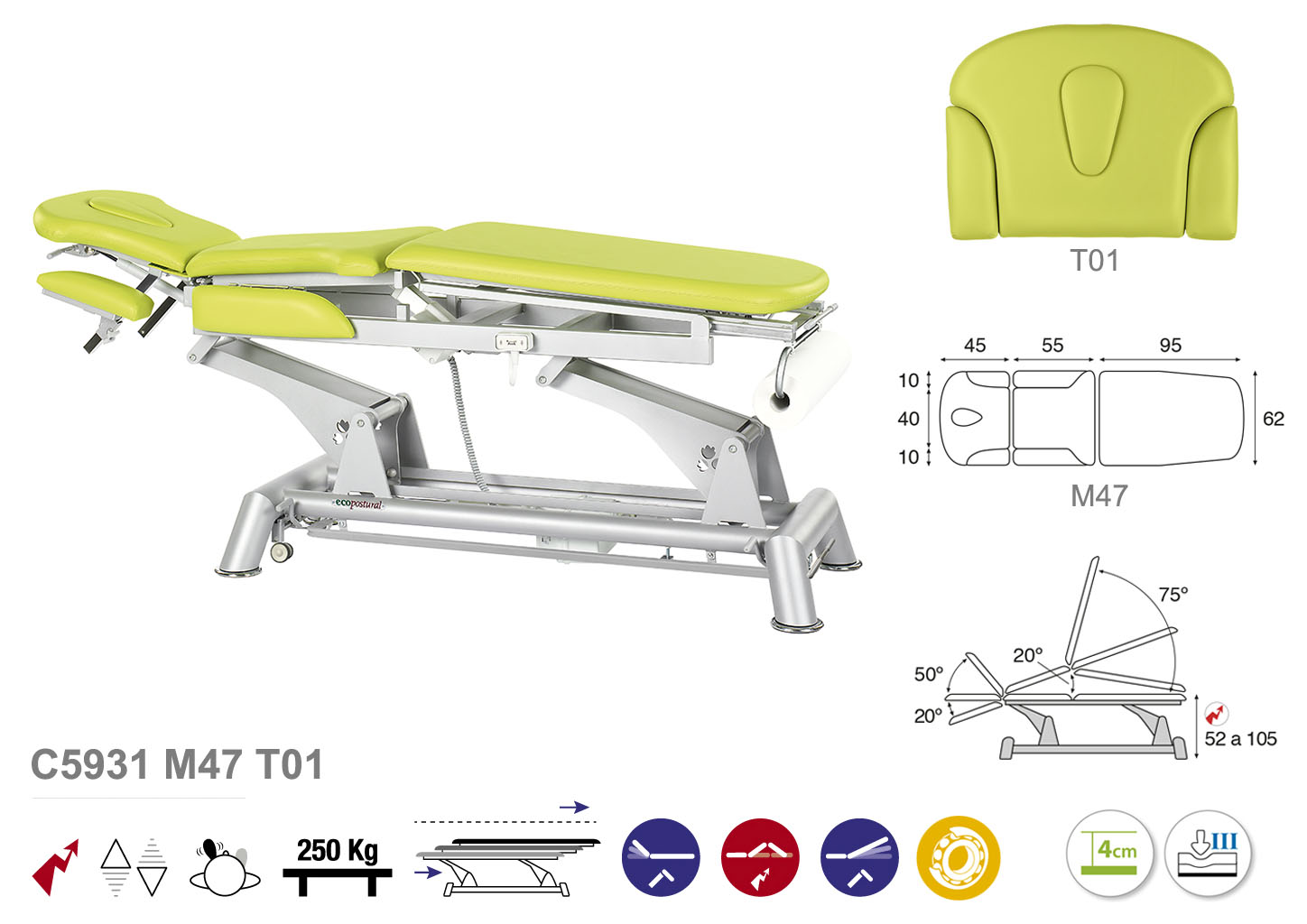 Camilla ecopostural hidráulica de tres cuerpos con estructura de biela gris con reposabrazos. Ancho: 62 cm. Largo 200 cm. Largo del cabezal: 45 cm, reclinable 50º hacia arriba y 20º hacia abajo con sistema hidráulico. Parte intermedia reclinable hacia arriba 20º con sistema eléctrico. Parte final reclinable 75º hacia arriba y hacia abajo con sistema hidráulico. Altura regulable entre 52 y 105 cm con desplazamiento lateral. Posee una firmeza semidura y espuma de 4 cm de grosor. Control periférico y motor rápido. Incluye portarrollos.