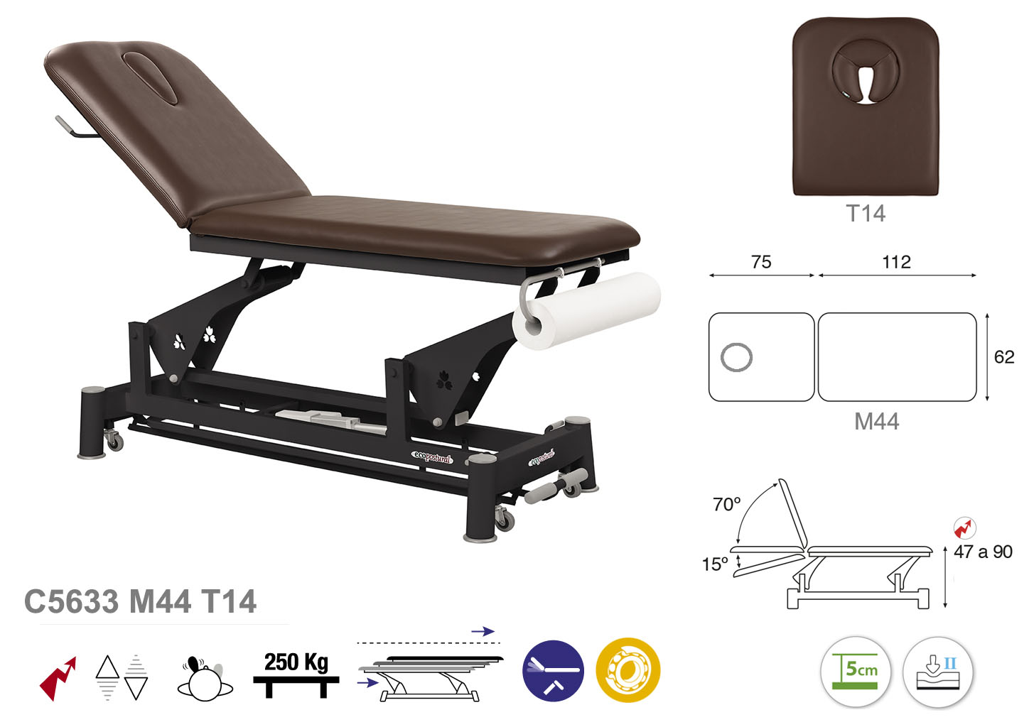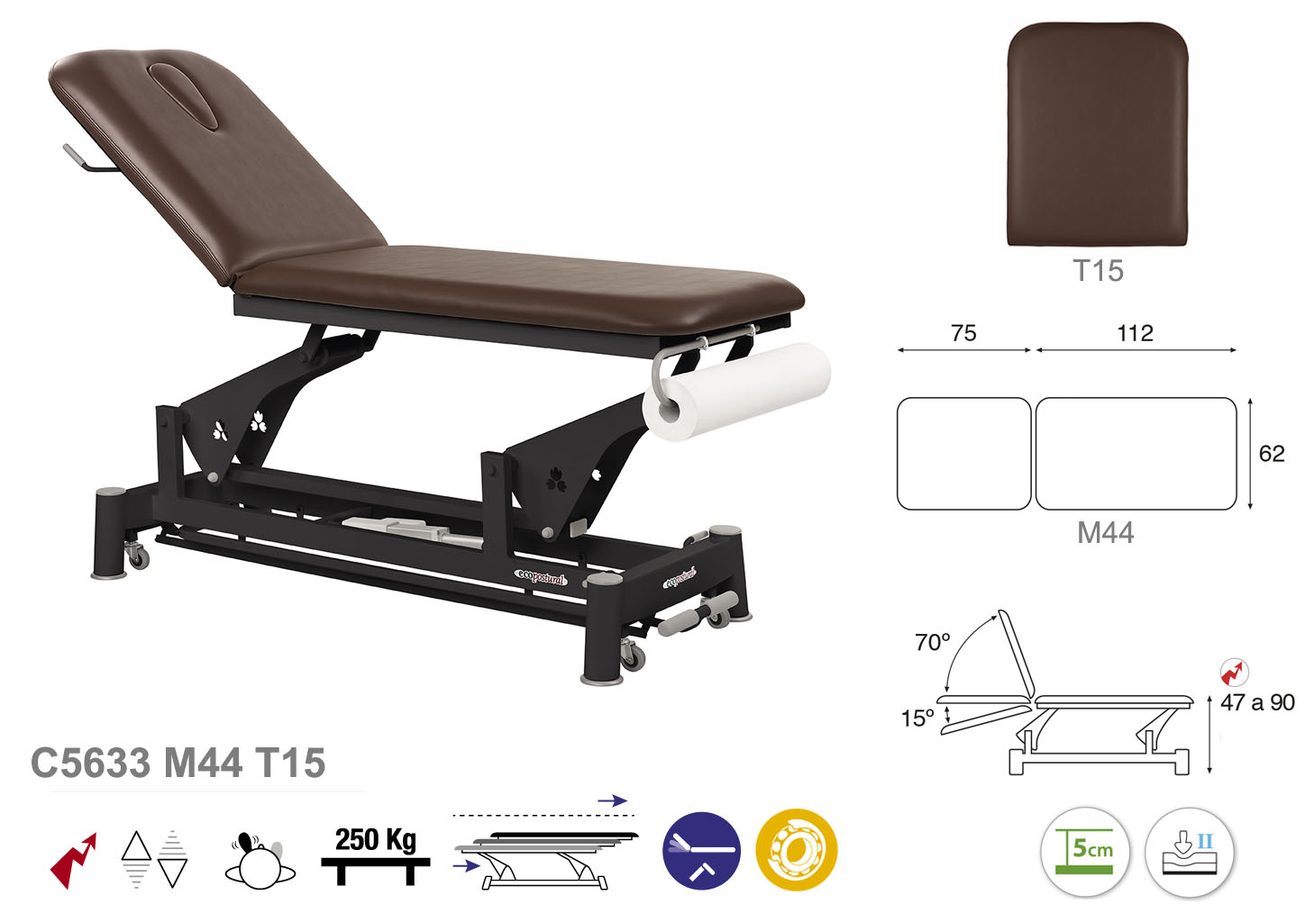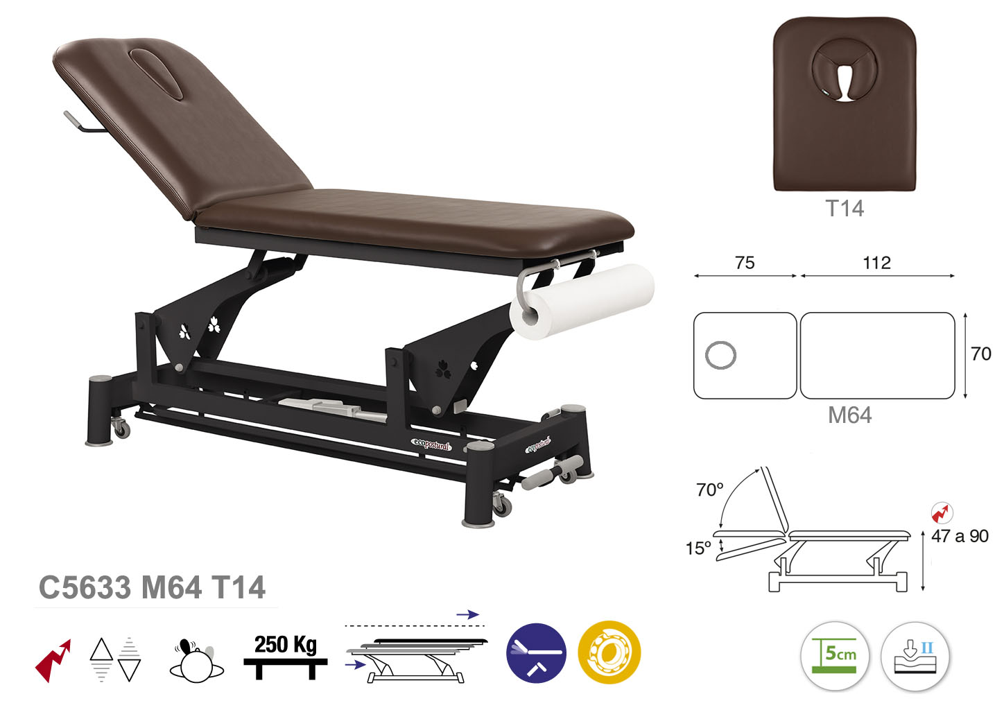 Camilla ecopostural eléctrica de dos cuerpos con estructura de biela negra. Anchos disponibles: 62 cm y 70 cm. Largo 188 cm. Largo del cabezal: 75 cm, reclinable 70º hacia arriba y 15º hacia abajo con sistema hidráulico. Altura regulable entre 47 y 90 cm con desplazamiento lateral. Posee una firmeza media con espuma de 5 cm de grosor. Control periférico. Incluye portarrollos.