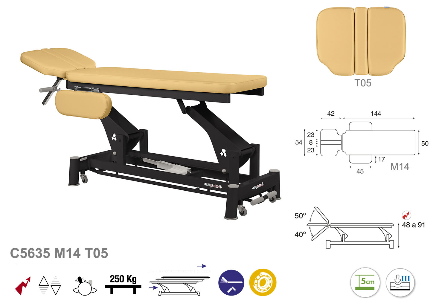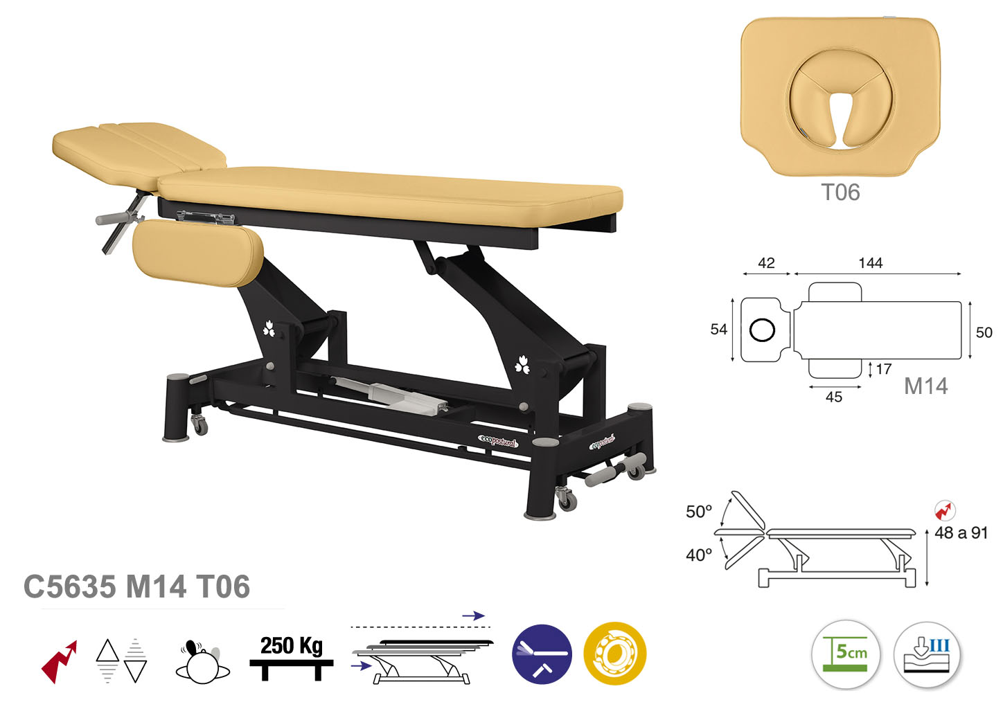 Camilla ecopostural eléctrica de dos cuerpos con estructura de biela negra con reposabrazos. Ancho camilla: 50 cm. Largo 188 cm. Largo del cabezal: 42 cm, reclinable 50º hacia arriba y 40º hacia abajo con sistema hidráulica. Altura regulable entre 48 y 91 cm con desplazamiento lateral. Posee una firmeza media con espuma de 5 cm de grosor. Control periférico y motor rápido.