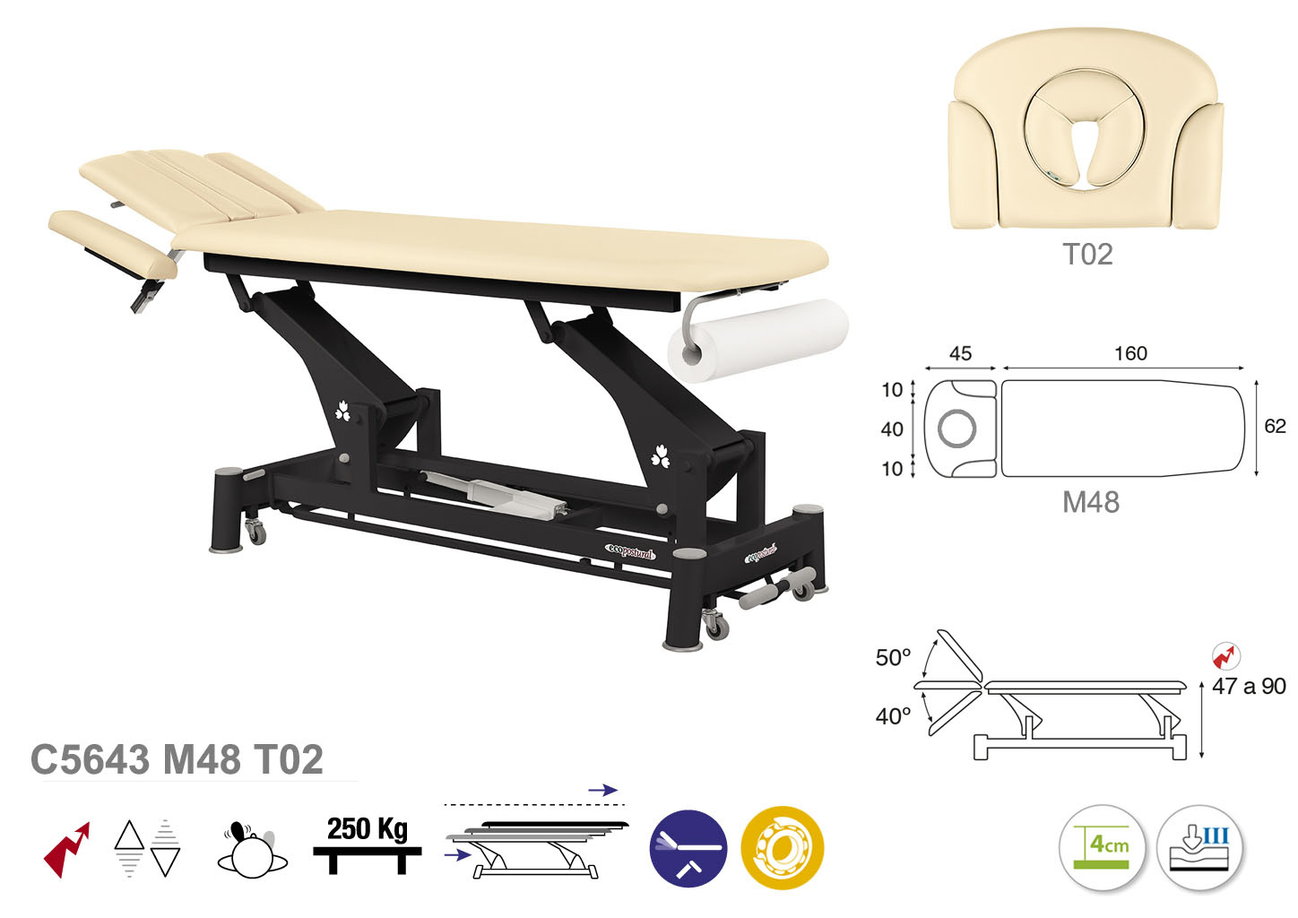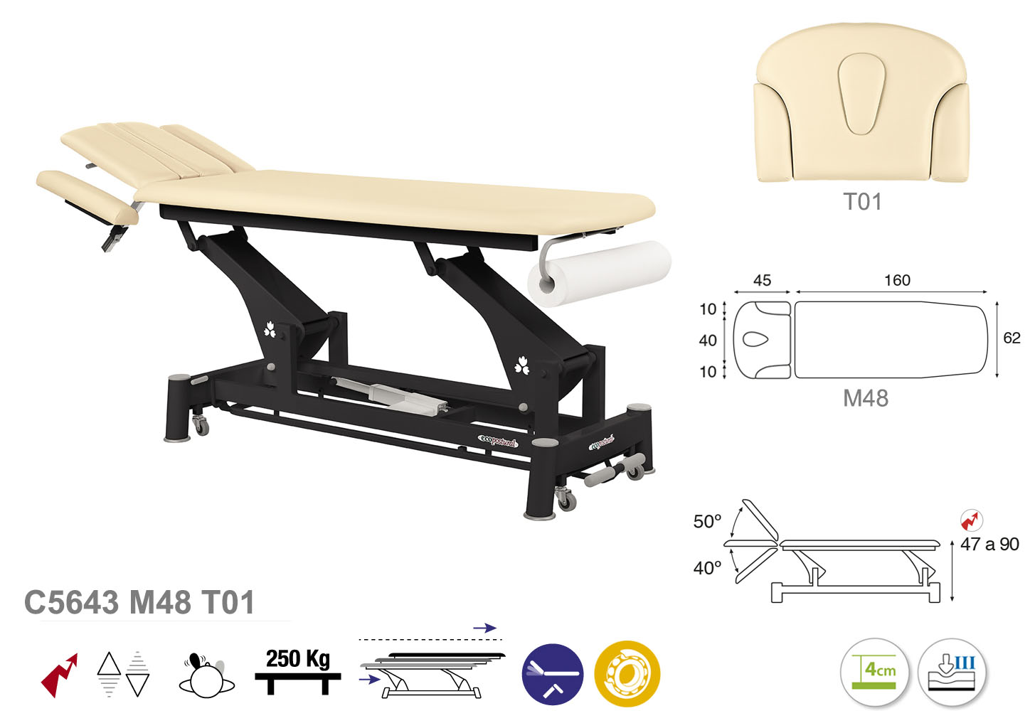 Camilla ecopostural eléctrica de dos cuerpos con estructura de biela negra. Ancho: 62 cm. Largo 207 cm. Largo del cabezal: 45 cm, reclinable 50º hacia arriba y 40º hacia abajo con sistema hidráulico. Altura regulable entre 47 y 90 cm con desplazamiento lateral. Posee una firmeza semidura y espuma de 4 cm de grosor. Control periférico y motor rápido. Incluye portarrollos.