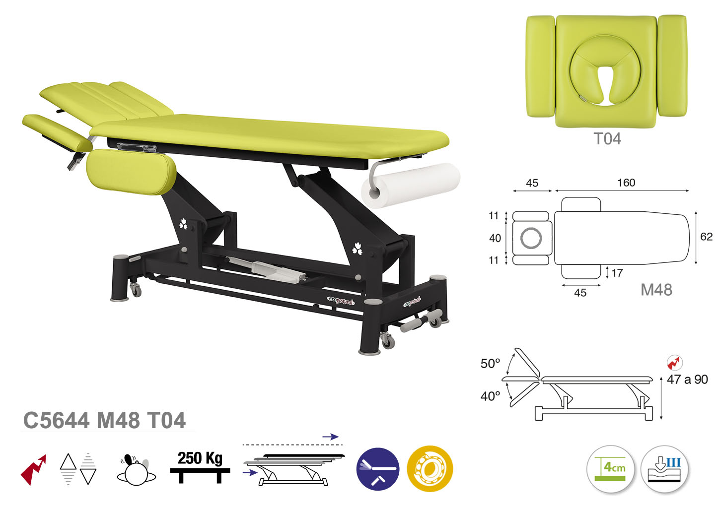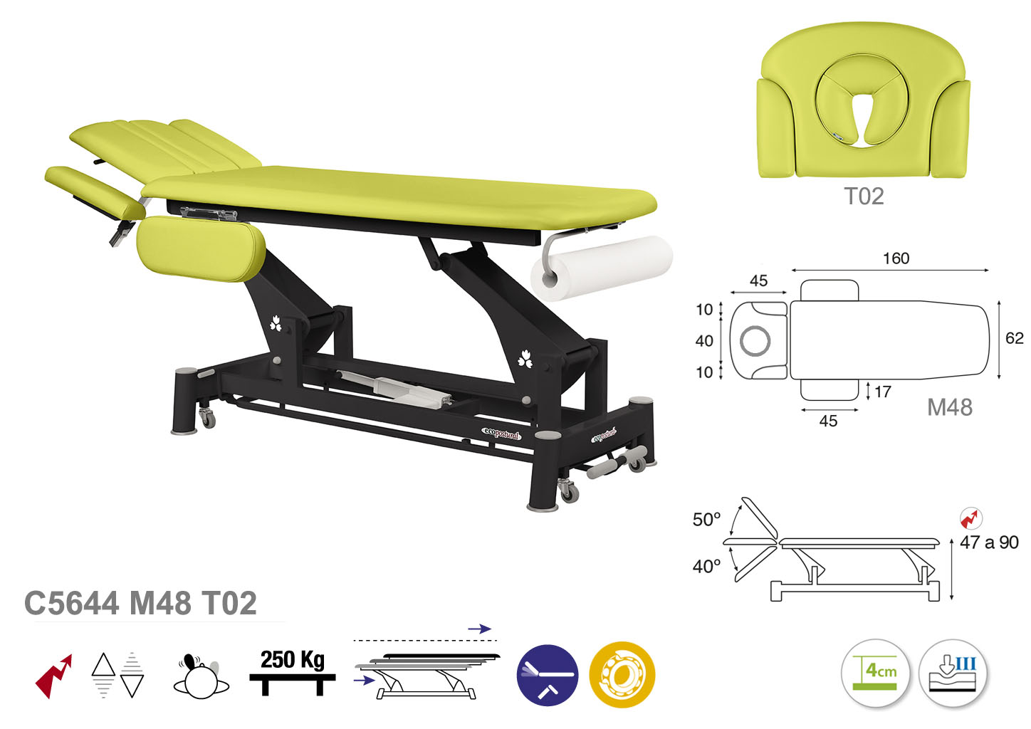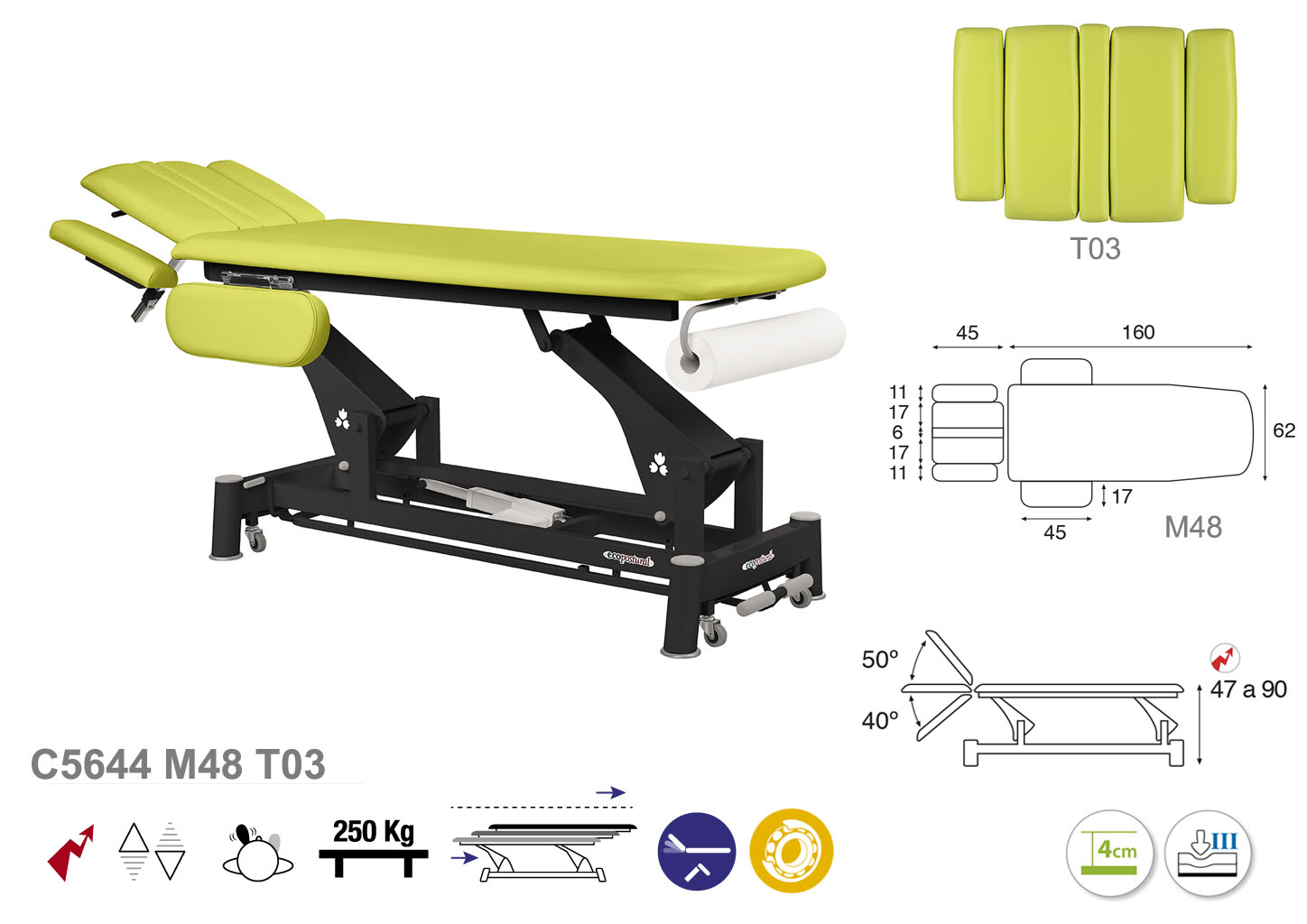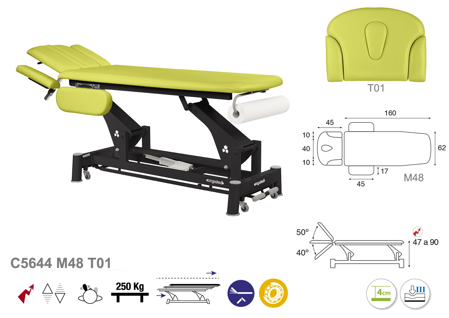Camilla ecopostural eléctrica de dos cuerpos con estructura de biela negra con reposabrazos. Ancho: 62 cm. Largo 207 cm. Largo del cabezal: 45 cm, reclinable 50º hacia arriba y 40º hacia abajo con sistema hidráulico. Altura regulable entre 47 y 90 cm con desplazamiento lateral. Posee una firmeza semidura y espuma de 4 cm de grosor. Control periférico y motor rápido. Incluye portarrollos.