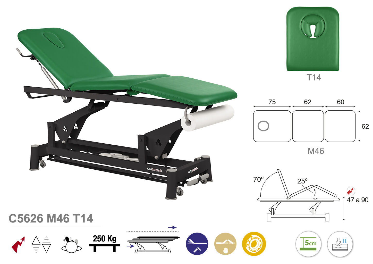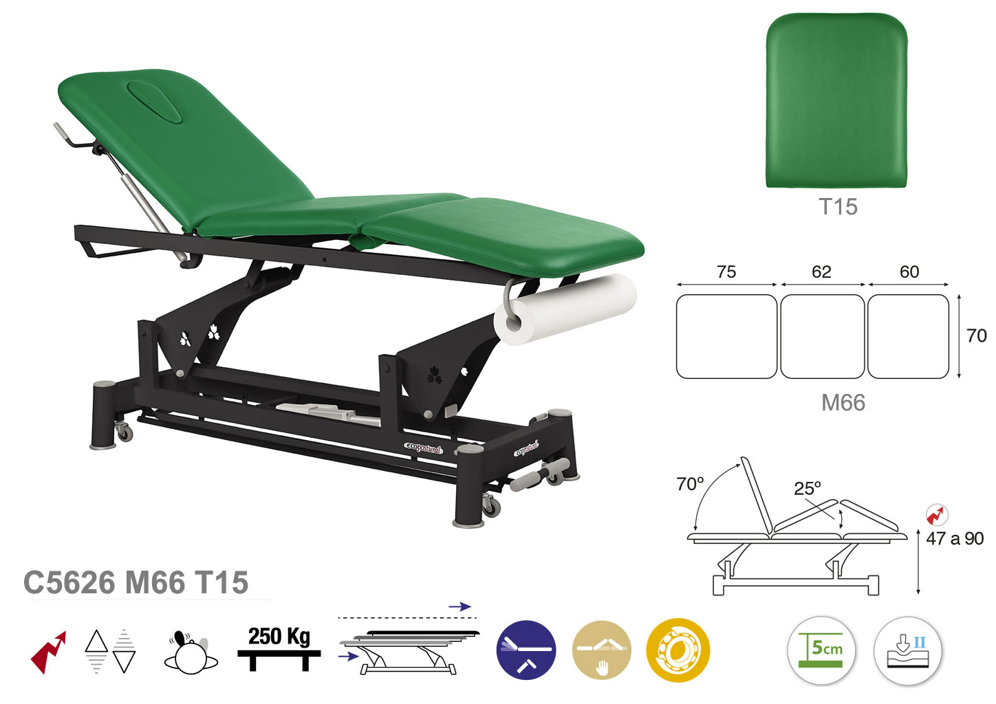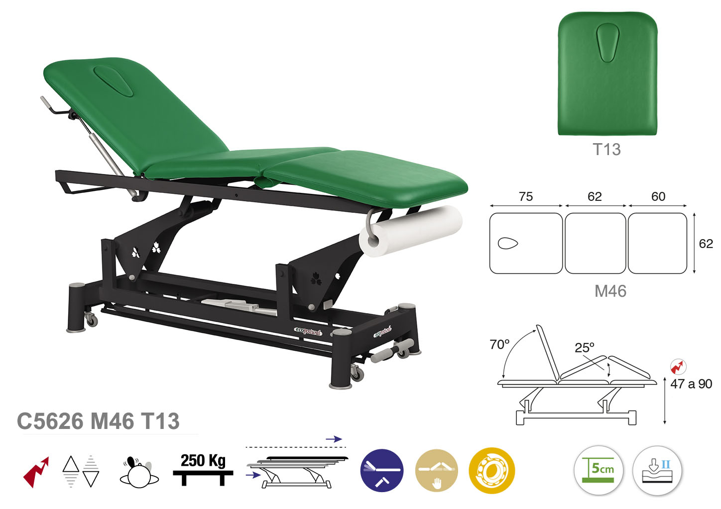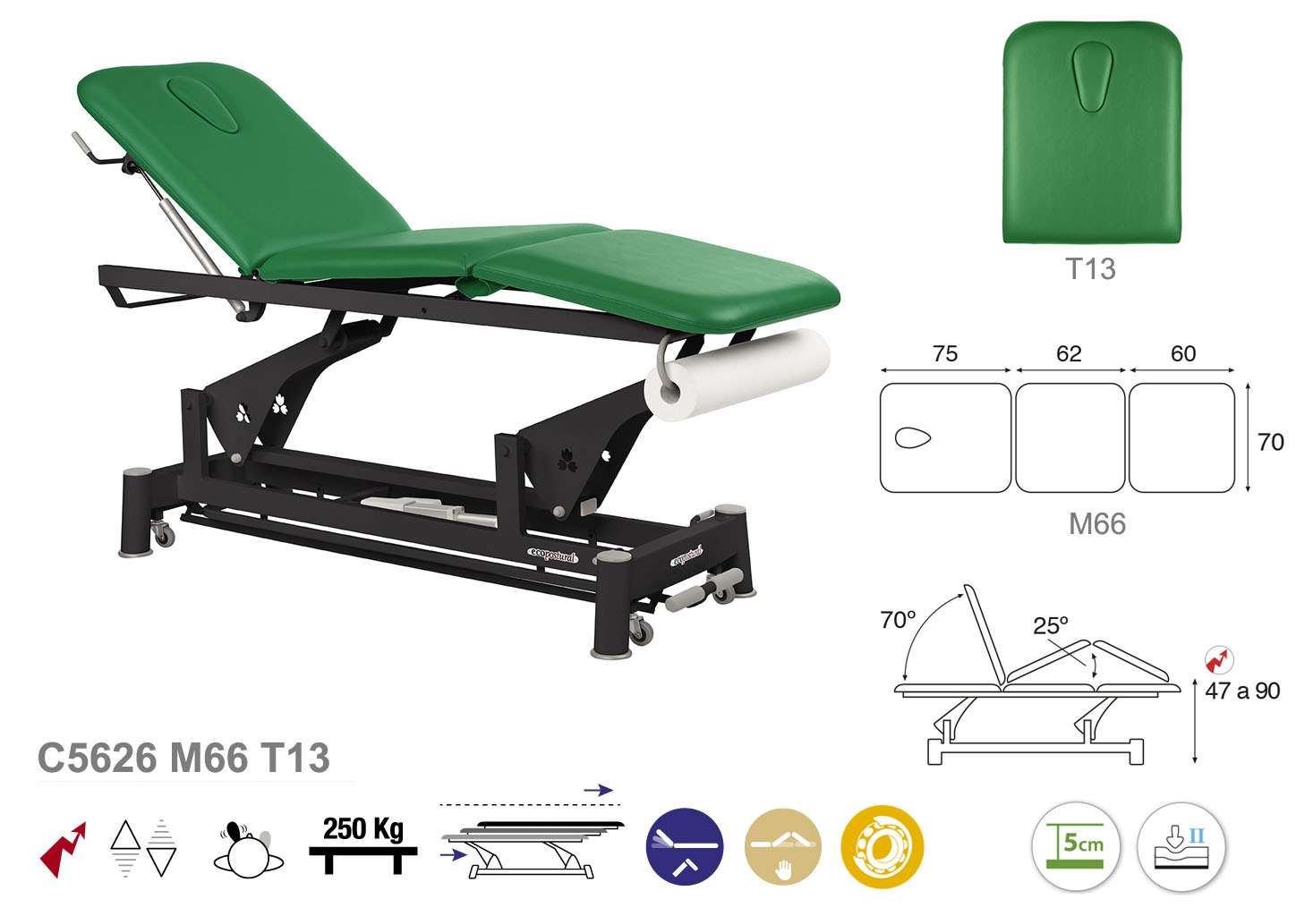 Camilla ecopostural eléctrica de tres cuerpos con estructura de biela negra. Anchos disponibles: 62 cm y 70 cm. Largo 198 cm. Largo del cabezal: 75 cm, reclinable 70º con elevación hidráulica. Parte intermedia, reclinable 25º, elevación manual. Altura regulable entre 47 y 90 cm. Posee una firmeza media con espuma de 5 cm de grosor. Control periférico y motor rápido. Incluye portarrollos.