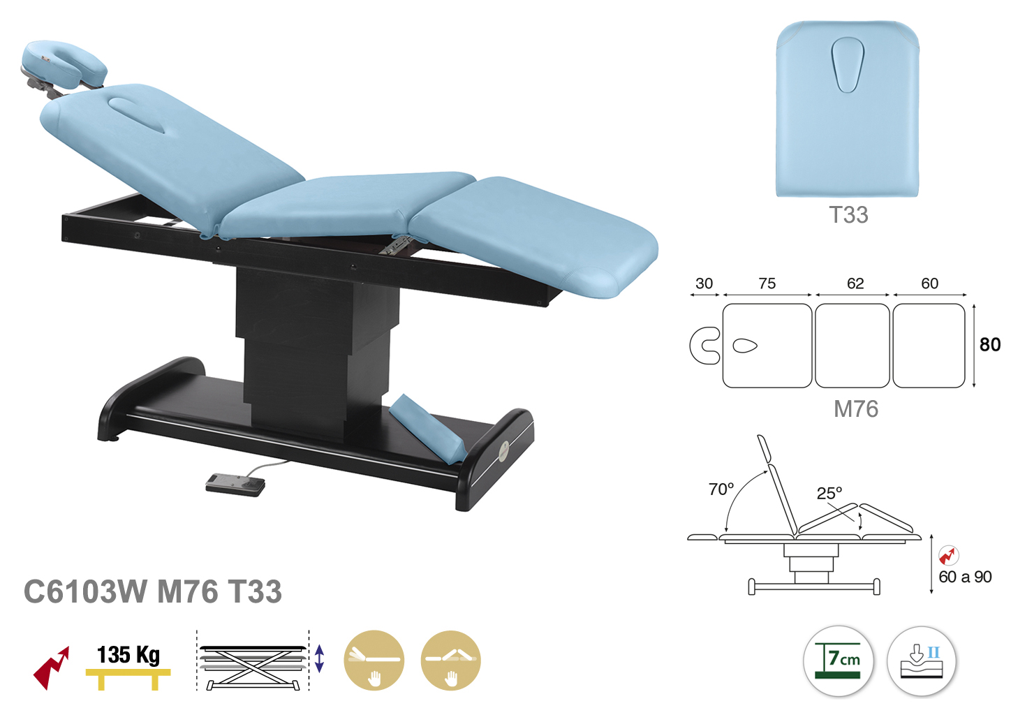 Camilla ecopostural eléctrica de tres cuerpos con estructura de columna negra. Anchos camilla: 70 y 80 cm. Largo 198 cm. Largo del cabezal: 75 cm, reclinable 70º de forma manual. Parte intermedia, reclinable 25º de forma manual. Altura regulable entre 60 y 90 cm. Posee una firmeza media con espuma de 7 cm de grosor.