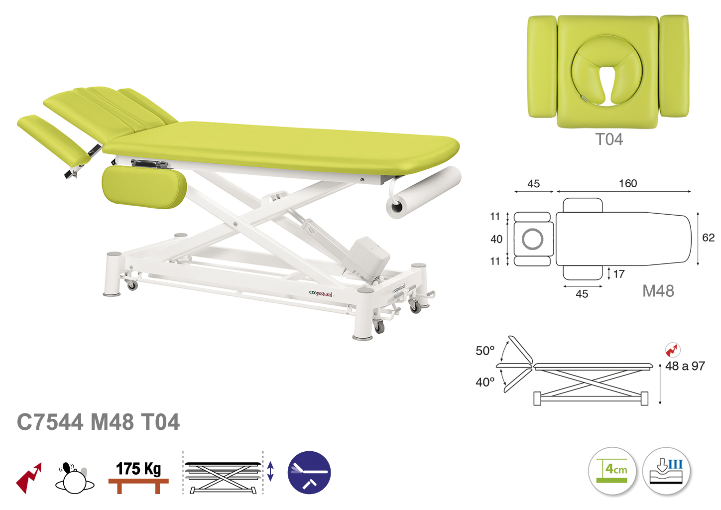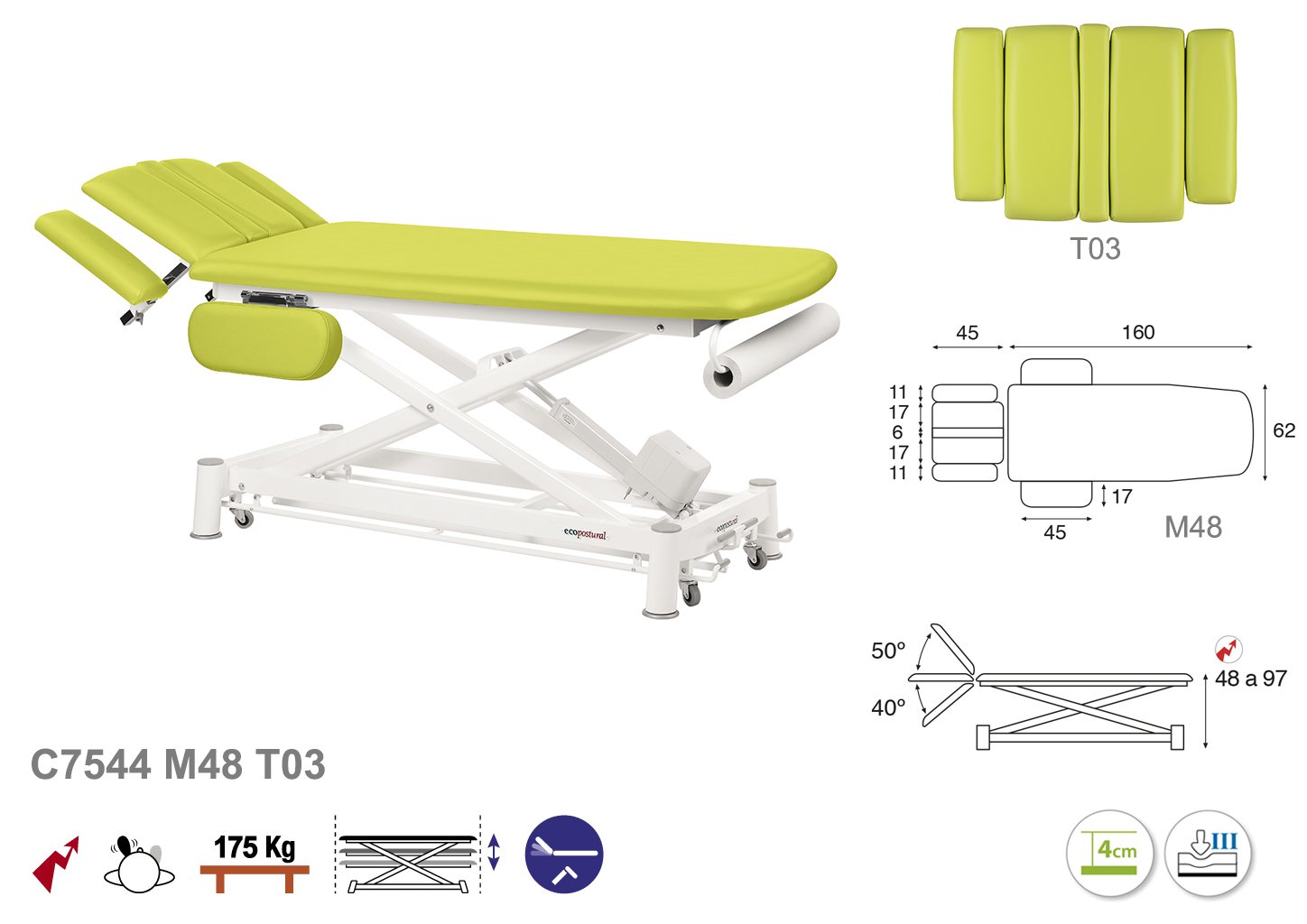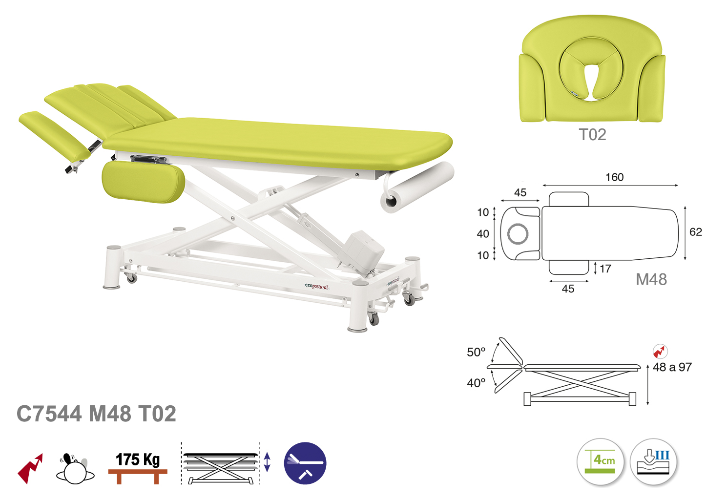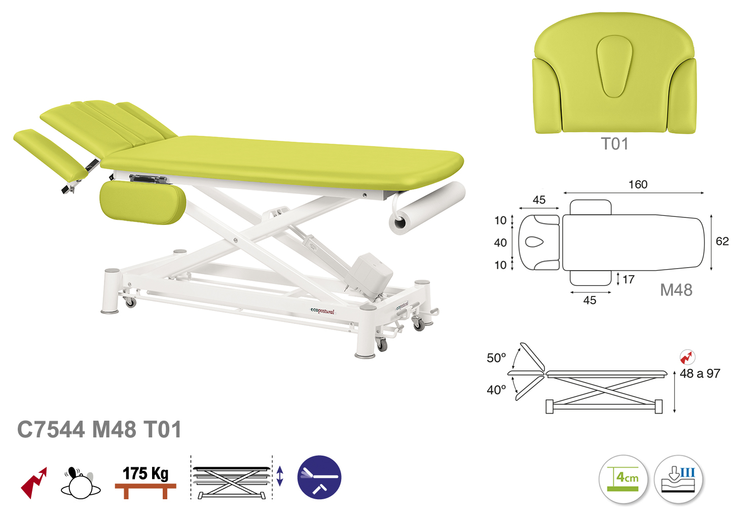 Camilla ecopostural eléctrica de dos cuerpos con estructura de tijera blanca con reposabrazos. Ancho: 62 cm. Largo 207 cm. Largo del cabezal: 45 cm, reclinable 50º hacia arriba y 40º hacia abajo con sistema hidráulico. Altura regulable entre 48 y 97 cm. Posee una firmeza semidura y espuma de 4 cm de grosor. Control periférico. Incluye portarrollos.