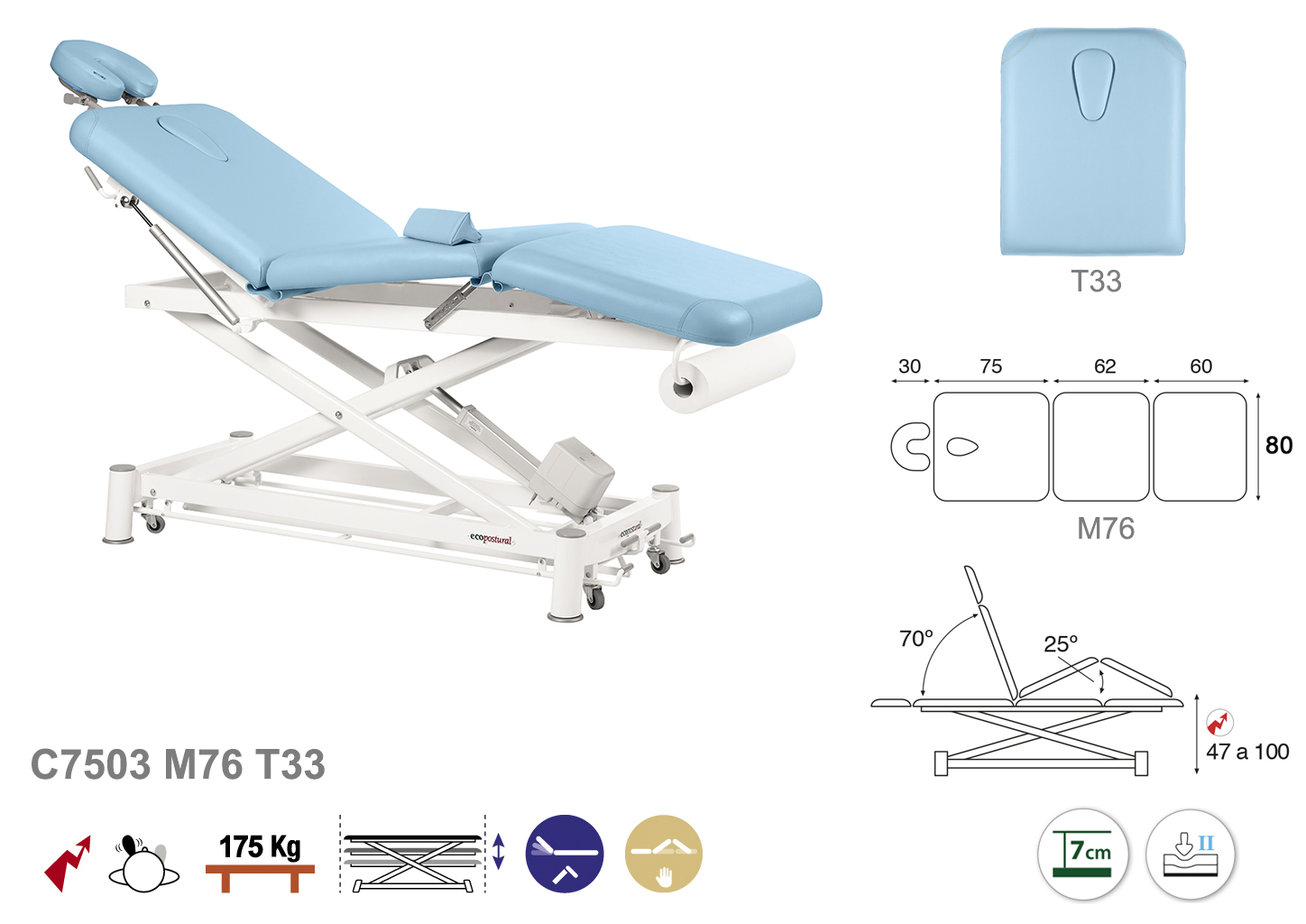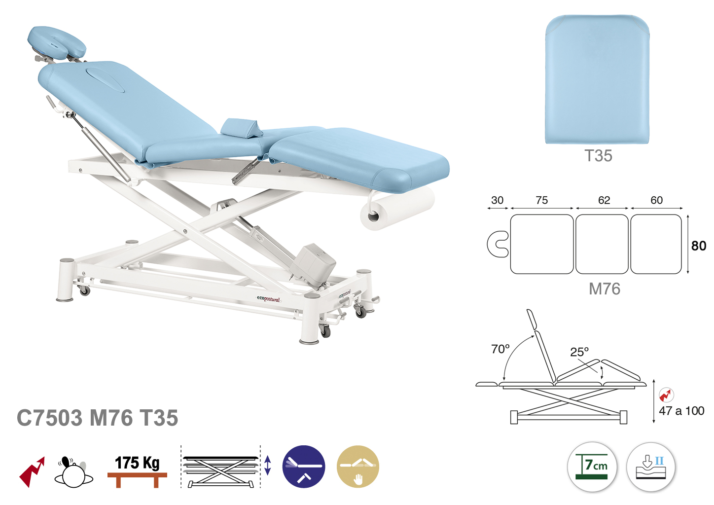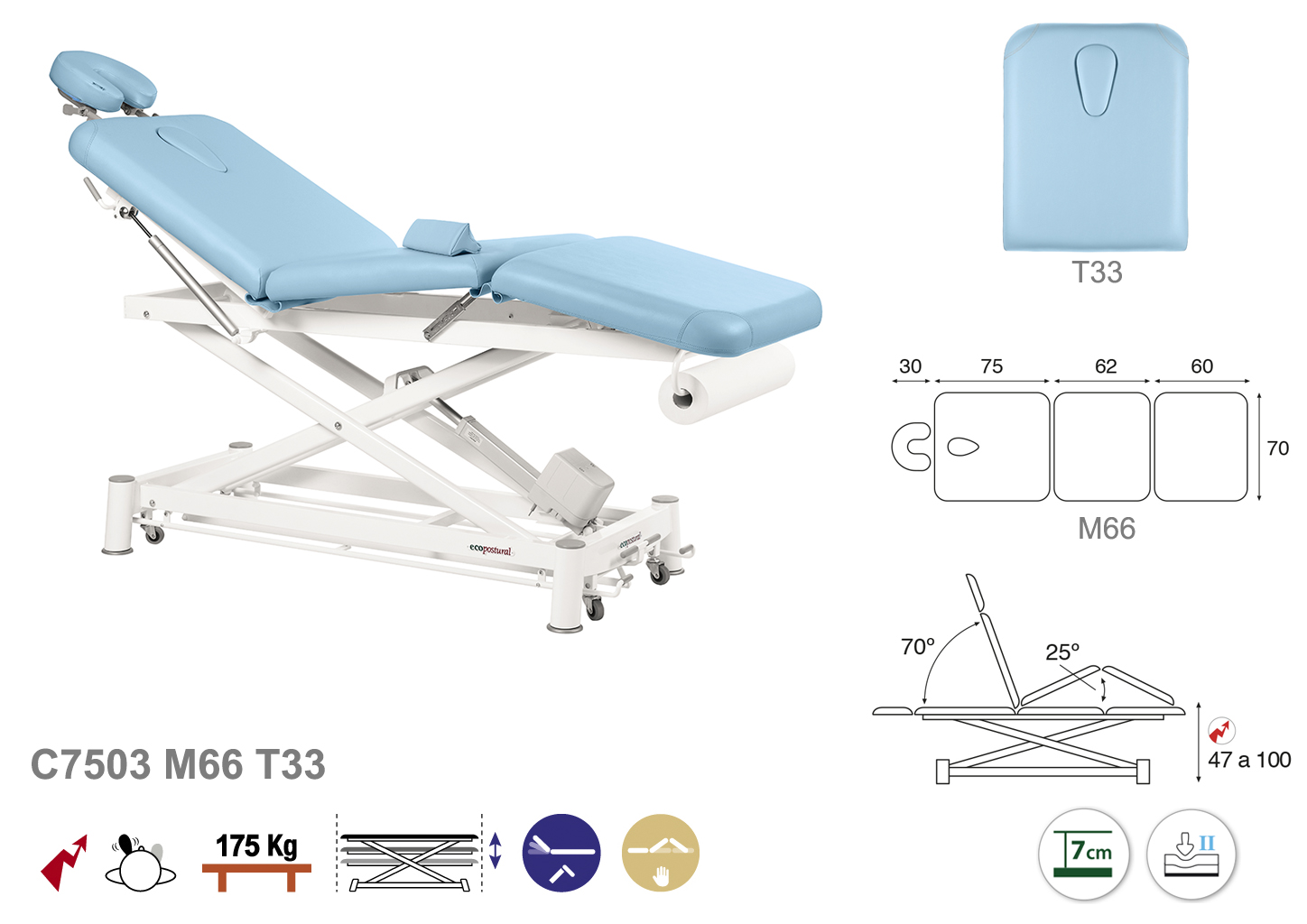 Camilla ecopostural eléctrica de tres cuerpos con estructura de tijera blanca. Anchos disponibles: 70 y 80 cm. Largo 198 cm. Largo del cabezal: 75 cm, reclinable 70º con sistema hidráulico. Parte intermedia, reclinable 25º de forma manual. Altura regulable entre 47 y 100 cm. Posee una firmeza media con espuma de 7 cm de grosor. Control periférico. Incluye portarrollos.