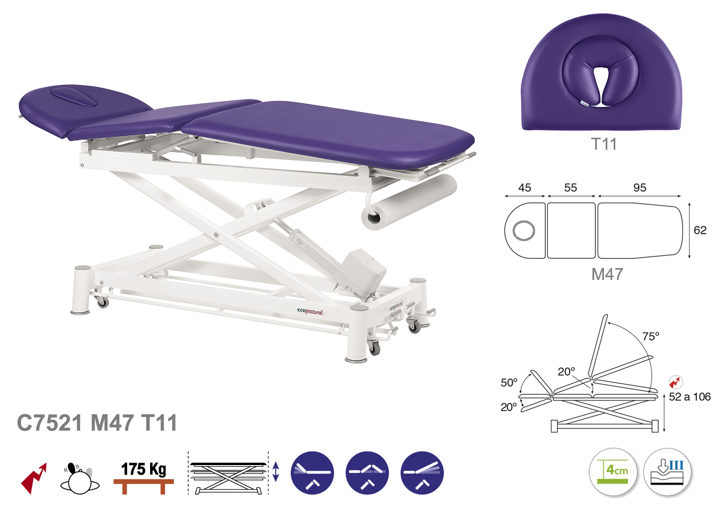 Camilla ecopostural eléctrica de tres cuerpos con estructura de tijera blanca. Ancho: 62 cm. Largo 200 cm. Largo del cabezal: 45 cm, reclinable 50º hacia arriba y 20º hacia abajo con sistema hidráulico. Parte intermedia: reclinable 20º hacia arriba con sistema hidráulico. Parte final, reclinable 75º hacia arriba y hacia abajo con sistema hidráulico. Altura regulable entre 50 y 104 cm. Posee una firmeza semidura y espuma de 4 cm de grosor. Control periférico. Incluye portarrollos.