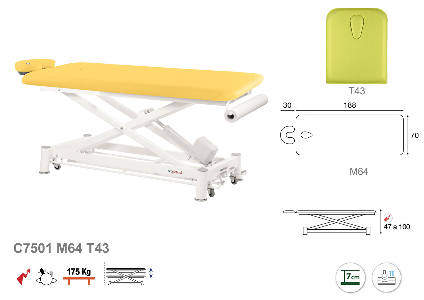 Camilla ecopostural eléctrica de un cuerpo con estructura de tijera blanca. Anchos disponibles: 70 y 80 cm. Largo 188 cm. Altura regulable entre 47 y 100 cm. Posee una firmeza media con espuma de 7 cm de grosor. Control periférico. Incluye portarrollos.