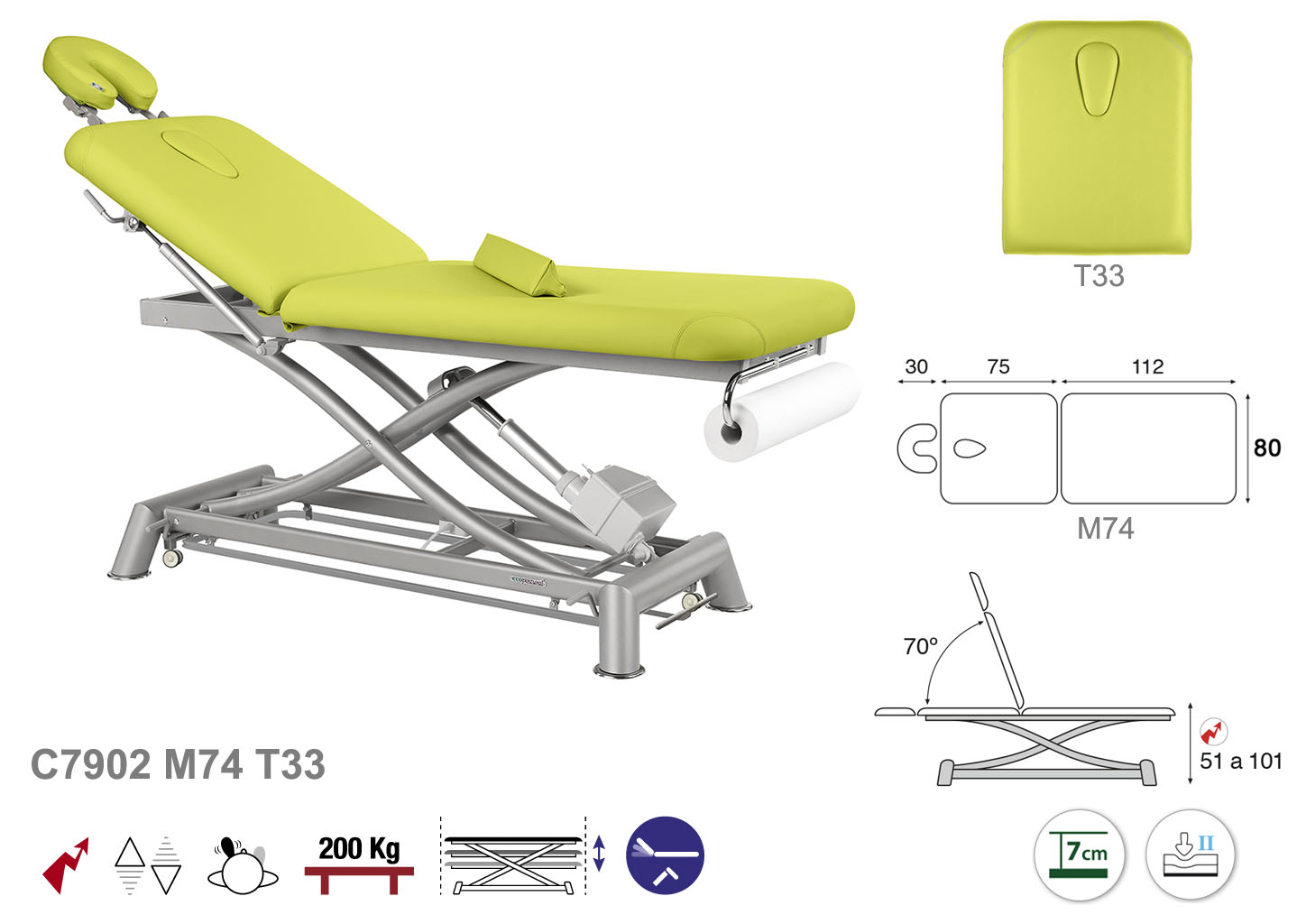 Camilla ecopostural eléctrica de dos cuerpos con estructura de tijera gris. Anchos disponibles: 70 y 80 cm. Largo 188 cm. Largo del cabezal: 75 cm, reclinable 70º. Altura regulable entre 51 y 101 cm con sistema hidráulico. Posee una firmeza media con espuma de 7 cm de grosor. Control periférico y motor rápido. Incluye portarrollos.