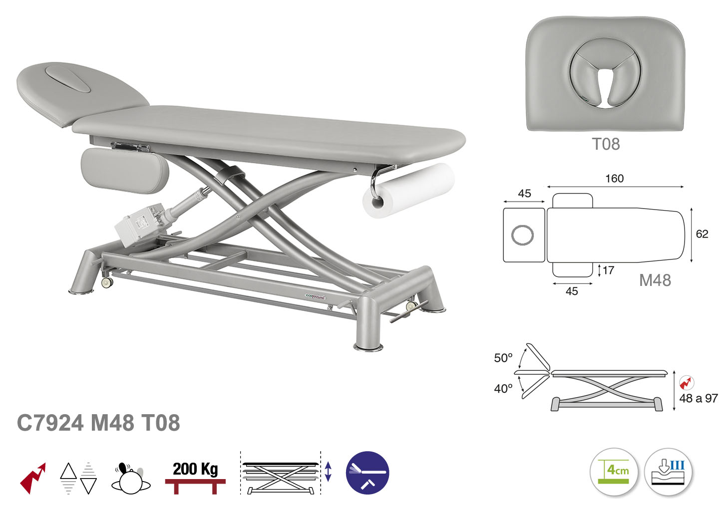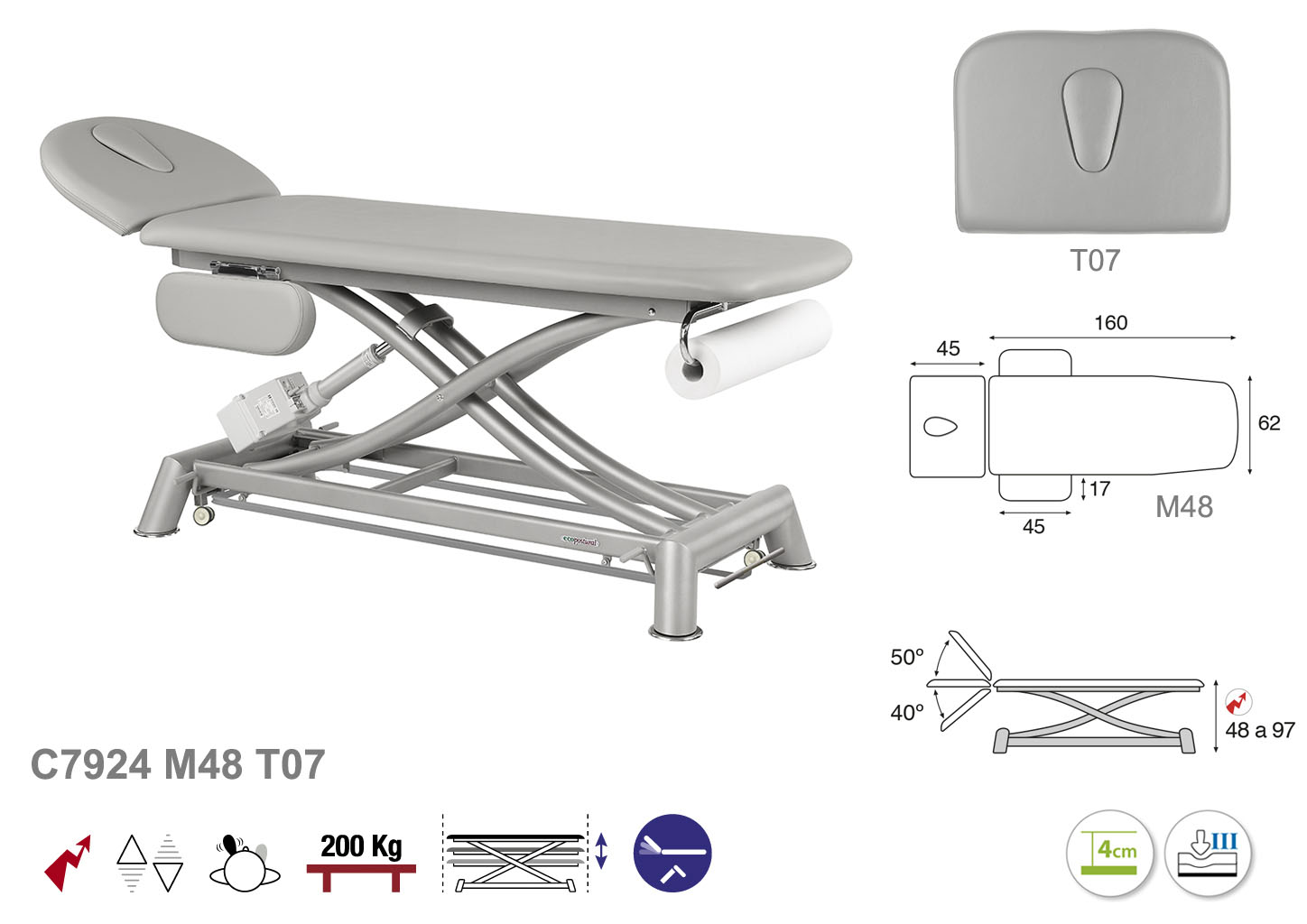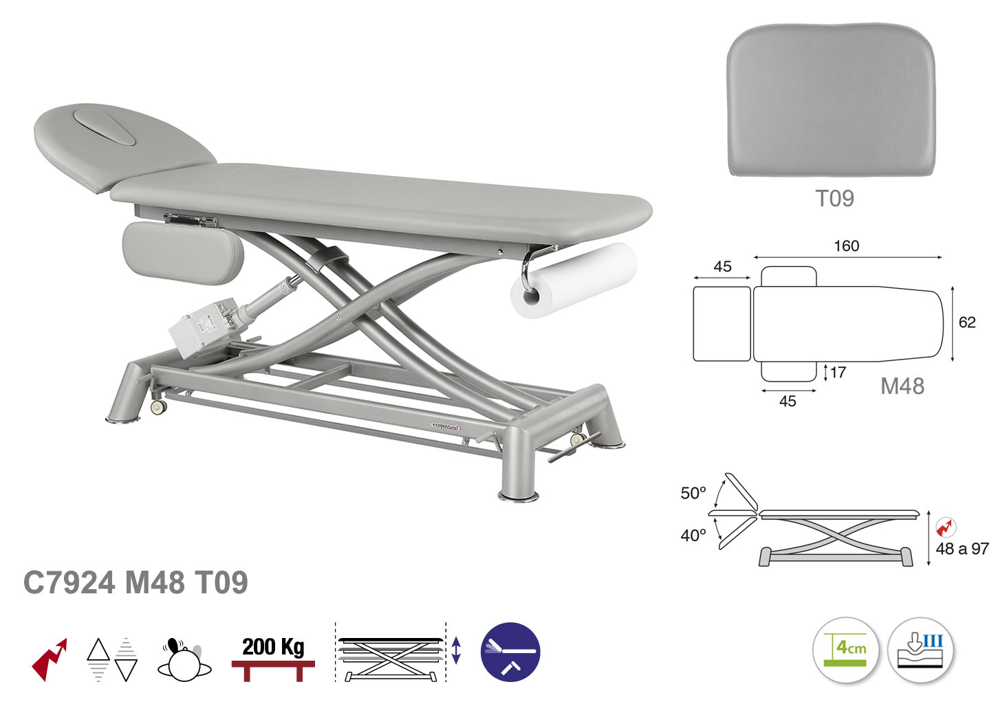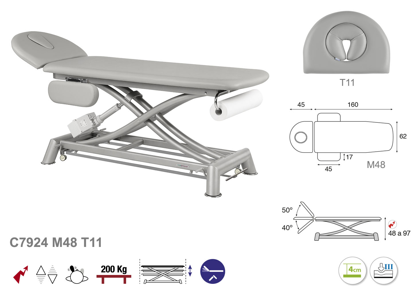Camilla ecopostural eléctrica de dos cuerpos con estructura de tijera gris con reposabrazos. Ancho camilla: 62 cm. Largo 207 cm. Largo del cabezal: 45 cm, reclinable 50º hacia arriba y 40º hacia abajo con sistema hidráulico. Altura regulable entre 48 y 97 cm. Posee una firmeza semidura y espuma de 4 cm de grosor. Control periférico y motor rápido. Incluye portarrollos.