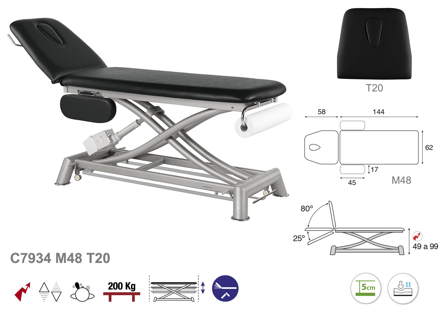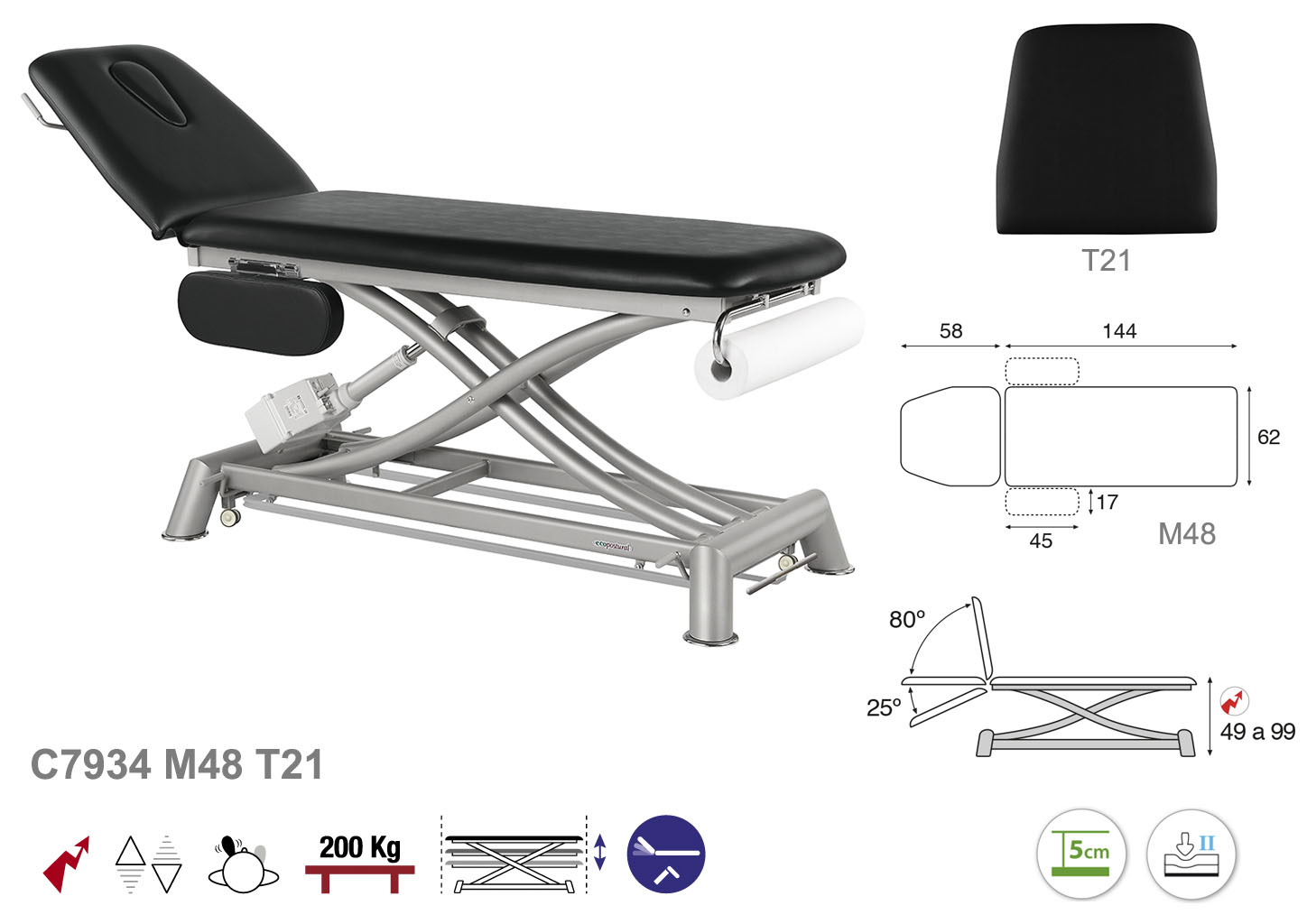 Camilla ecopostural eléctrica de dos cuerpos con estructura de tijera gris con reposbrazos. Ancho: 62 cm. Largo 207 cm. Largo del cabezal: 58 cm, reclinable 80º hacia arriba y 25º hacia abajo con sistema hidráulico. Altura regulable entre 49 y 99 cm. Posee una firmeza media con espuma de 5 cm de grosor. Control periférico y motor rápido. Incluye portarrollos.