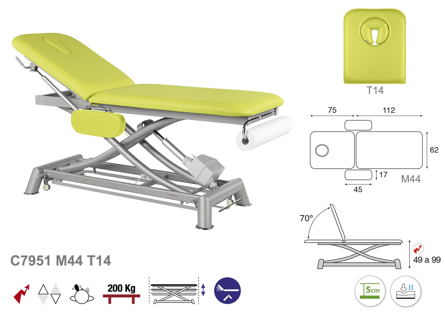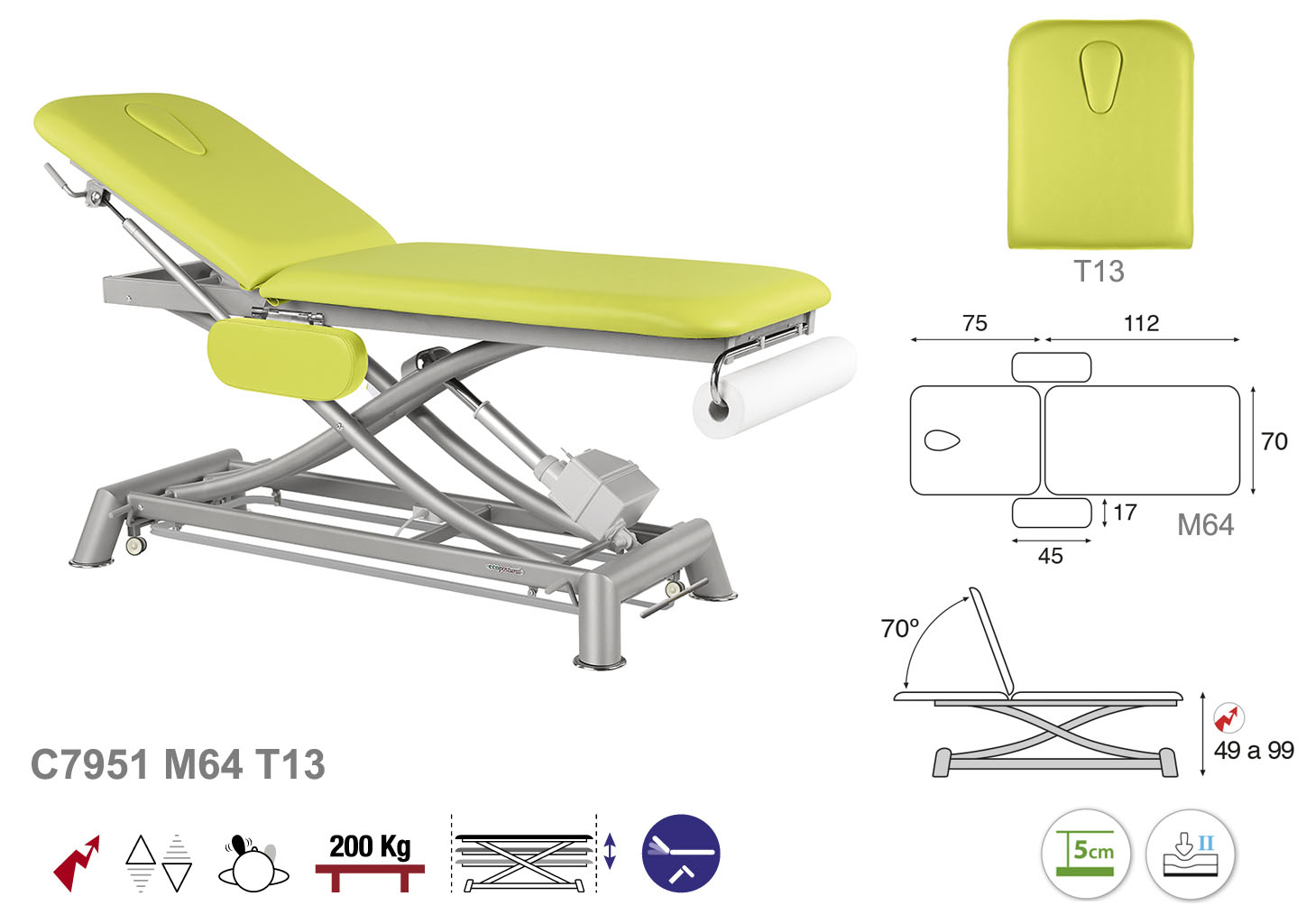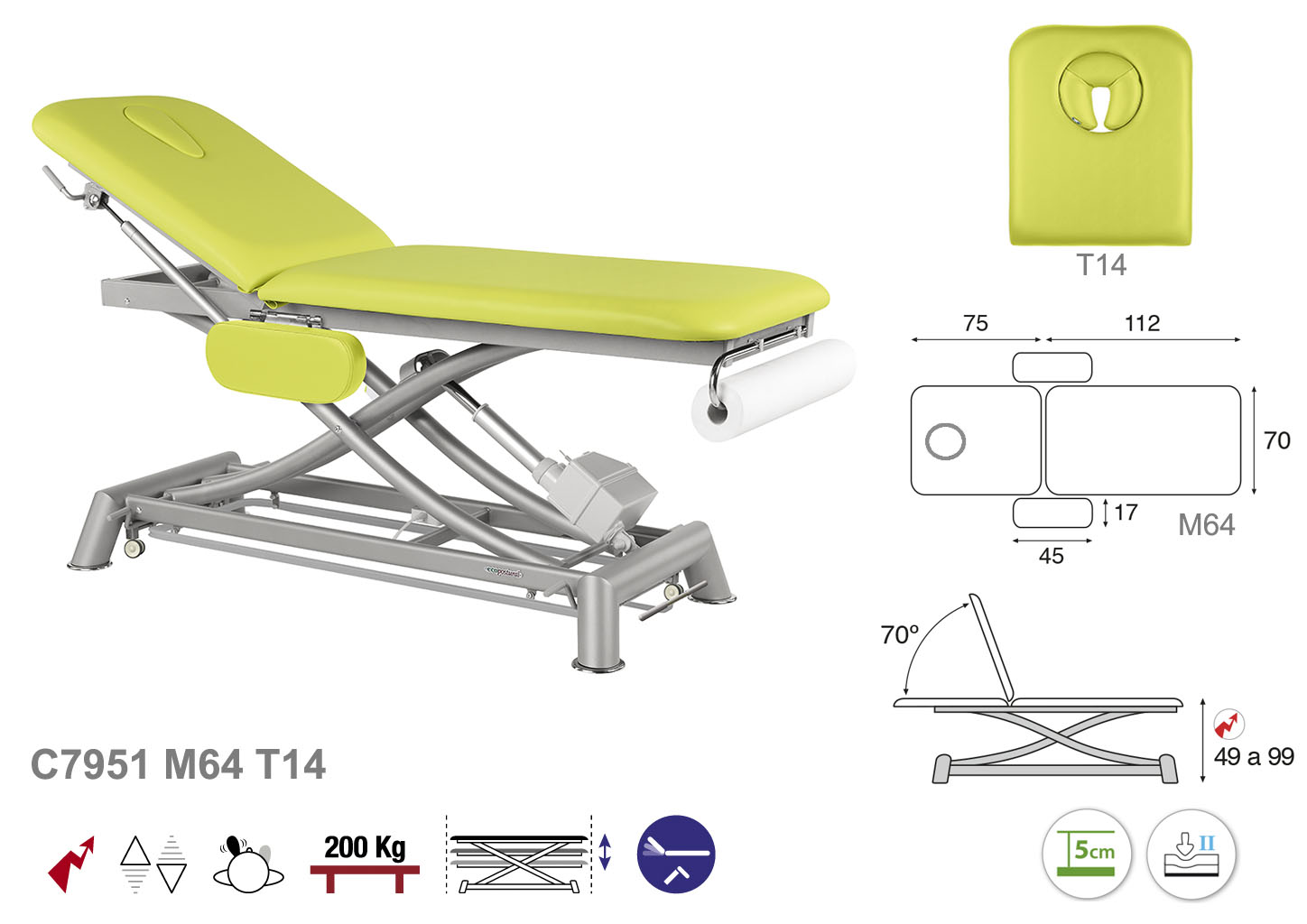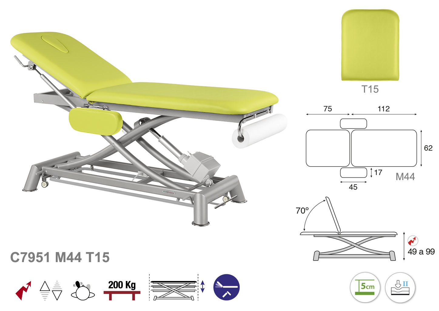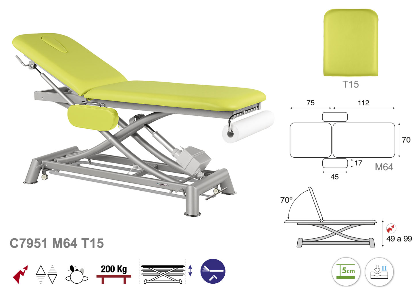 Camilla ecopostural eléctrica de dos cuerpos con estructura de tijera gris con reposabrazos. Anchos disponibles: 62 cm y 70 cm. Largo 188 cm. Largo del cabezal: 75 cm, reclinable 70º con sistema hidráulico. Altura regulable entre 49 y 99 cm. Posee una firmeza media con espuma de 5 cm de grosor. Control periférico y motor rápido. Incluye portarrollos.