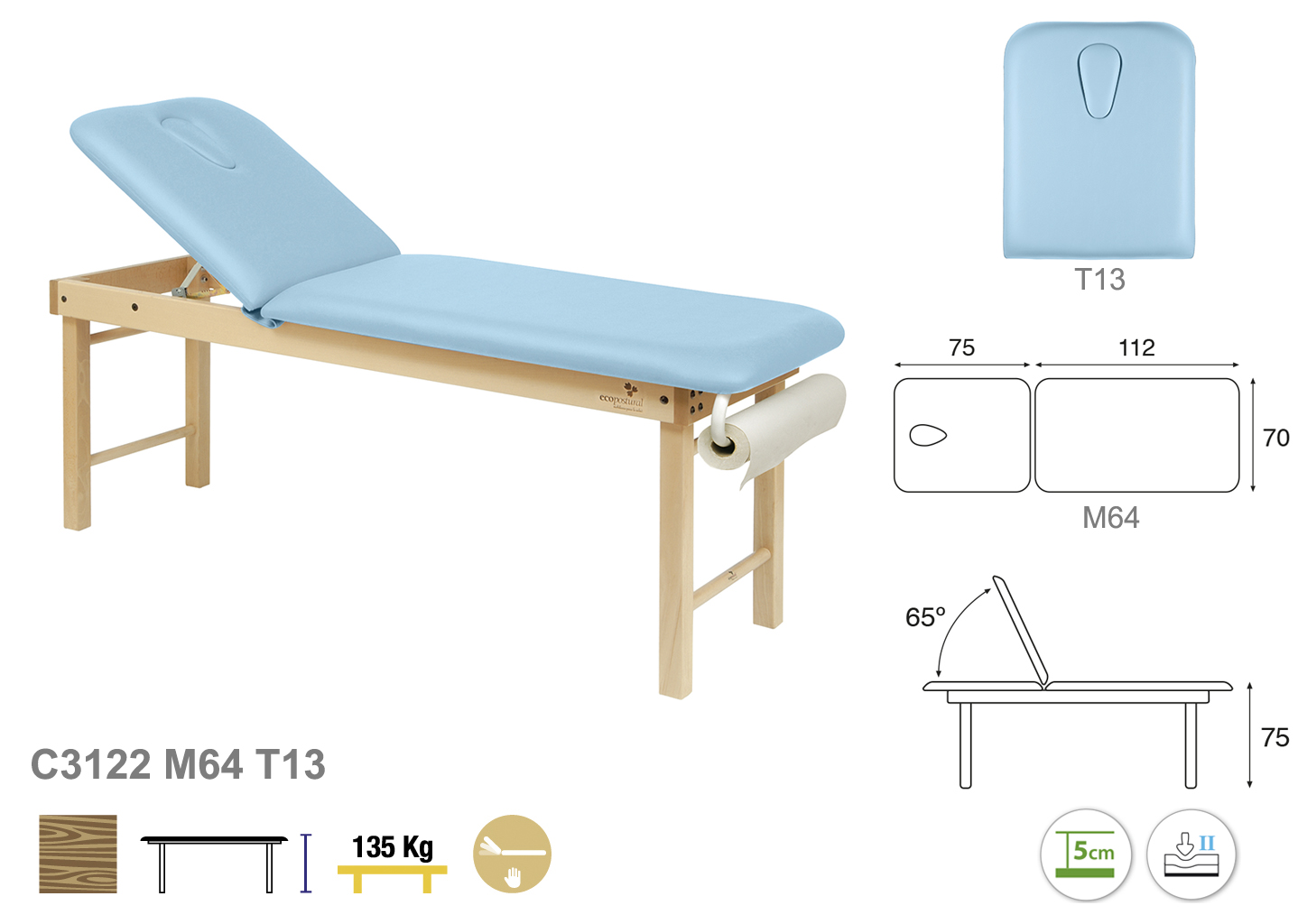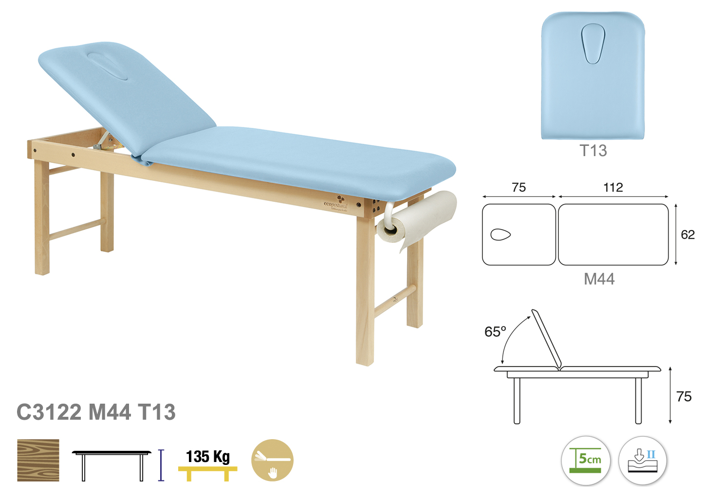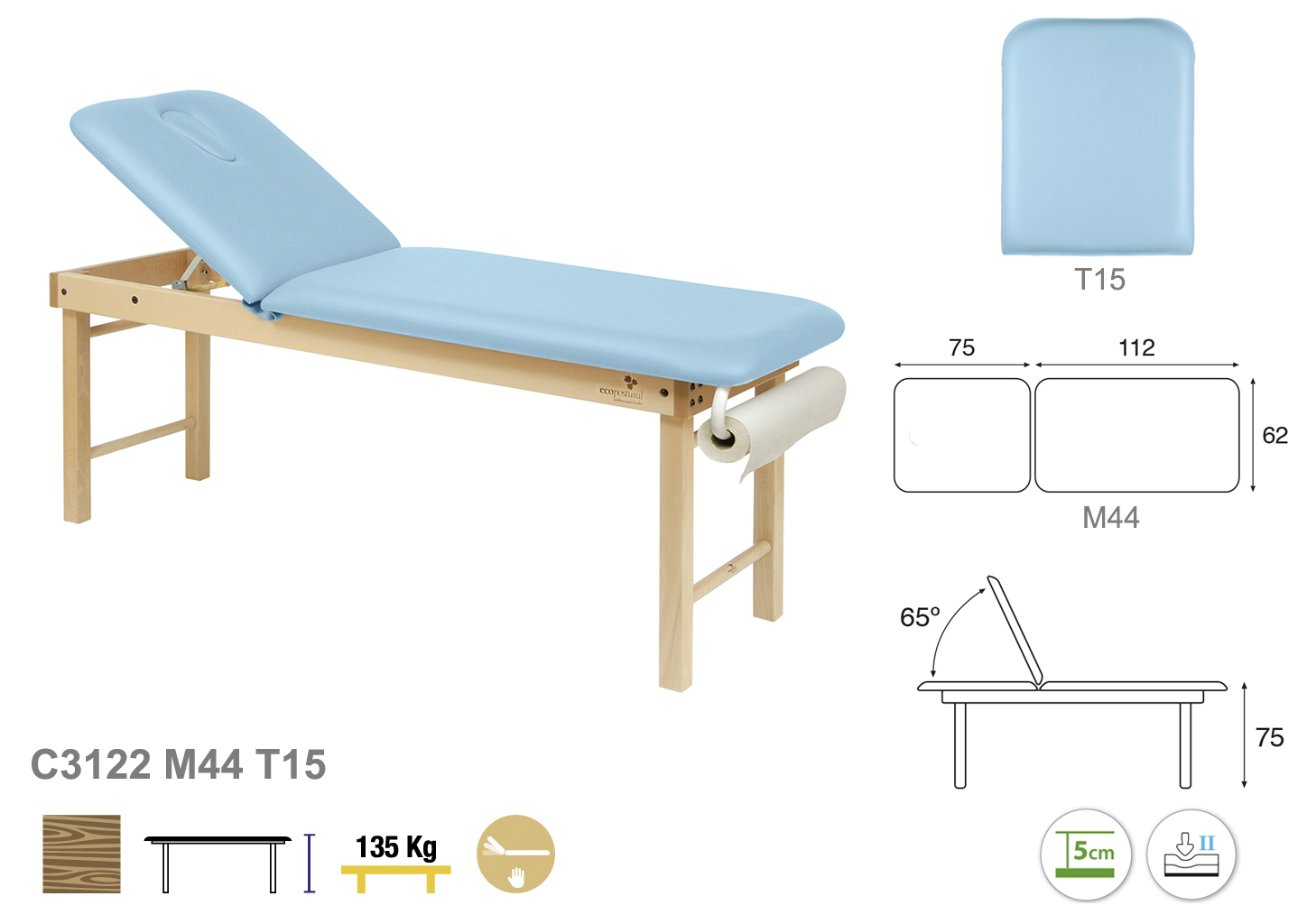 Camilla ecopostural fija de dos cuerpos con estructura de madera natural. Anchos disponibles: 62 cm y 70 cm. Largo 188 cm. Largo del cabezal: 75 cm. Reclinable 65º. Altura regulable entre 62 y 87 cm. Posee una firmeza media con espuma de 5 cm de grosor. Incluye portarrollos.