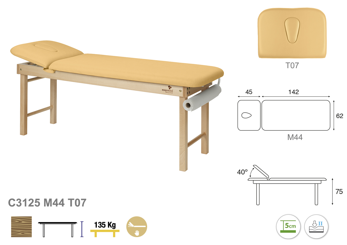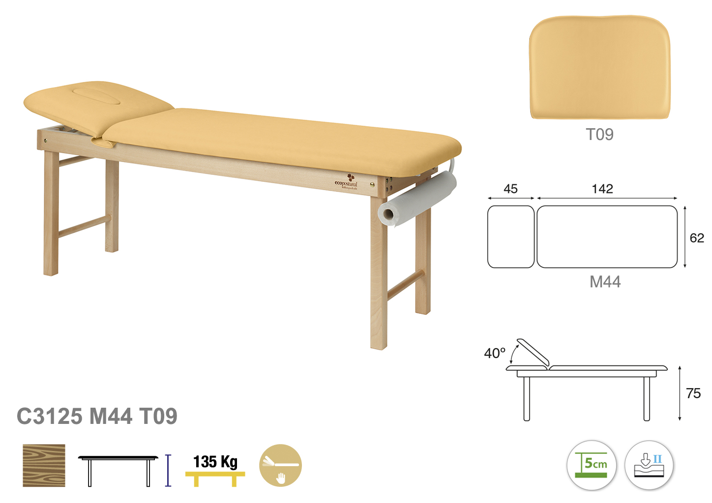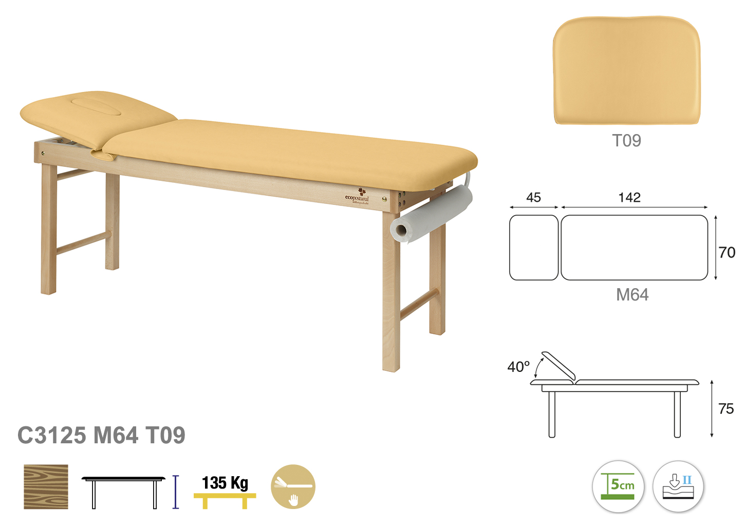 Camilla ecopostural fija de dos cuerpos con estructura de madera natural. Anchos disponibles: 62 cm y 70 cm. Largo 188 cm. Altura fija de 75 cm. Largo del cabezal: 45 cm. Reclinable 40º. Posee una firmeza media con espuma de 5 cm de grosor.