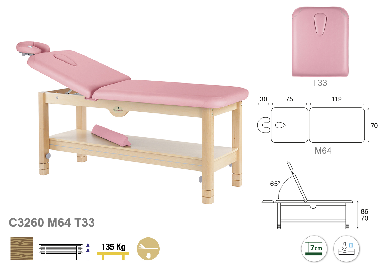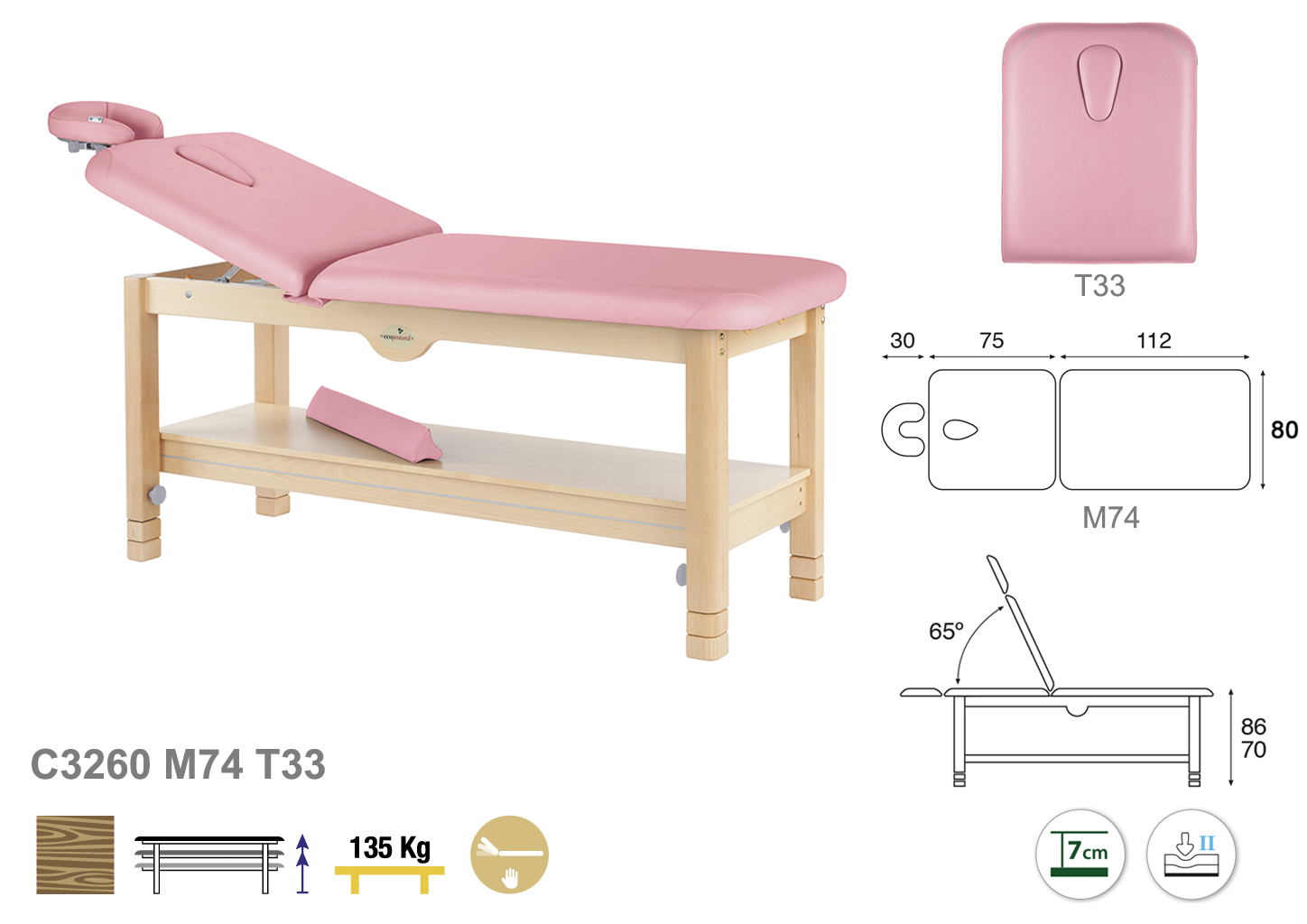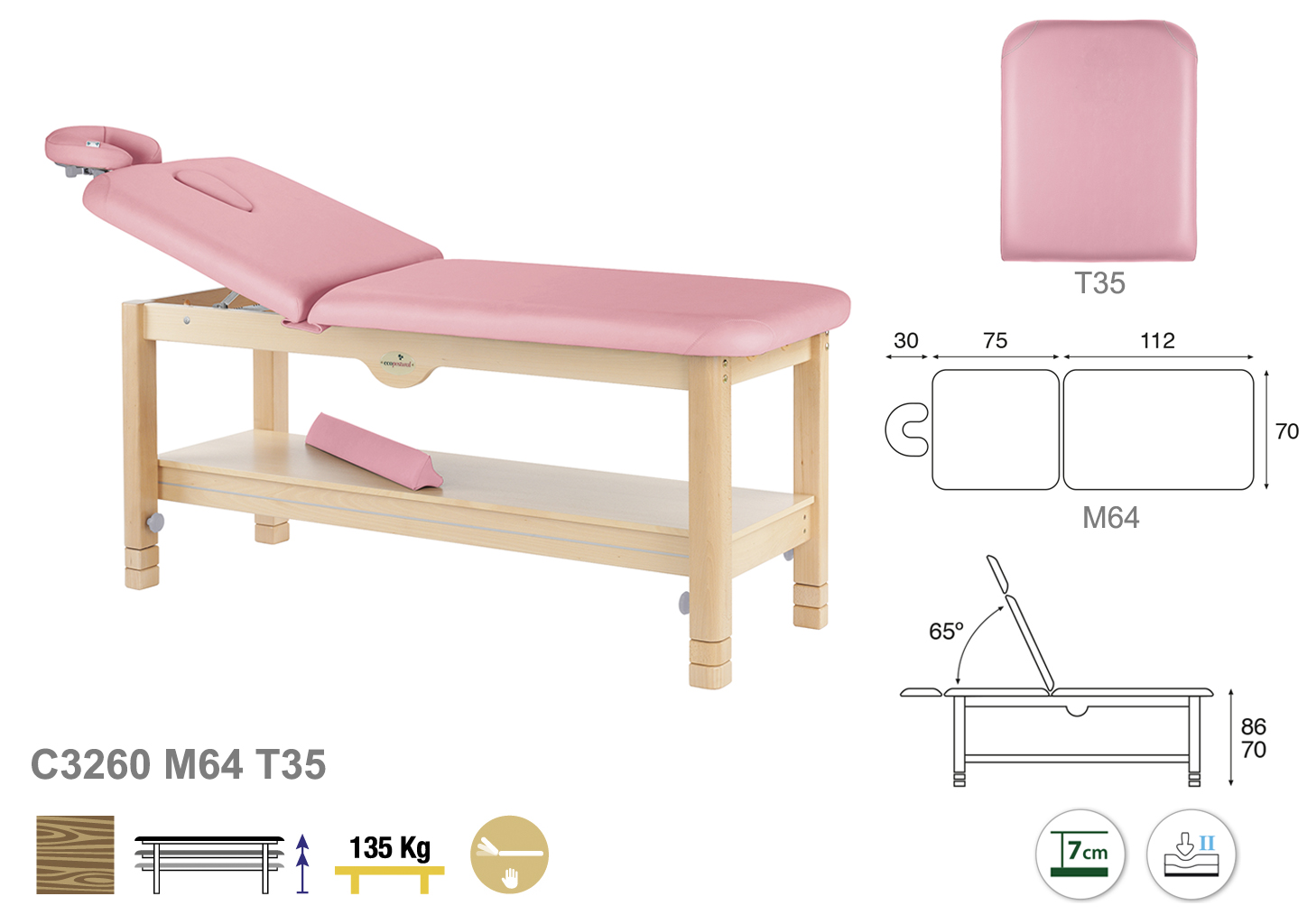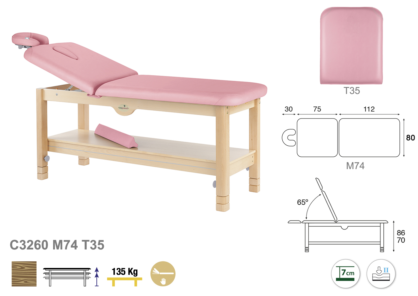 Camilla ecopostural fija de dos cuerpos con estructura de madera natural. Anchos disponibles: 70 cm y 80 cm. Largo 188 cm. Largo del cabezal: 75 cm. Reclinable 65º. Altura regulable entre 70 y 86 cm. Posee una firmeza media con espuma de 7 cm de grosor.
