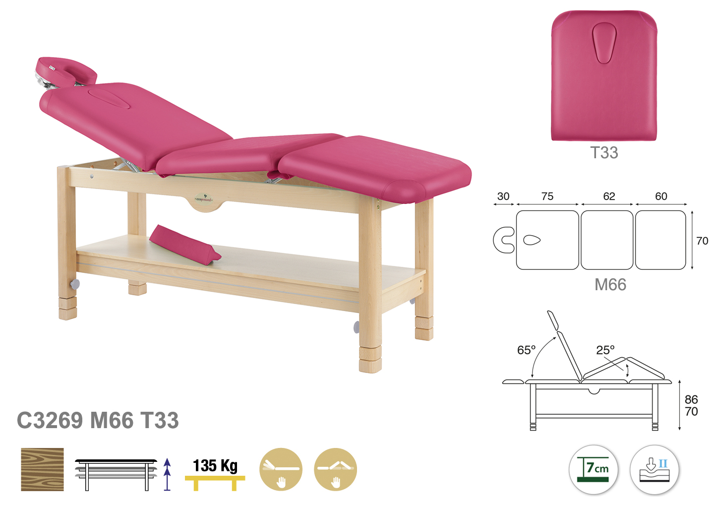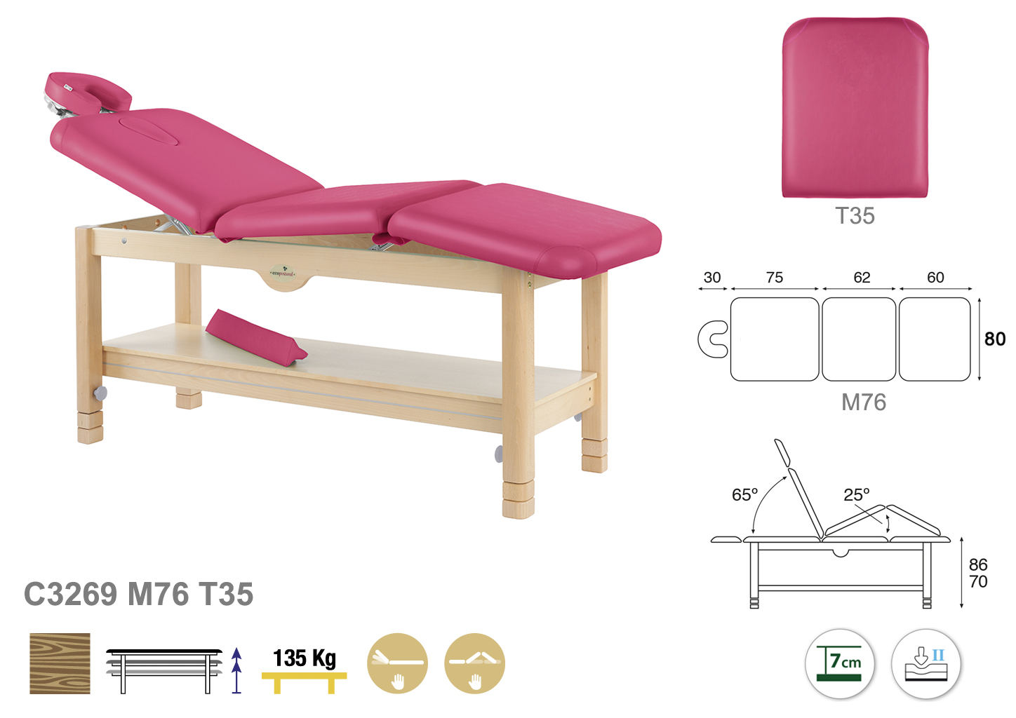 Camilla ecopostural fija de tres cuerpos con estructura de madera natural. Anchos disponibles: 70 cm y 80 cm. Largo 198 cm. Largo del cabezal: 75 cm. Inclinable 65º y 25º. Altura regulable entre 70 y 86 cm. Posee una firmeza media con espuma de 7 cm de grosor.