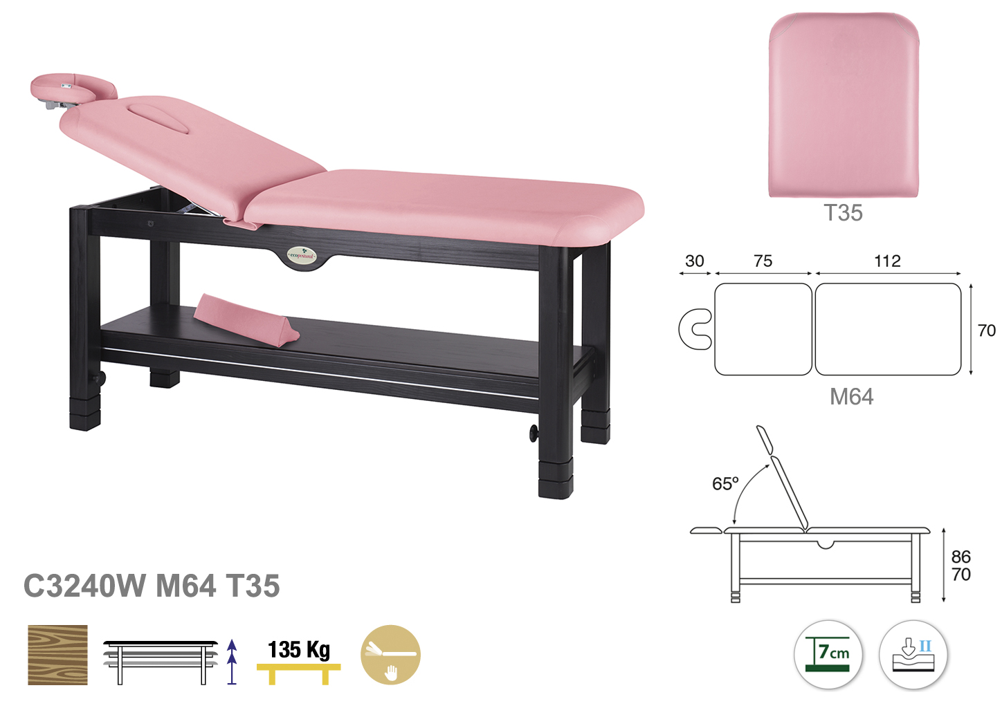 Camilla ecopostural fija de dos cuerpos con estructura de madera wengué. Anchos disponibles: 70 cm y 80 cm. Largo 188 cm. Largo del cabezal: 75 cm. Reclinable 65º. Altura regulable entre 70 y 86 cm. Posee una firmeza media con espuma de 7 cm de grosor.