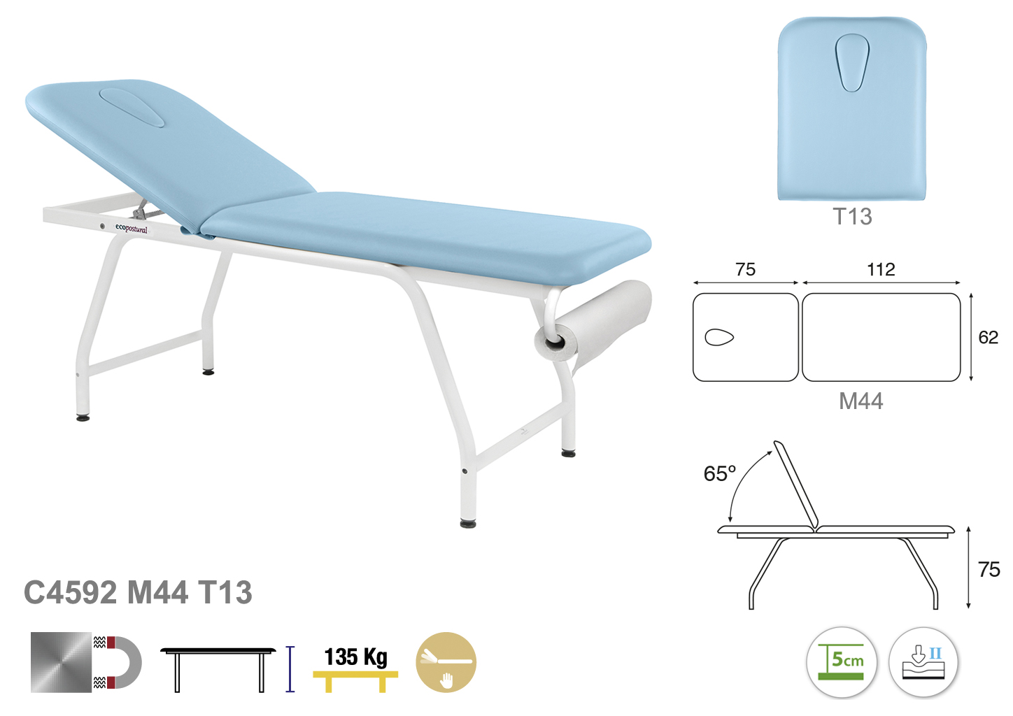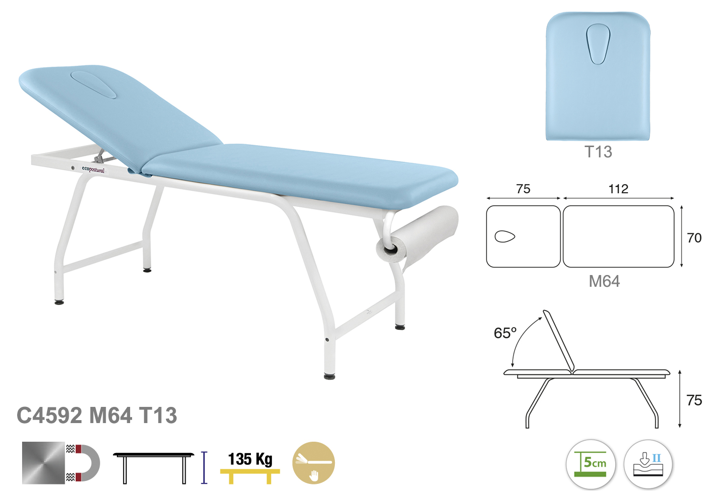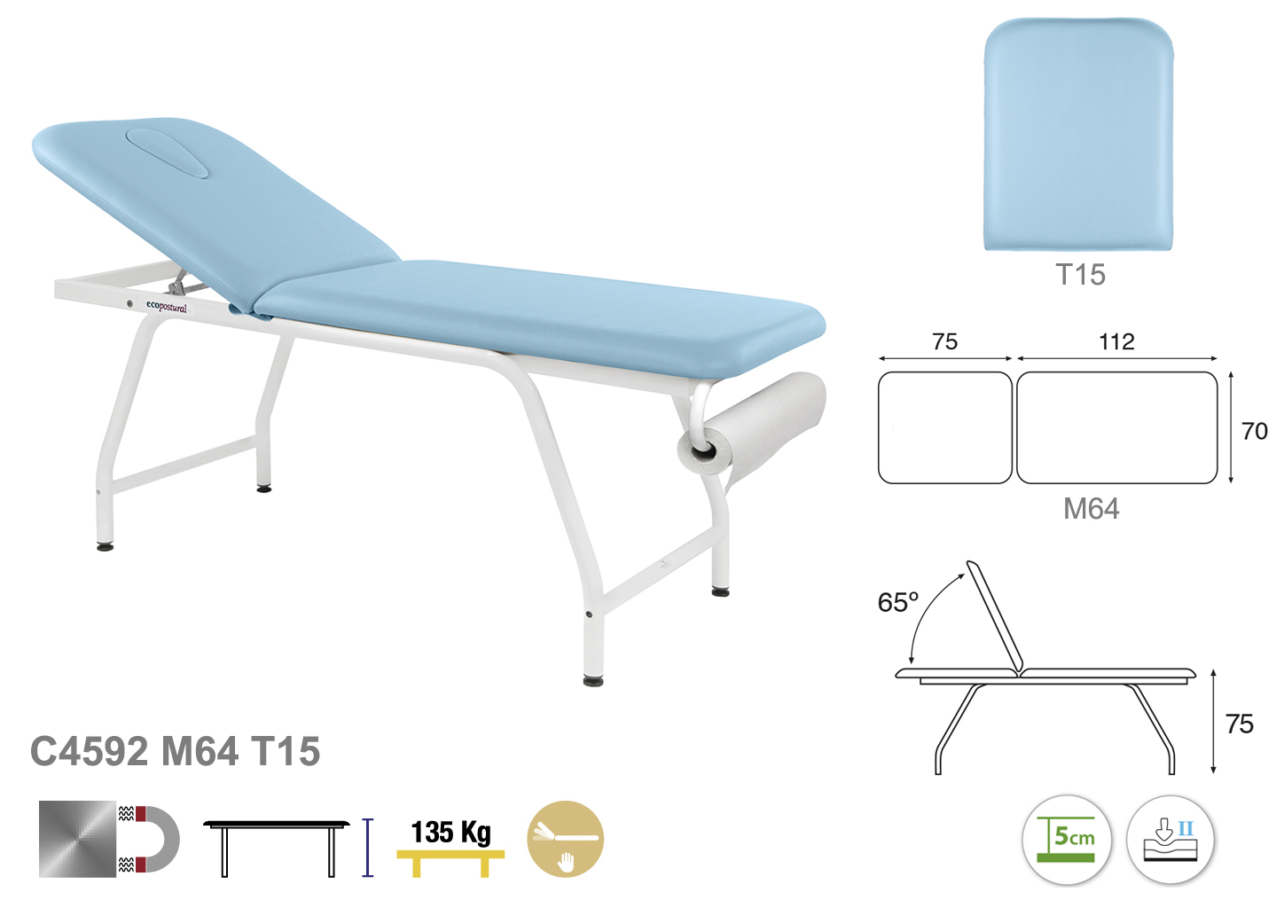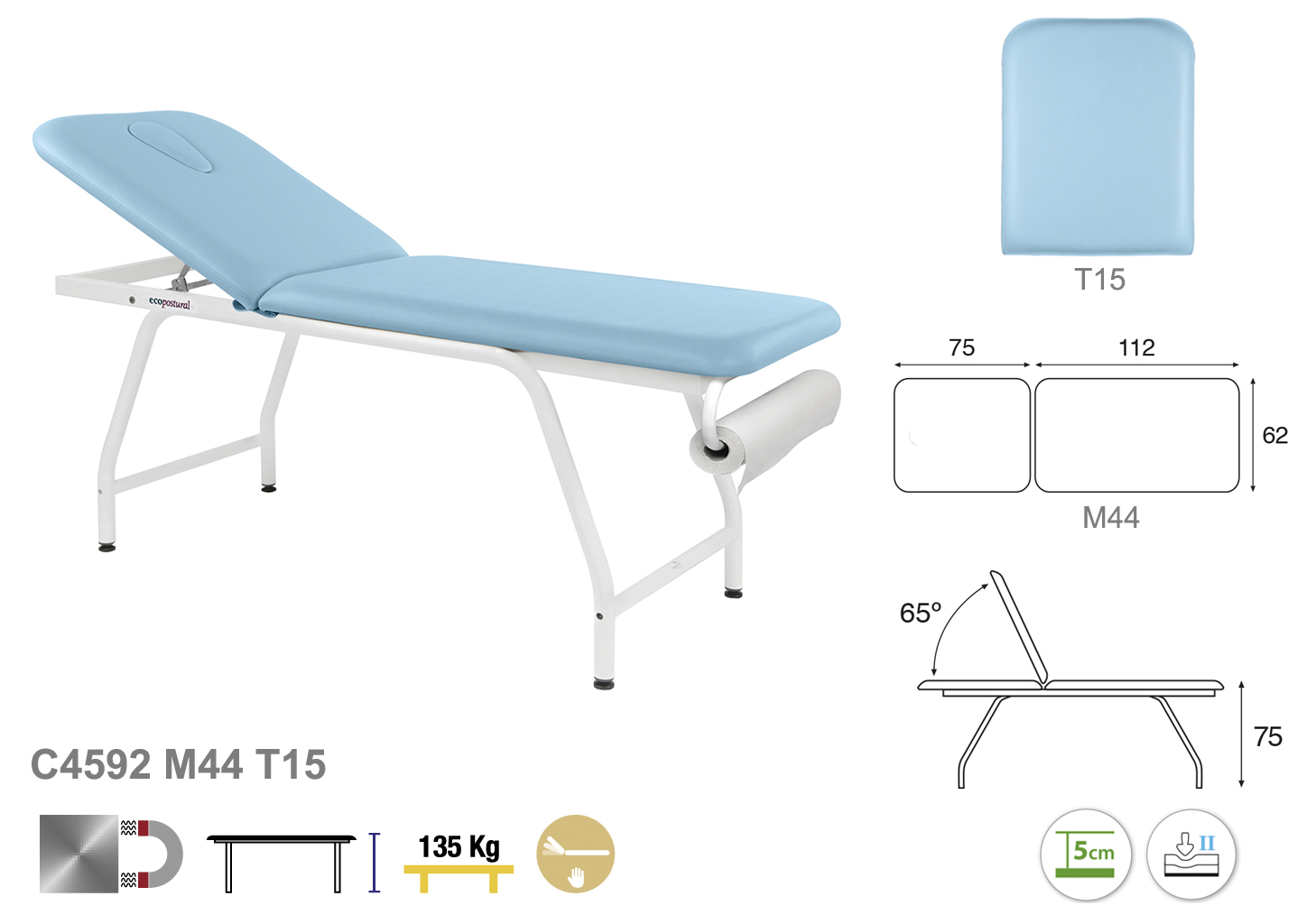 Camilla ecopostural fija de dos cuerpos con estructura metálica de color blanco. Anchos disponibles: 62 cm y 70 cm. Largo 188 cm. Altura fija de 75 cm. Largo del cabezal: 75 cm. Reclinable 65º. Posee una firmeza media con espuma de 5 cm de grosor.