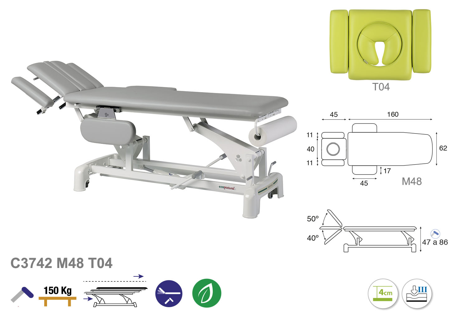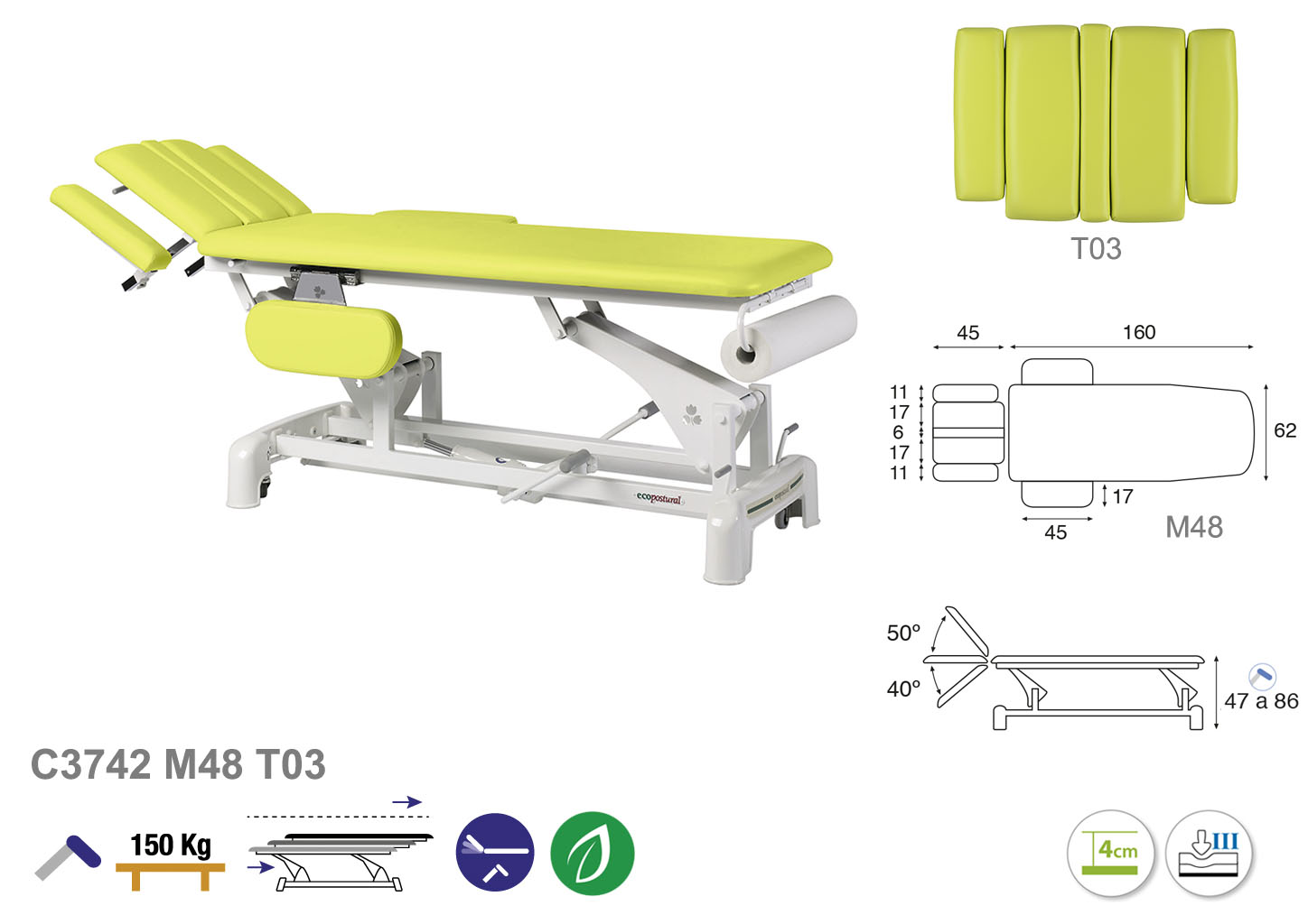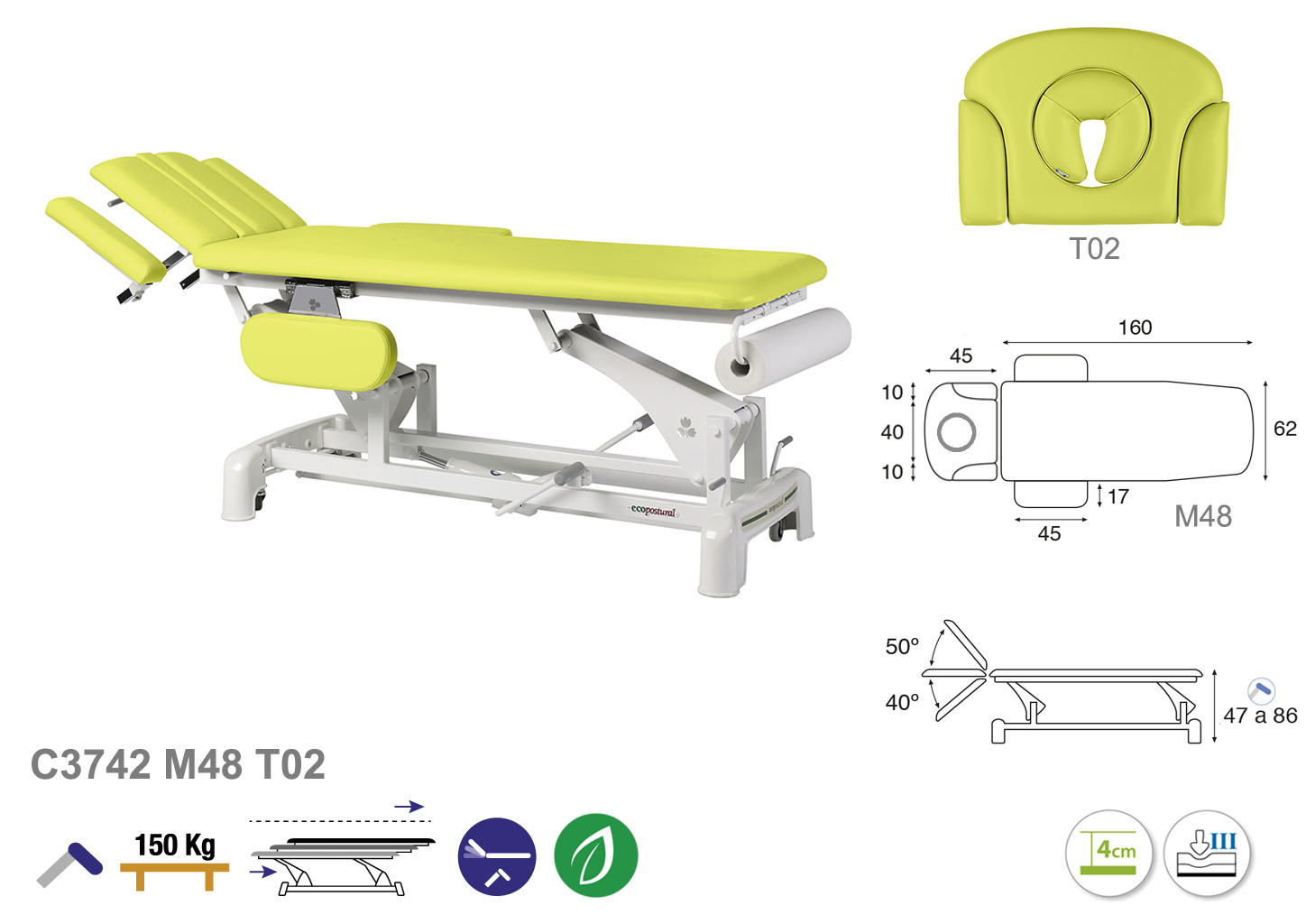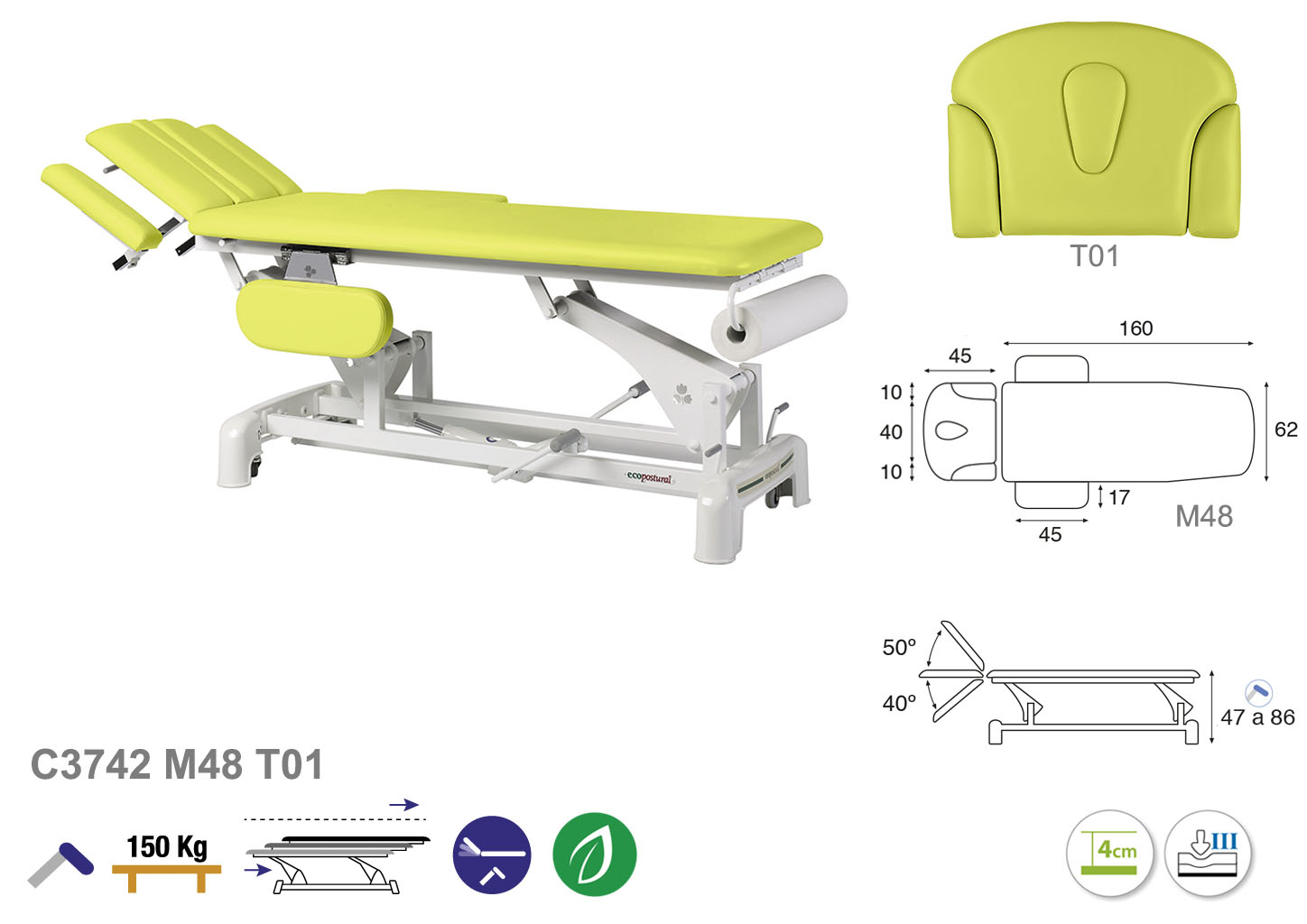 Camilla ecopostural hidráulica de dos cuerpos con estructura de biela blanca con reposabrazos. Ancho: 62 cm. Largo 207 cm. Largo del cabezal: 45 cm, reclinable 50º hacia arriba y 40º hacia abajo. Altura regulable entre 47 y 86 cm con desplazamiento lateral. Posee una firmeza semidura y espuma de 4 cm de grosor. Incluye portarrollos.