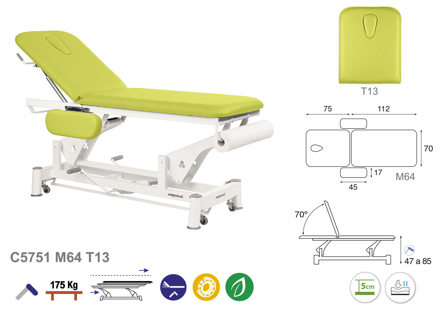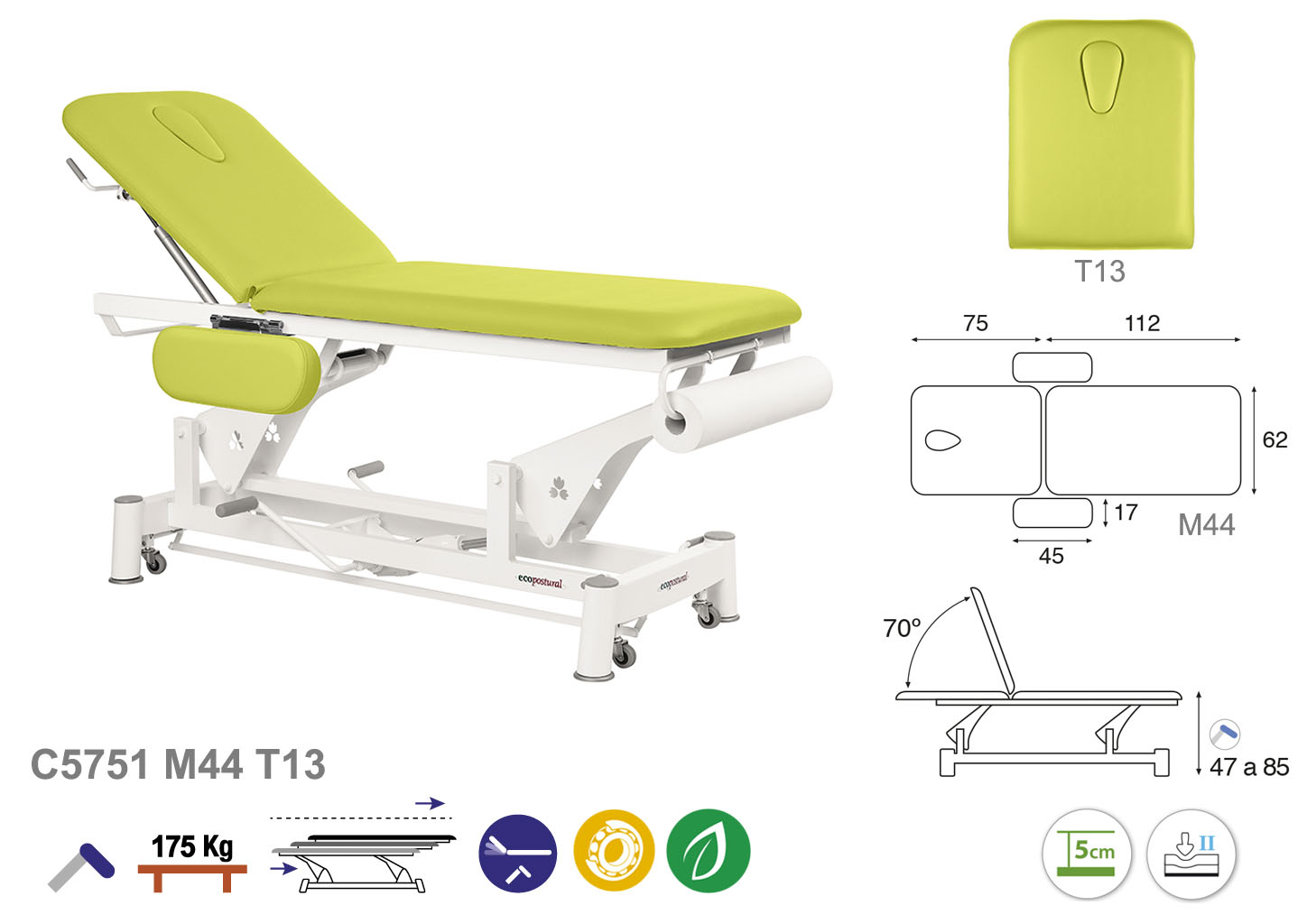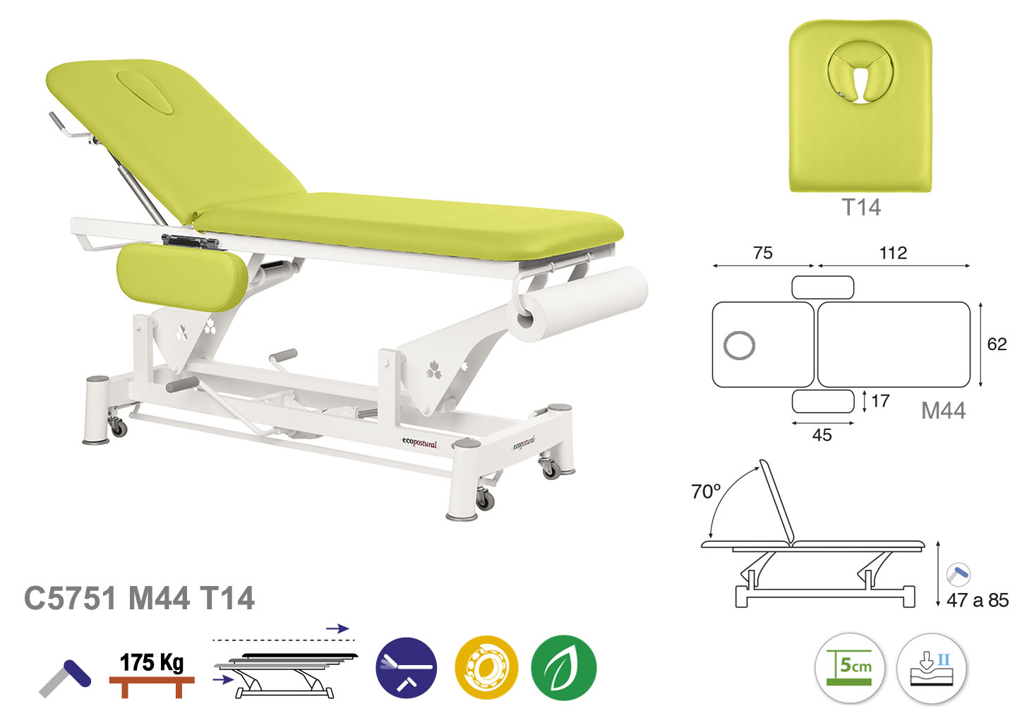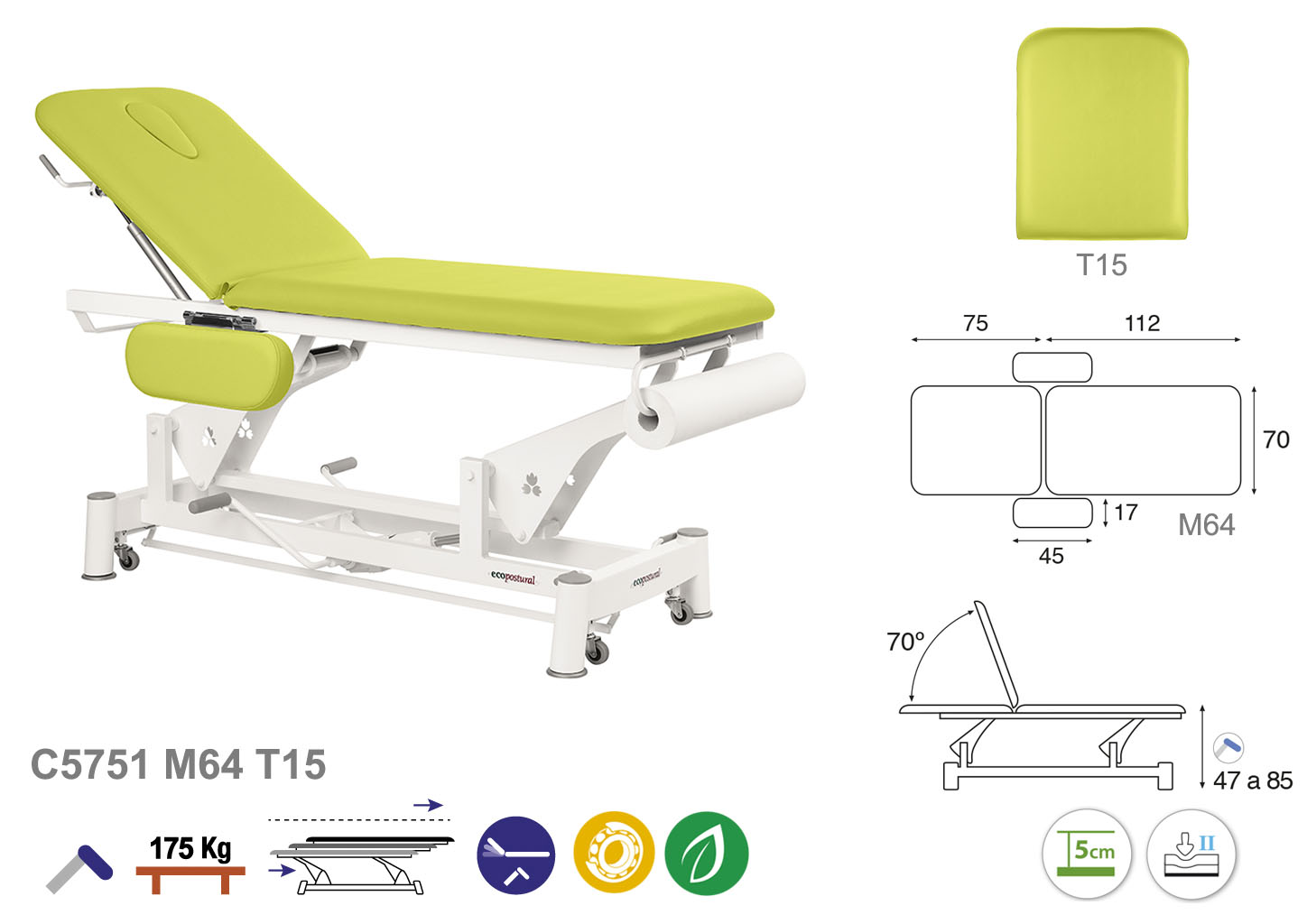 Camilla ecopostural hidráulica de dos cuerpos con estructura de biela blanca con reposabrazos. Anchos disponibles: 62 cm y 70 cm. Largo 188 cm. Largo del cabezal: 75 cm, reclinable 70º. Altura regulable entre 47 y 85 cm con desplazamiento lateral. Posee una firmeza media con espuma de 5 cm de grosor. Incluye portarrollos.