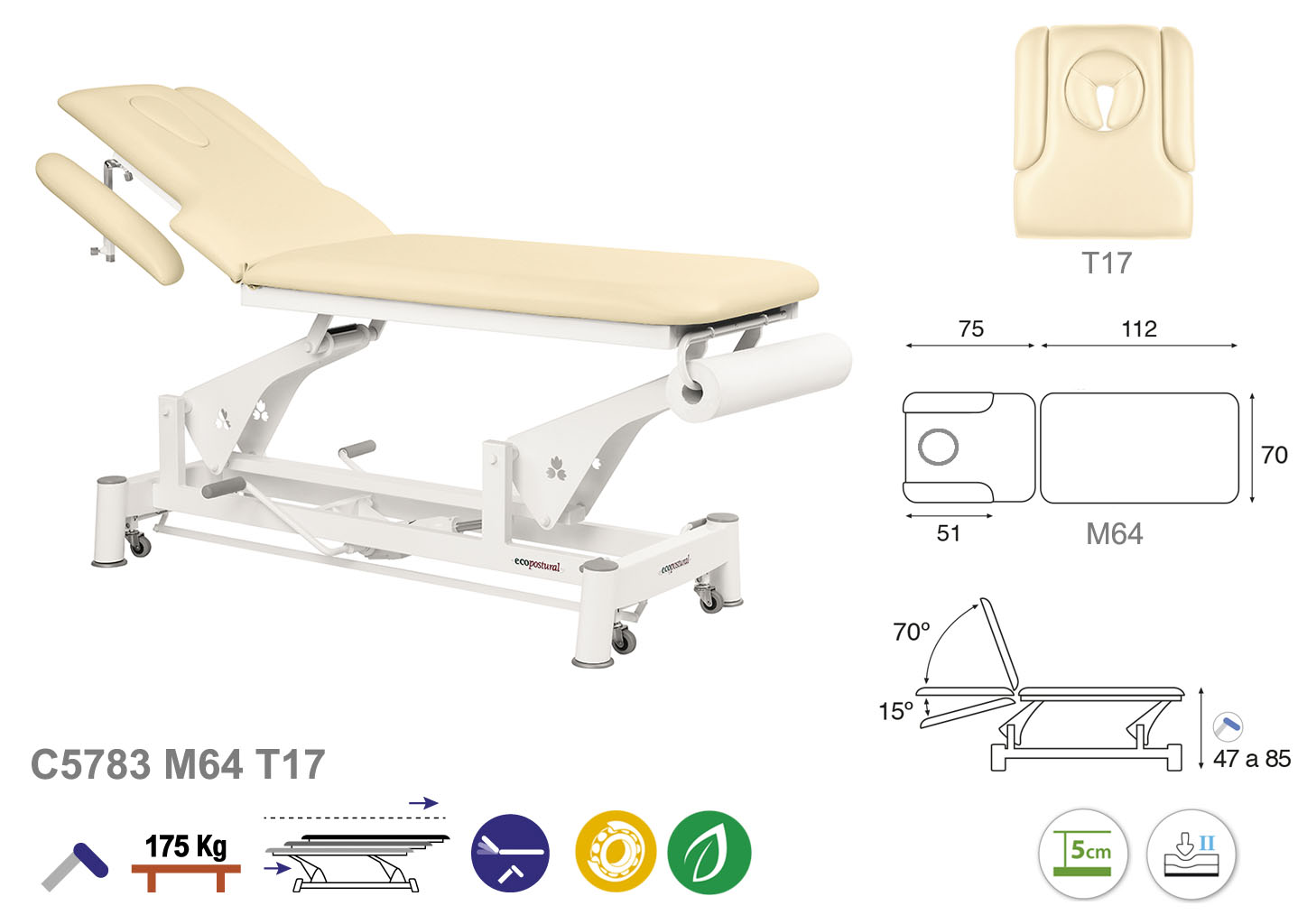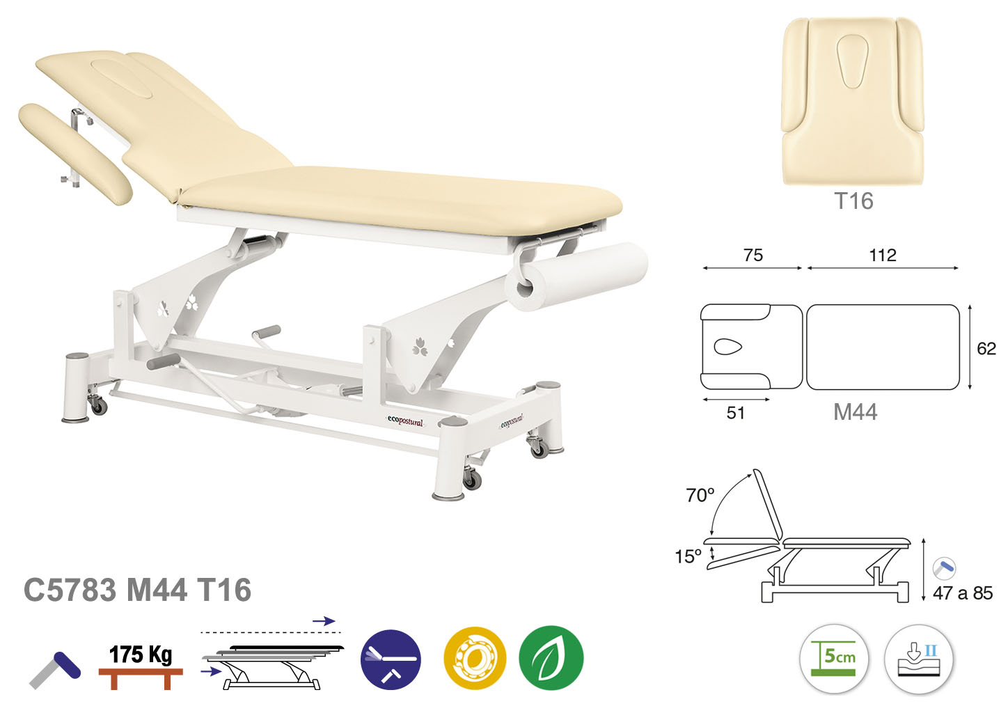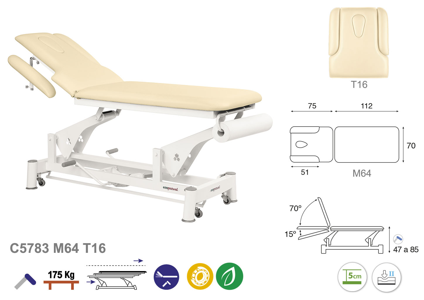 Camilla ecopostural hidráulica de dos cuerpos con estructura de biela blanca. Anchos disponibles: 62 cm y 70 cm. Largo 188 cm. Largo del cabezal: 75 cm, reclinable 70º hacia arriba y 15 º hacia abajo. Altura regulable entre 47 y 85 cm con desplazamiento lateral. Posee una firmeza media con espuma de 5 cm de grosor. Incluye portarrollos.