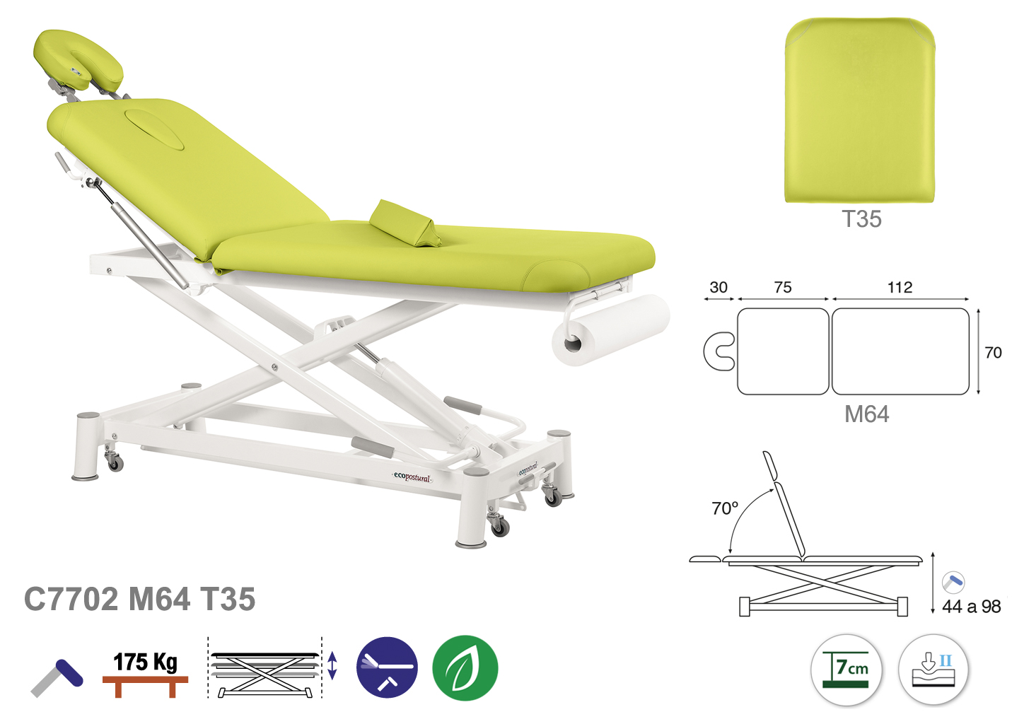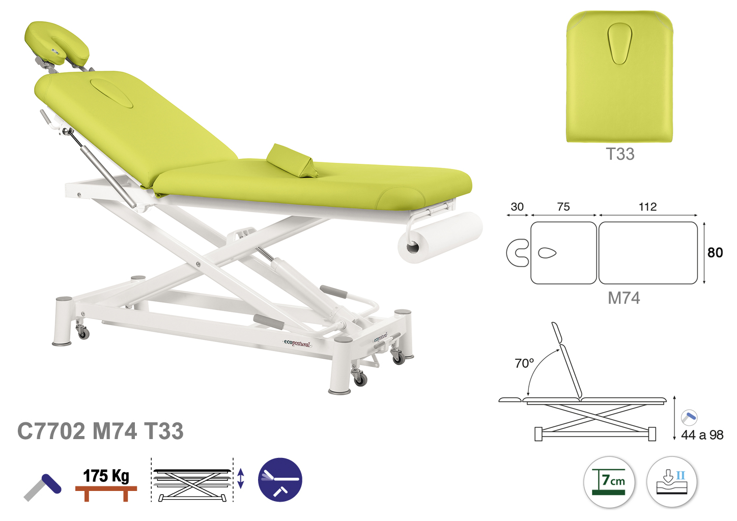 Camilla ecopostural hidráulica de dos cuerpos con estructura de tijera blanca. Anchos disponibles: 70 y 80 cm. Largo 188 cm. Largo del cabezal: 75 cm, reclinable 70º. Altura regulable entre 44 y 96 cm. Posee una firmeza media con espuma de 7 cm de grosor. Incluye portarrollos.