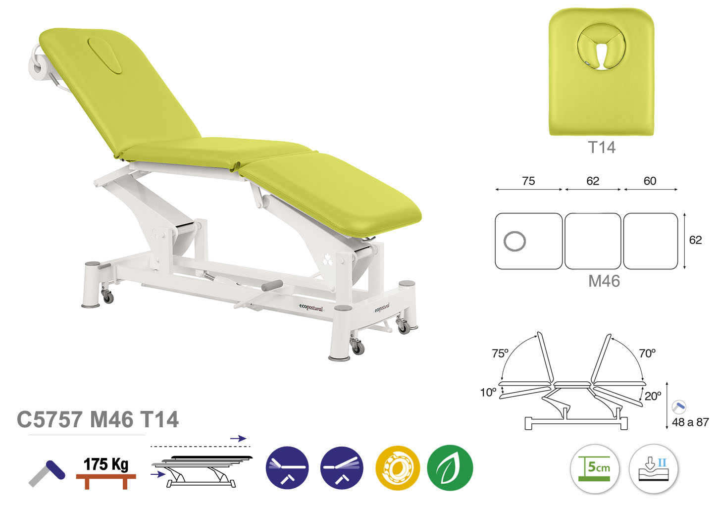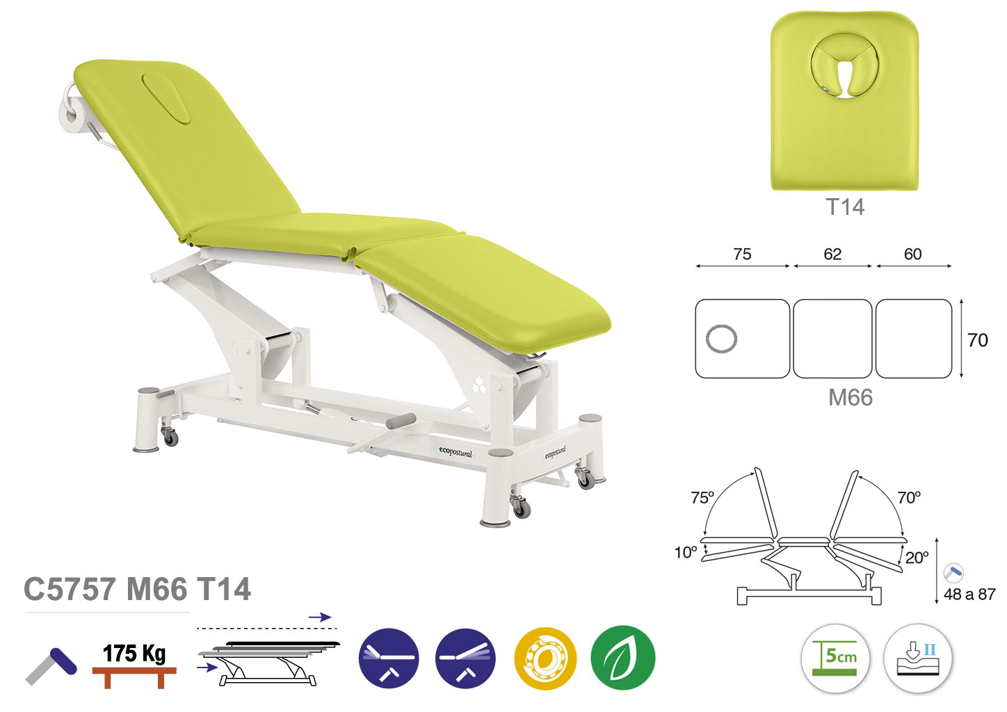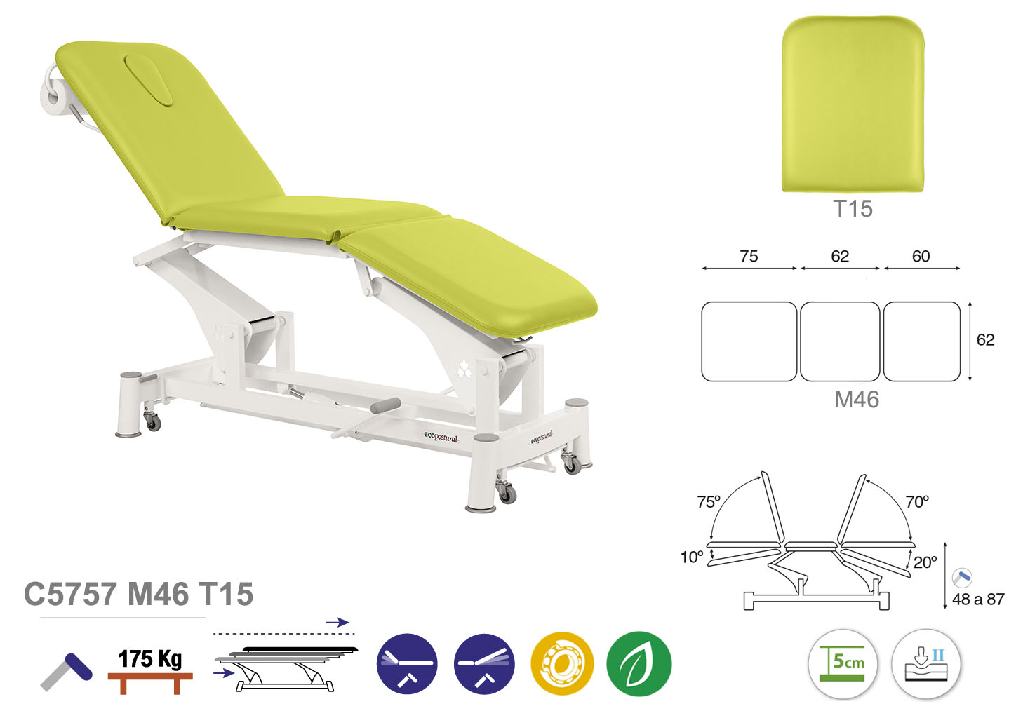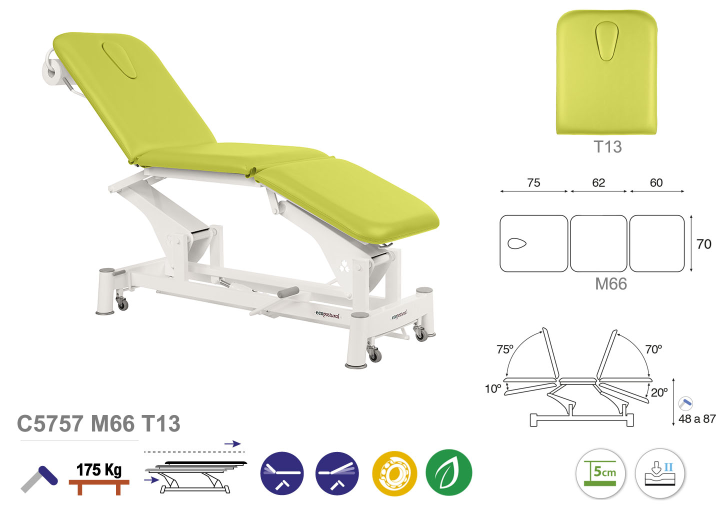 Camilla ecopostural hidráulica de tres cuerpos con estructura de biela blanca. Anchos disponibles: 62 cm y 70 cm. Largo 198 cm. Largo del cabezal: 75 cm, reclinable 75º hacia arriba y 10º hacia abajo. Parte final: reclinable 70º hacia arriba y 20º hacia abajo. Altura regulable entre 48 y 87 cm con desplazamiento lateral. Posee una firmeza media con espuma de 5 cm de grosor. Incluye portarrollos.