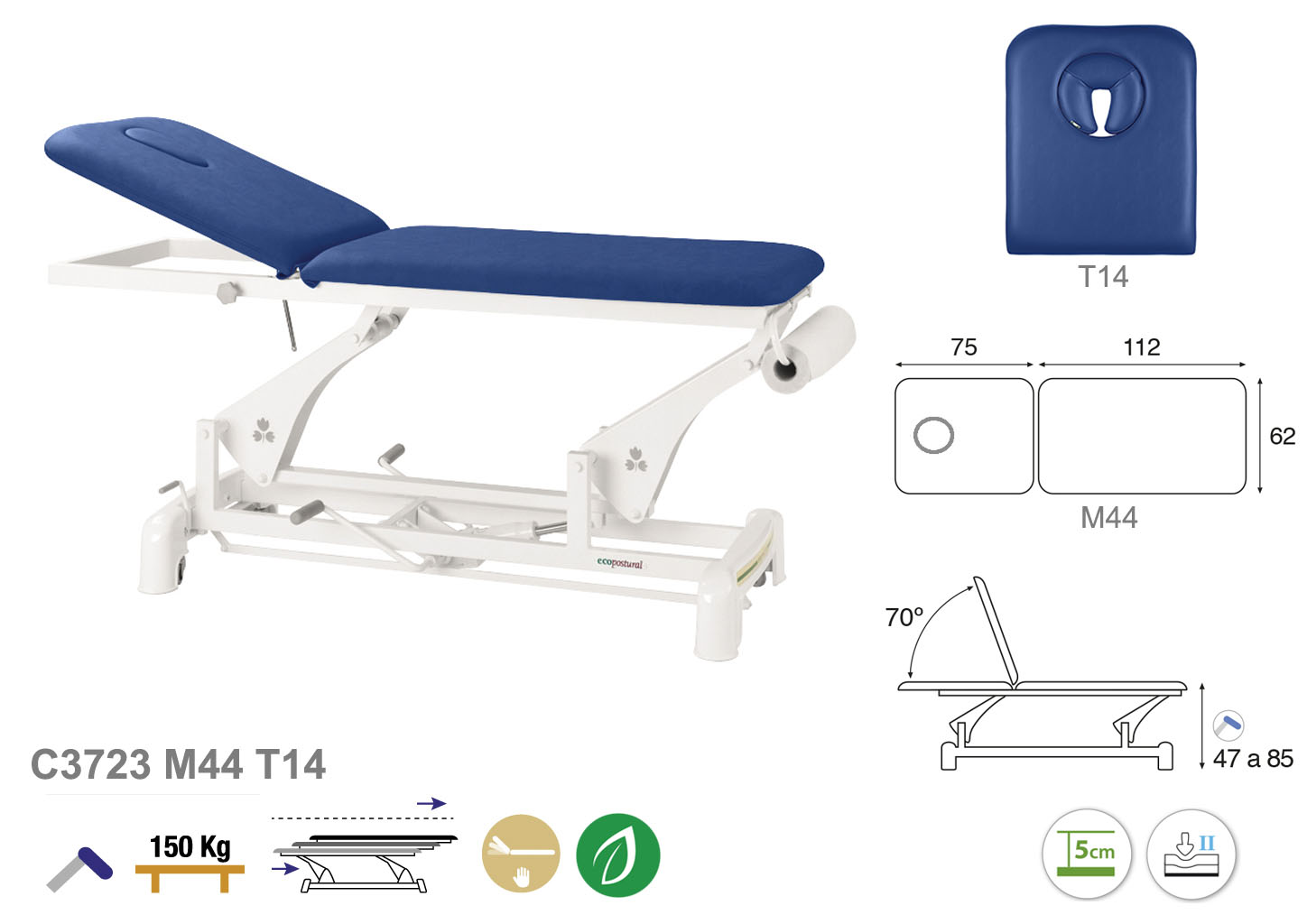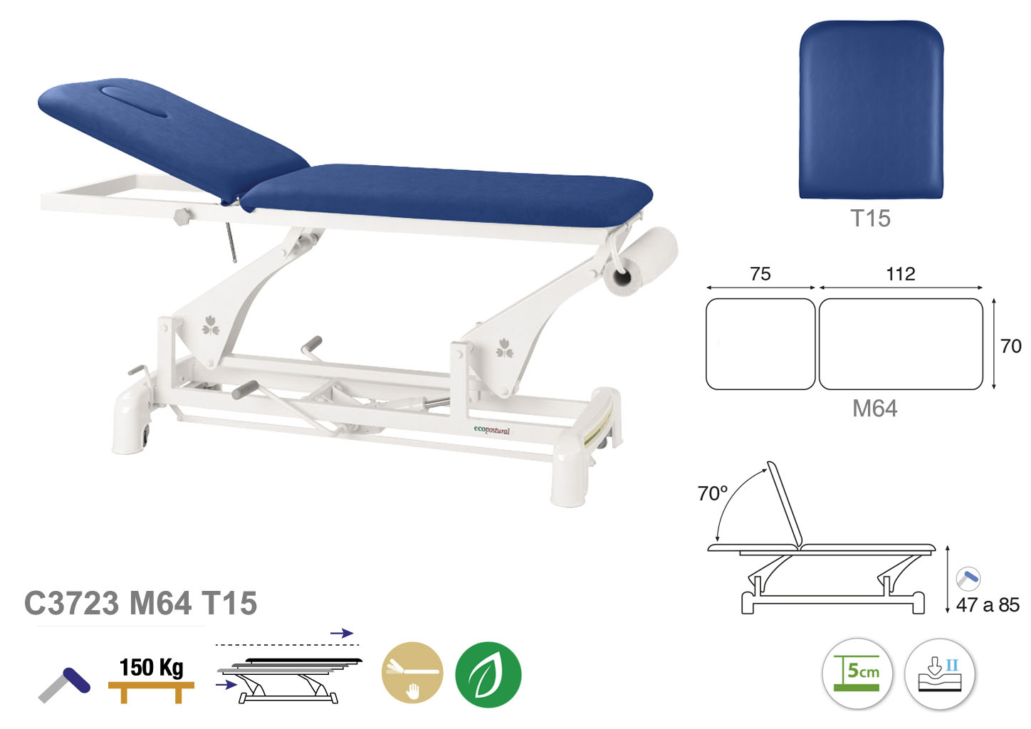 Camilla ecopostural hidráulica de dos cuerpos con estructura de biela blanca. Anchos disponibles: 62 cm y 70 cm. Largo 188 cm. Largo del cabezal: 75 cm, reclinable 70º con elevación manual. Altura regulable entre 47 y 85 cm con desplazamiento lateral. Posee una firmeza media con espuma de 5 cm de grosor. Incluye portarrollos.