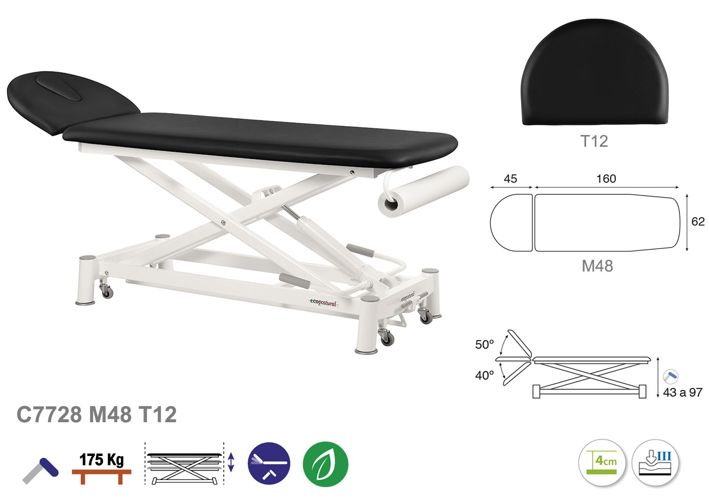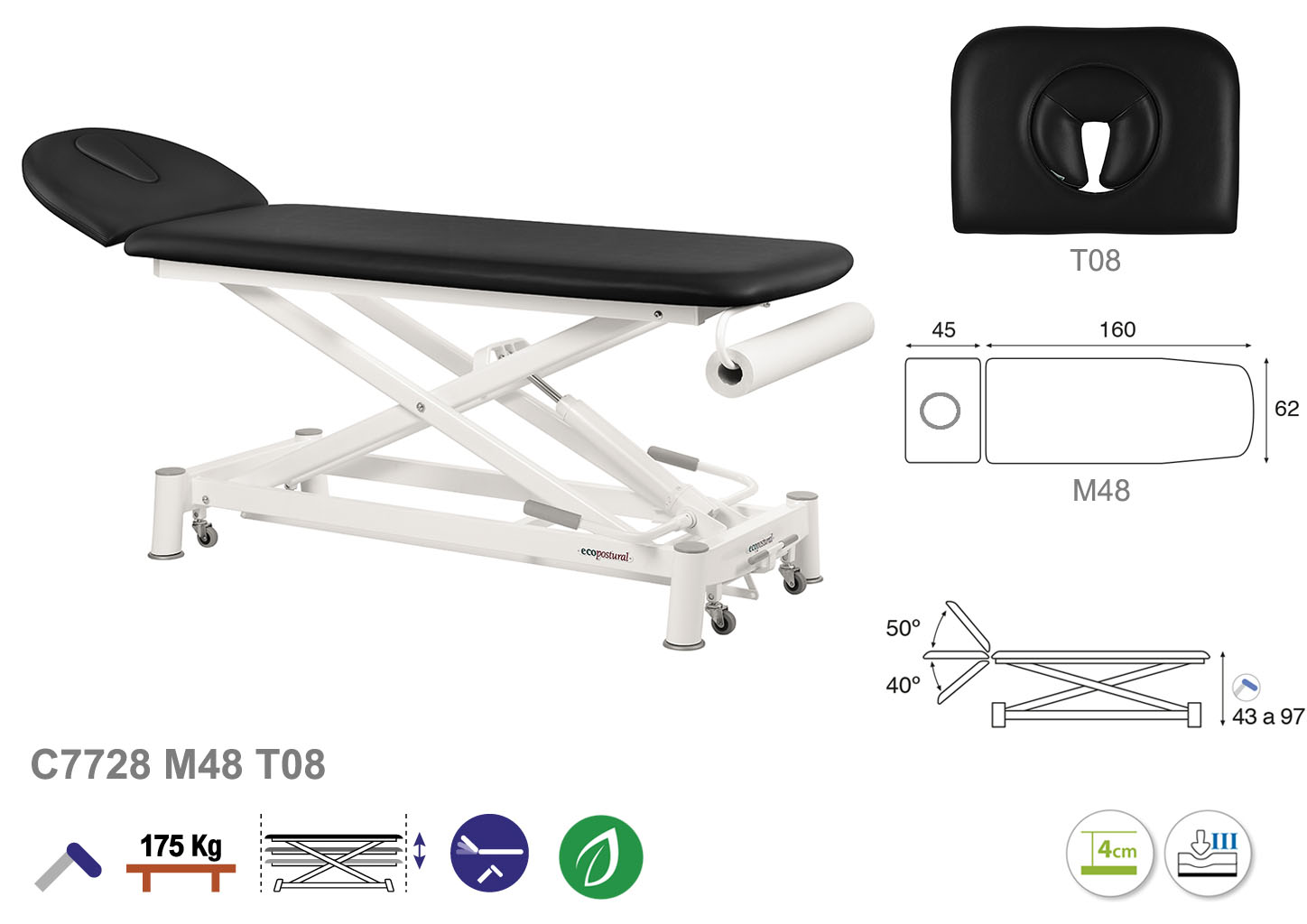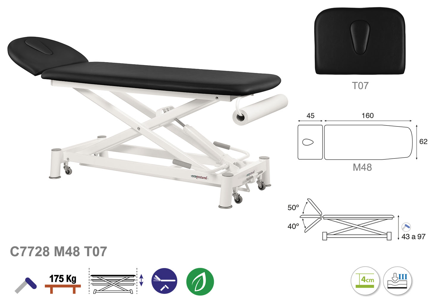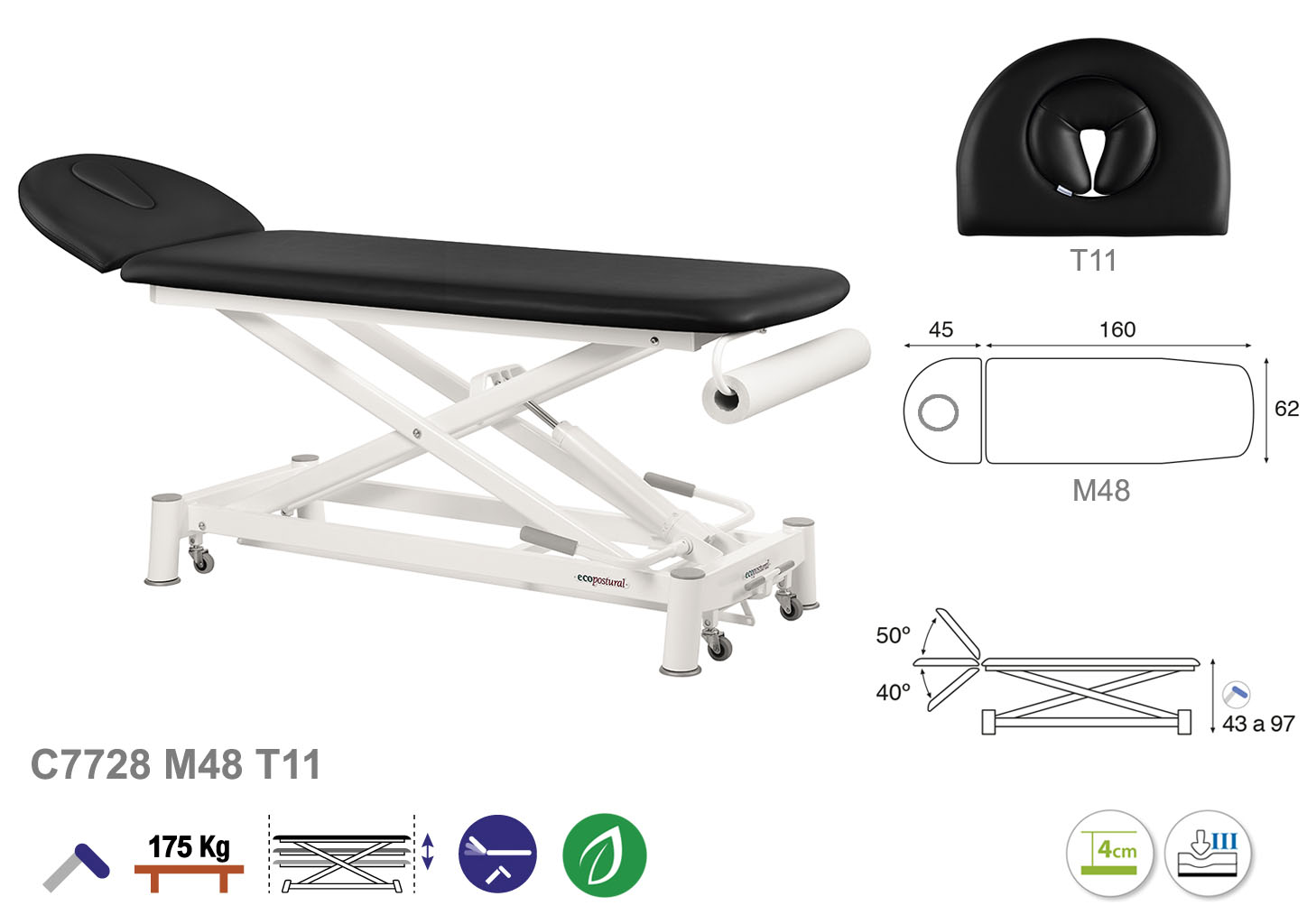 Camilla ecopostural hidráulica de dos cuerpos con estructura de tijera blanca. Ancho: 62 cm. Largo 207 cm. Largo del cabezal: 45 cm, reclinable 50º hacia arriba y 40º hacia abajo. Altura regulable entre 43 y 97 cm. Posee una firmeza semidura y espuma de 4 cm de grosor. Incluye portarrollos.