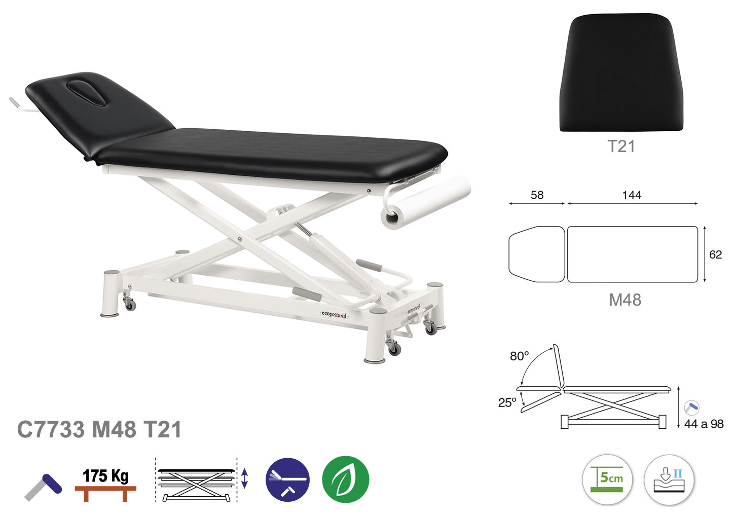 Camilla ecopostural hidráulica de dos cuerpos con estructura de tijera blanca. Ancho: 62 cm. Largo 207 cm. Largo del cabezal: 58 cm, reclinable 80º hacia arriba y 25º hacia abajo. Altura regulable entre 44 y 98 cm. Posee una firmeza media con espuma de 5 cm de grosor. Incluye portarrollos.