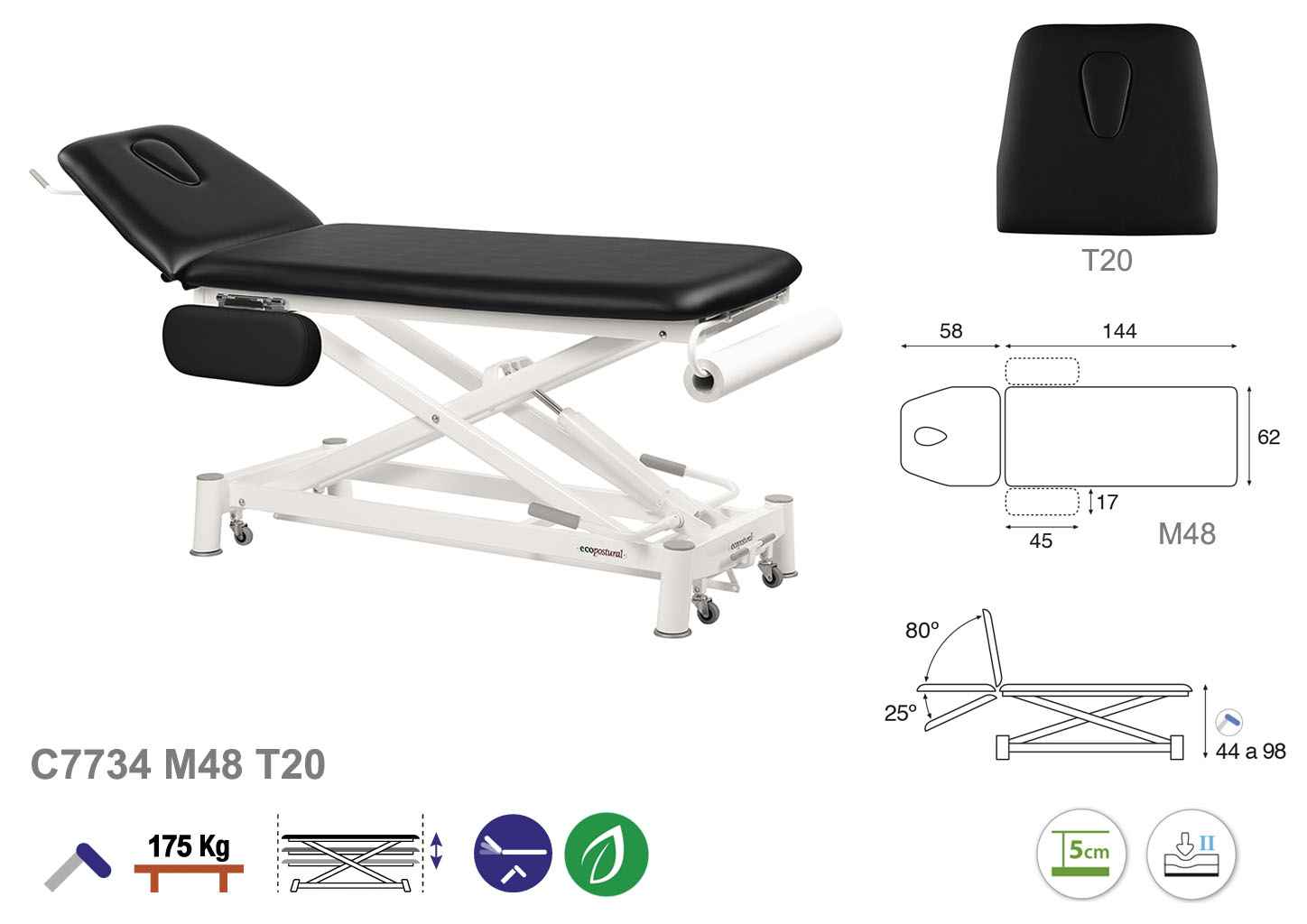 Camilla ecopostural hidráulica de dos cuerpos con estructura de tijera blanca con reposbrazos. Ancho: 62 cm. Largo 207 cm. Largo del cabezal: 58 cm, reclinable 80º hacia arriba y 25º hacia abajo. Altura regulable entre 44 y 98 cm. Posee una firmeza media con espuma de 5 cm de grosor. Incluye portarrollos.