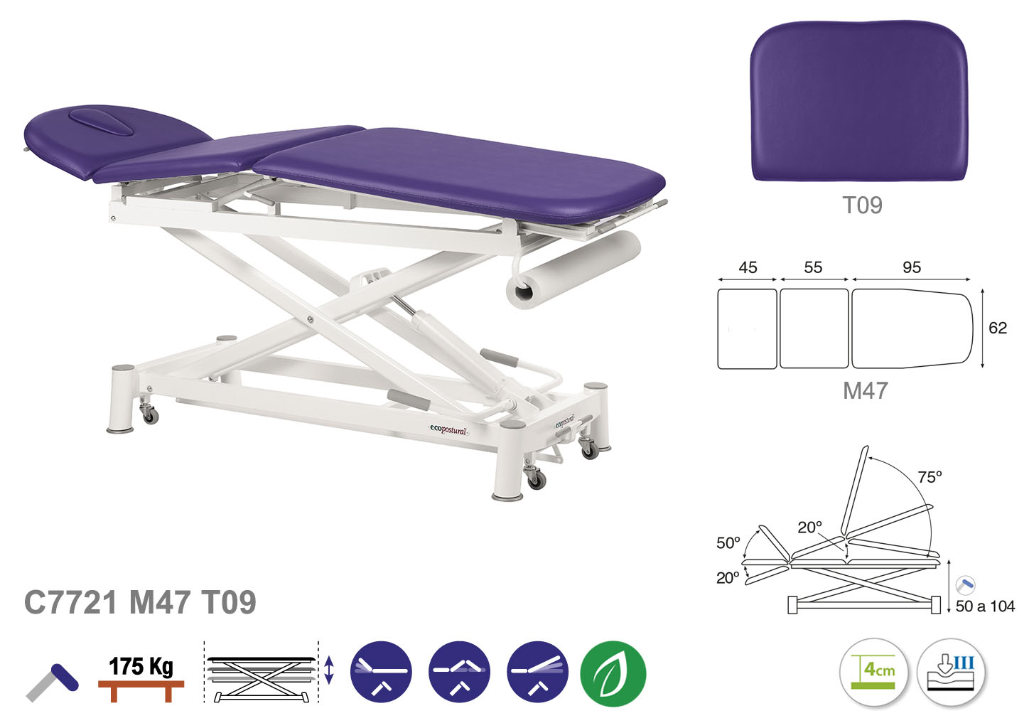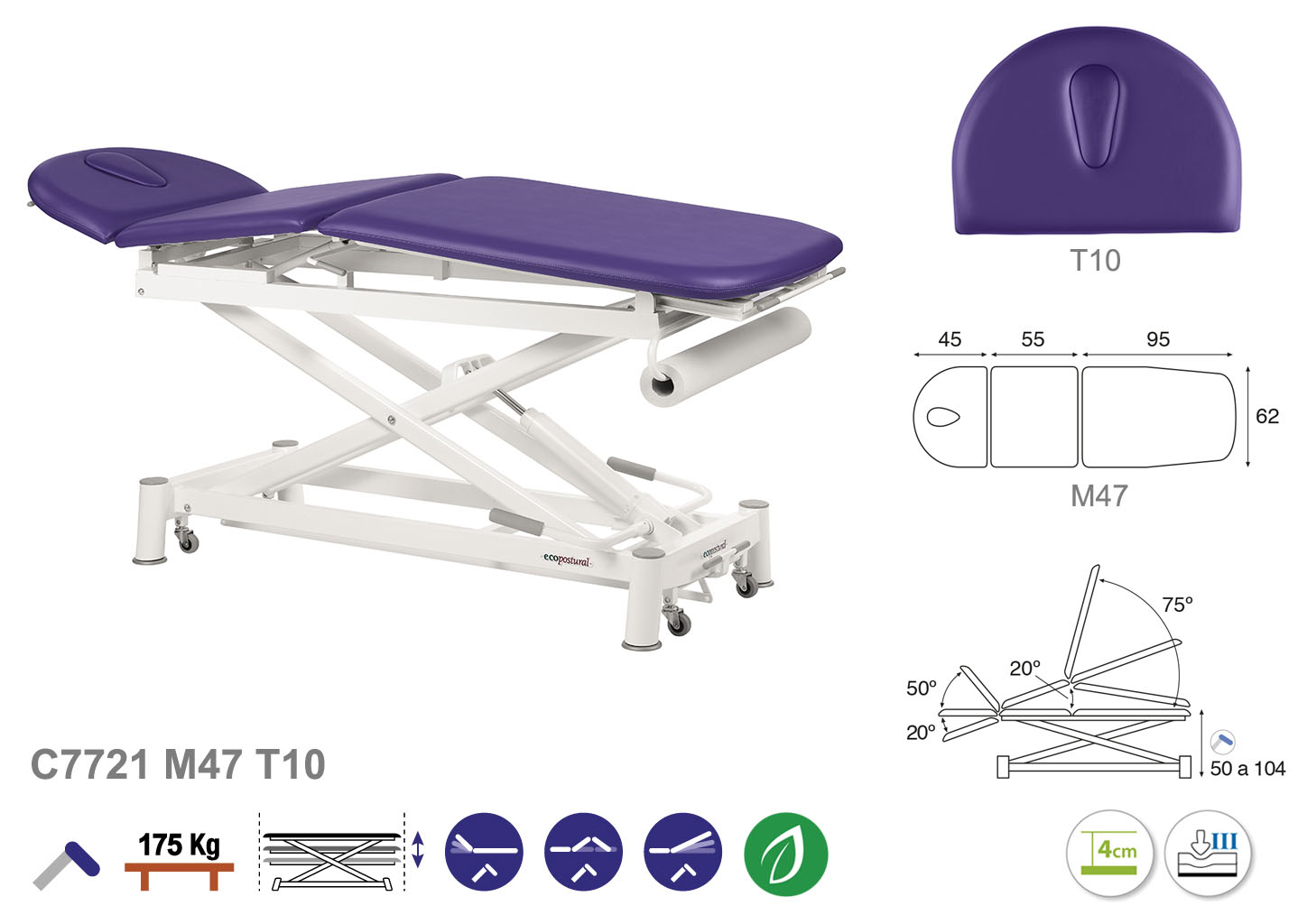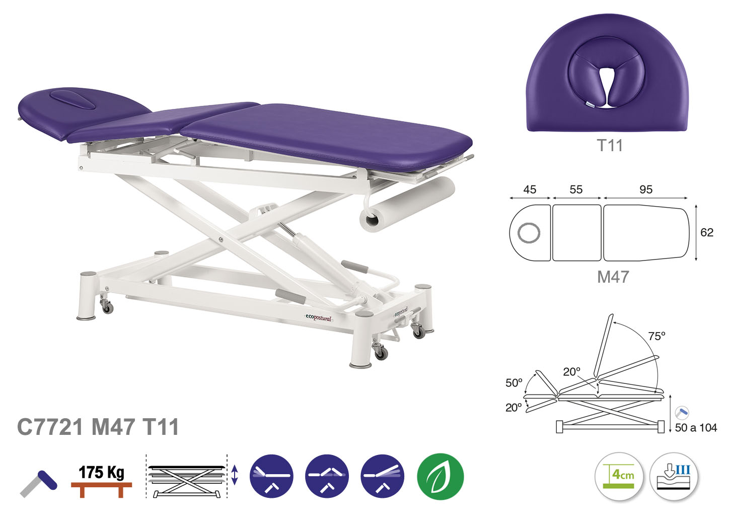 Camilla ecopostural hidráulica de tres cuerpos con estructura de tijera blanca. Ancho: 62 cm. Largo 200 cm. Largo del cabezal: 45 cm, reclinable 50º hacia arriba y 20º hacia abajo. Parte intermedia: reclinable 20º hacia arriba. Parte final, reclinable 75º hacia arriba y hacia abajo. Altura regulable entre 50 y 104 cm. Posee una firmeza semidura y espuma de 4 cm de grosor. Incluye portarrollos.