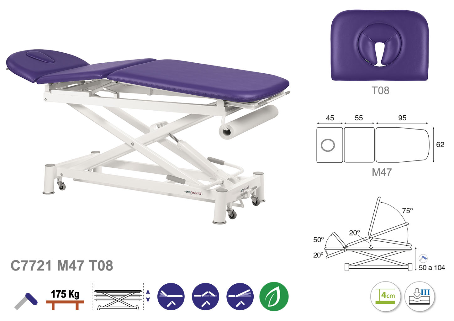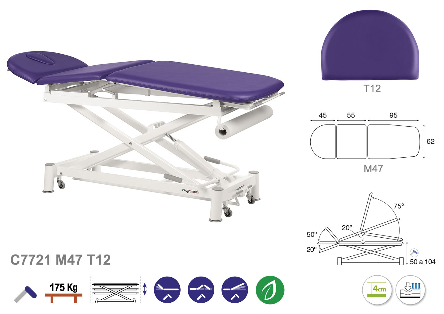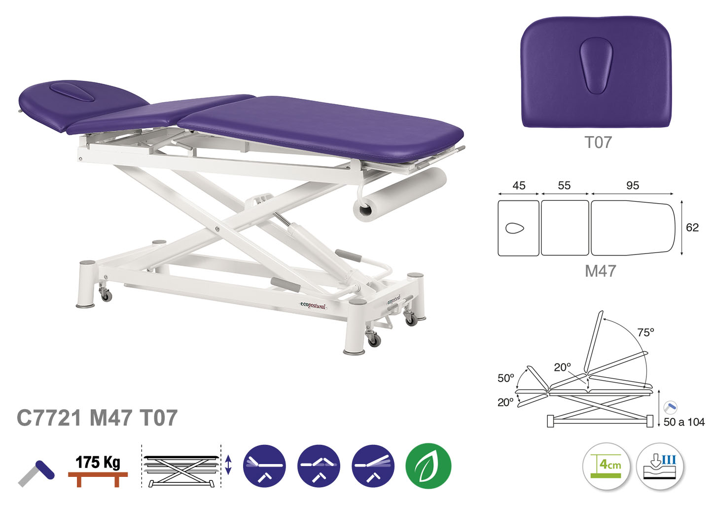 Camilla ecopostural hidráulica de tres cuerpos con estructura de tijera blanca. Ancho: 62 cm. Largo 200 cm. Largo del cabezal: 45 cm, reclinable 50º hacia arriba y 20º hacia abajo. Parte intermedia: reclinable 20º hacia arriba. Parte final, reclinable 75º hacia arriba y hacia abajo. Altura regulable entre 50 y 104 cm. Posee una firmeza semidura y espuma de 4 cm de grosor. Incluye portarrollos.