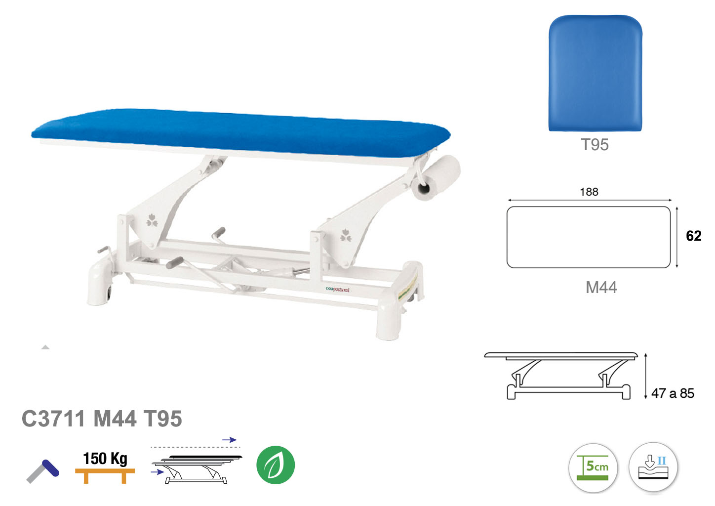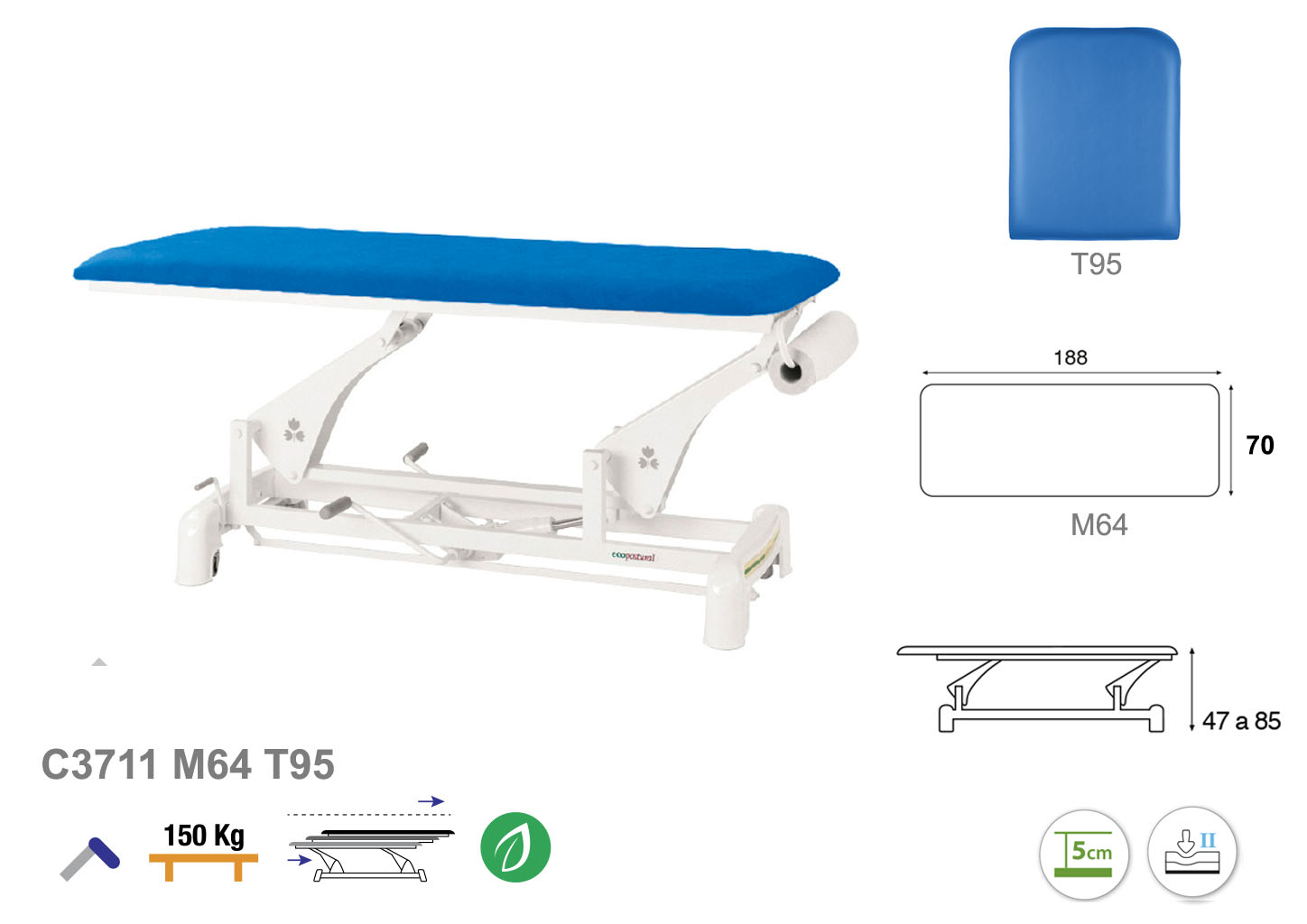 Camilla ecopostural hidráulica de un cuerpo con estructura de biela blanca. Anchos disponibles: 62 cm y 70 cm. Largo 188 cm. Altura regulable entre 47 y 85 cm con desplazamiento lateral. Posee una firmeza media con espuma de 5 cm de grosor. Incluye portarrollos.