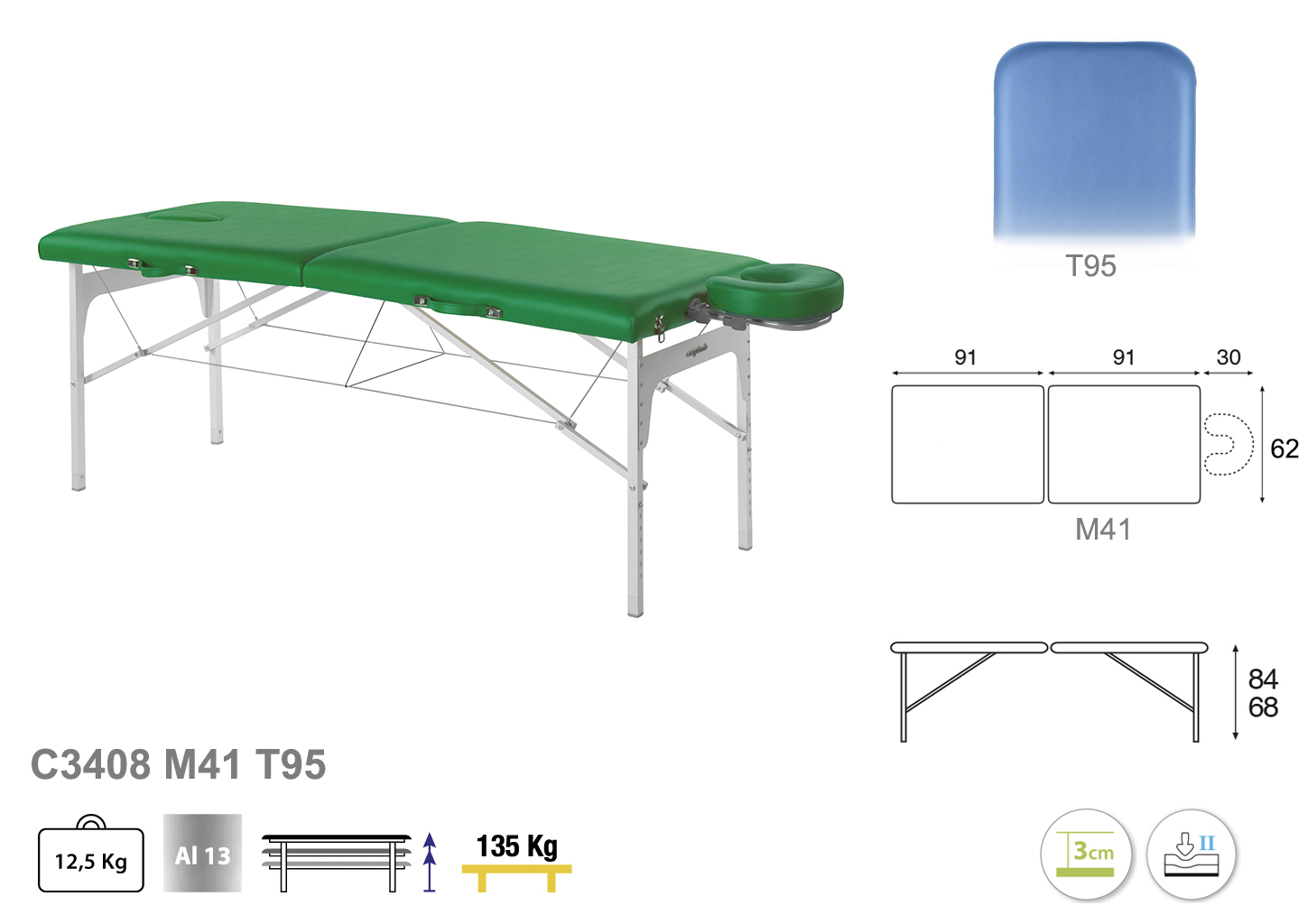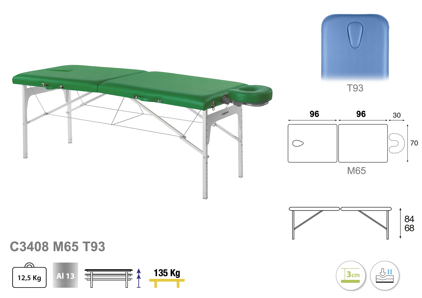 Camilla ecopostural plegable de dos cuerpos con estructura de aluminio con reposacabezas. Anchos disponibles: 62 y 70 cm. Largos disponibles: 182 y 192 cm. Altura variable entre 68 y 84 cm. Posee una firmeza media con espuma de 3 cm de grosor.