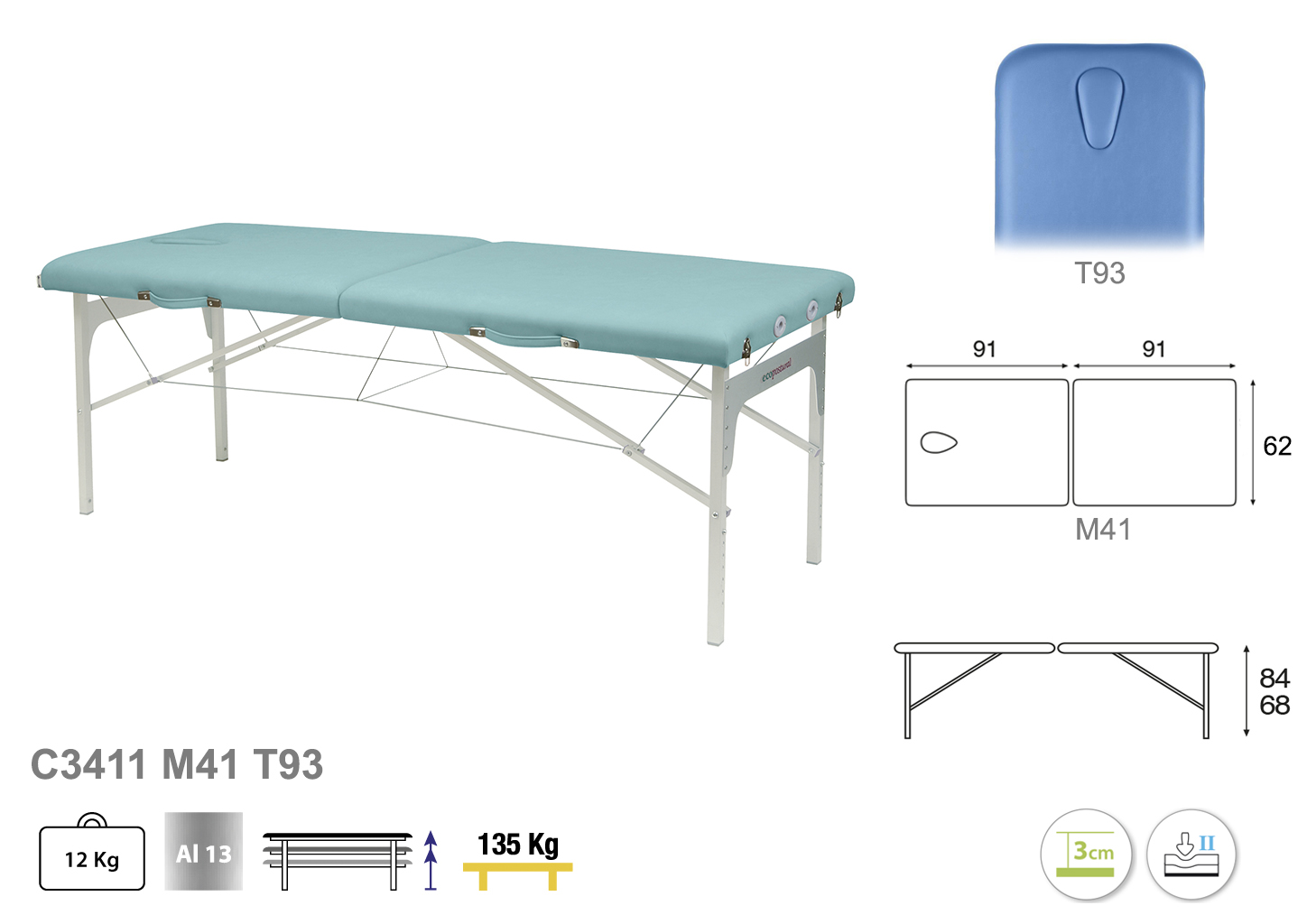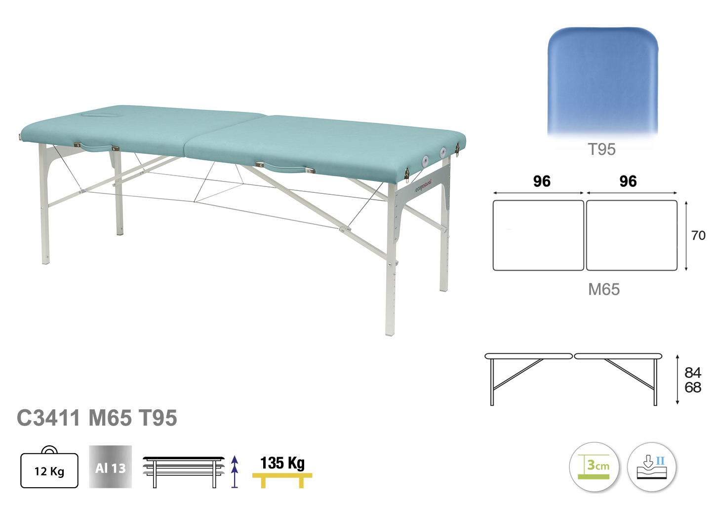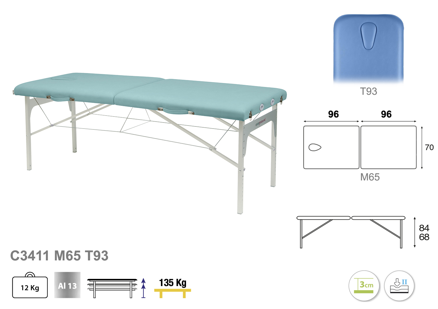 Camilla ecopostural plegable de dos cuerpos con estructura de aluminio. Anchos disponibles: 62 cm y 70 cm. Largos disponibles: 182 cm y 192 cm. Altura regulable entre 68 y 84 cm. Disponible con o sin tapón facial. Posee una firmeza media con espuma de 3 cm de grosor.