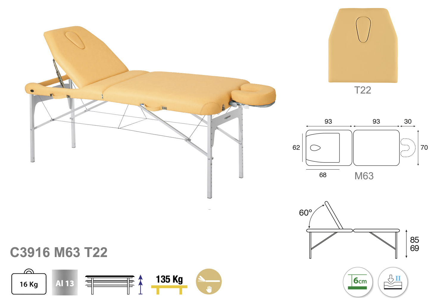 Camilla ecopostural plegable de dos cuerpos con estructura de aluminio. y reposacabezas. Respaldo grande reclinable 60º con tapón facial. Ancho: 70 cm. Largo: 186 cm. Altura regulable entre 69 y 85 cm. Posee una firmeza media con espuma de 6 cm de grosor.