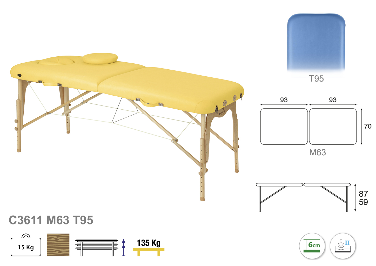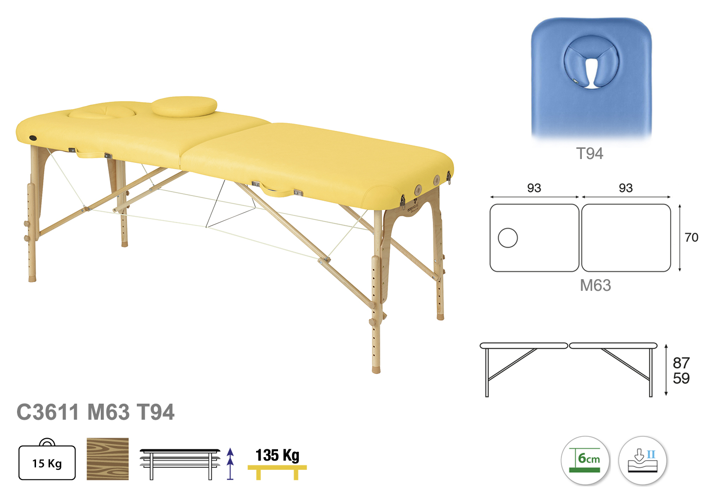Camilla ecopostural plegable de dos cuerpos con estructura de madera. Ancho: 70 cm. Largo: 186 cm. Altura regulable entre 59 y 87 cm. Disponible con o sin tapón facial. Posee una firmeza media con espuma de 6 cm de grosor.