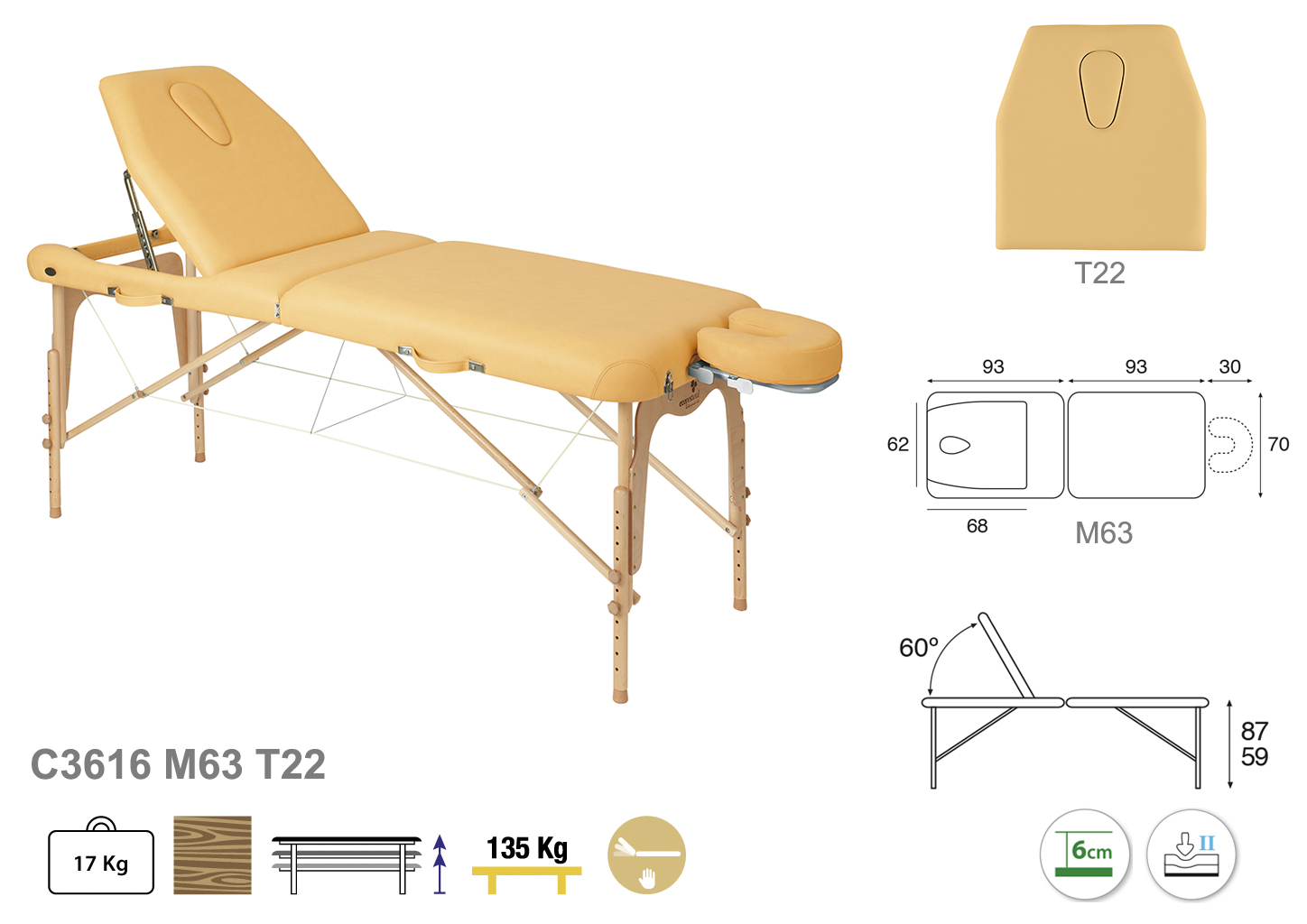 Camilla ecopostural plegable de dos cuerpos con estructura de madera con reposacabezas. Respaldo pequeño reclinable 60º con tapón facial. Ancho del respaldo: 62 cm. Ancho de la camilla: 70 cm. Largo 186 cm. Altura variable entre 59 y 87 cm. Posee una firmeza media con espuma de 6 cm de grosor.